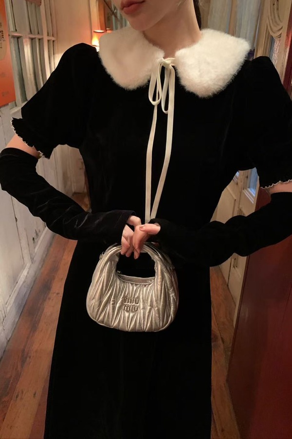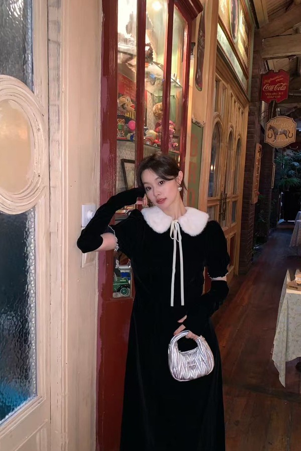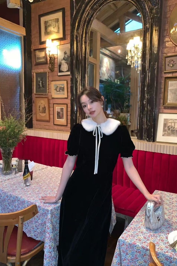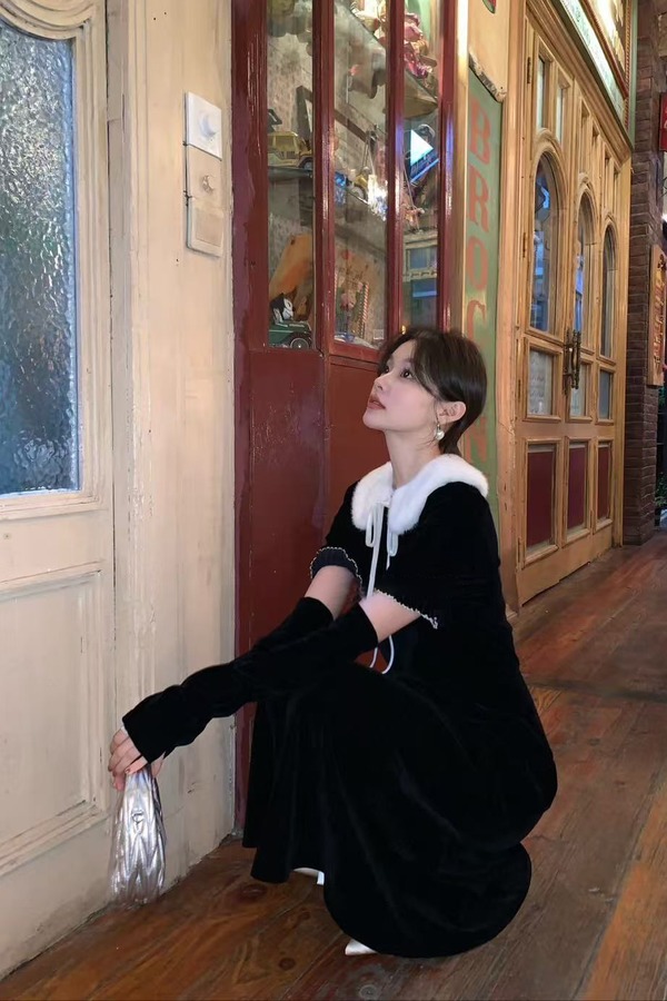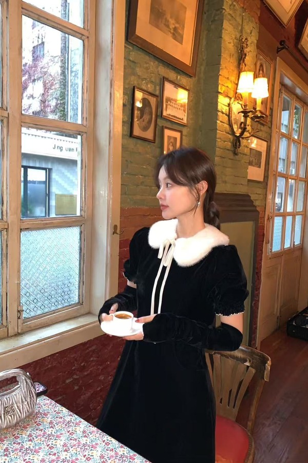 SIA SAYLOR 法式千金礼服袖套毛领丝绒连衣裙 21984