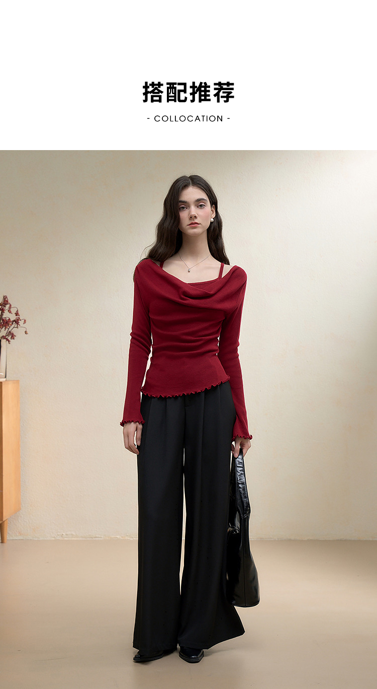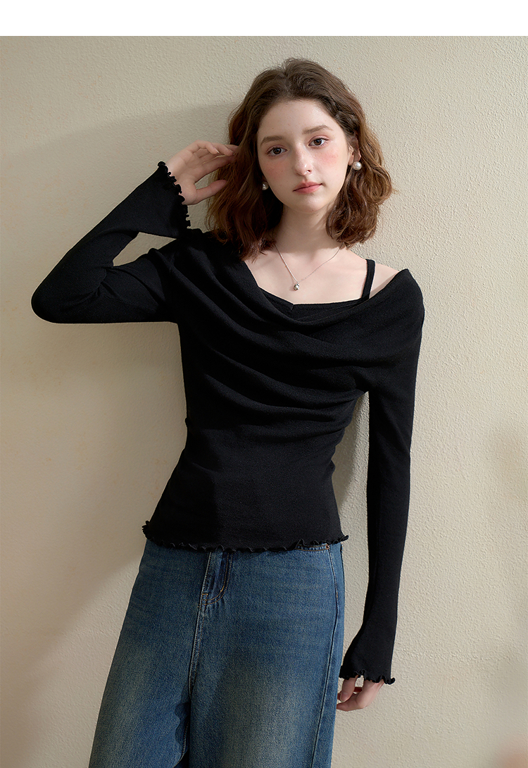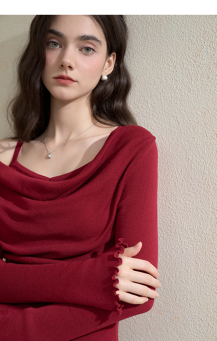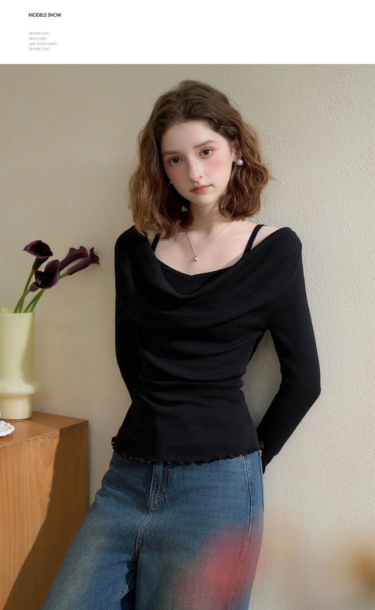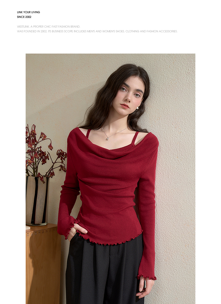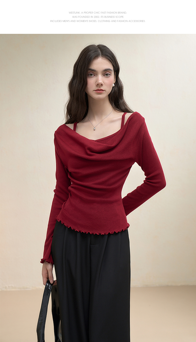 西遇韩系气质荡领假两件长袖针织衫女秋季高级感修身显瘦上衣V3051228
