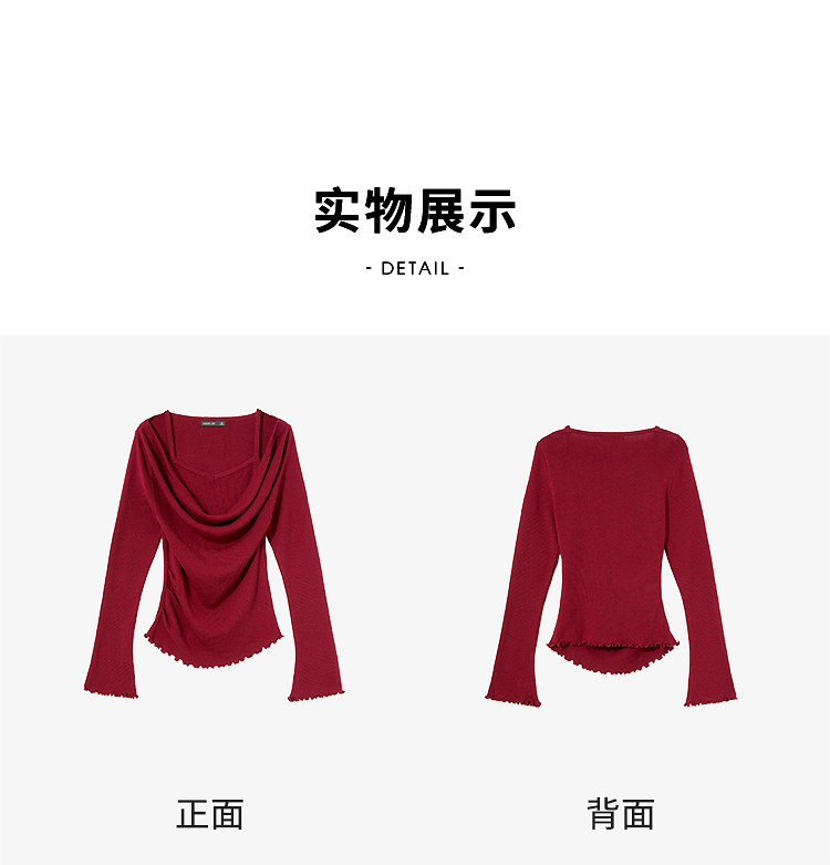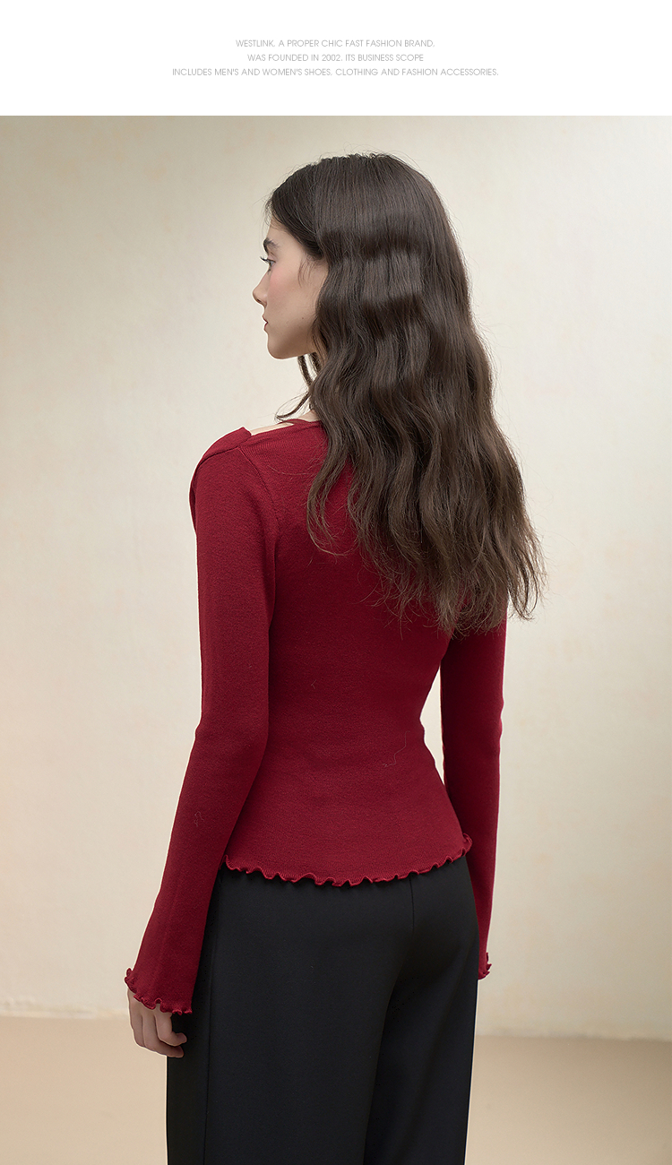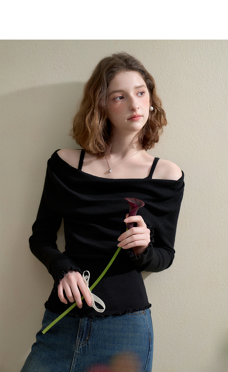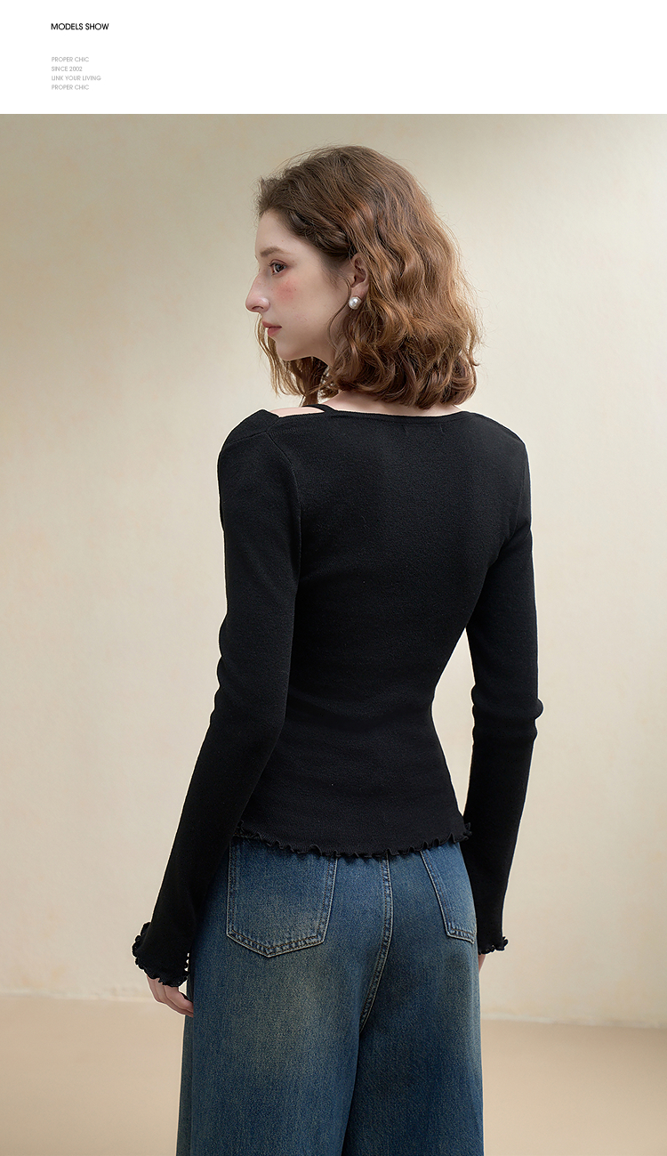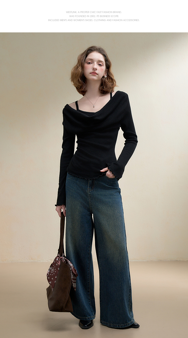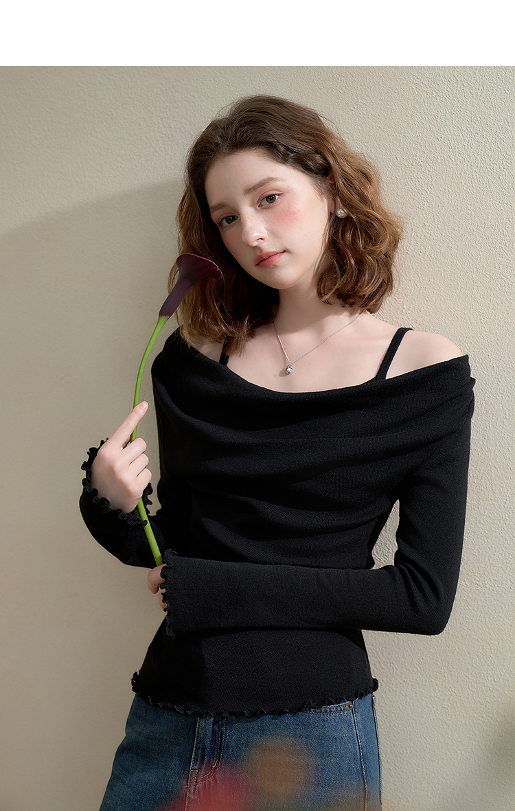 西遇韩系气质荡领假两件长袖针织衫女秋季高级感修身显瘦上衣V3051228
