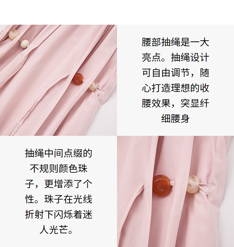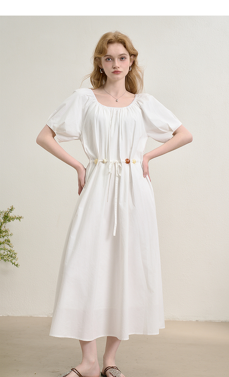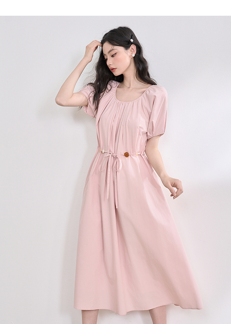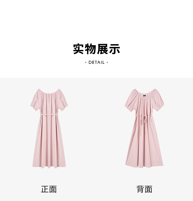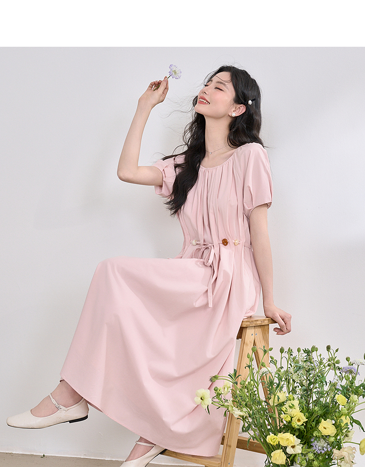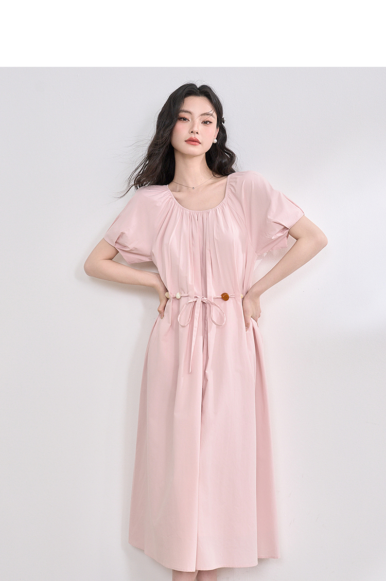 桃花拂面温柔气质泡泡袖连衣裙女春夏彩色串珠收腰长裙V0850570