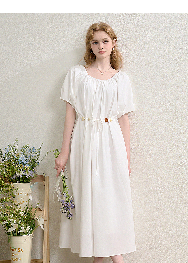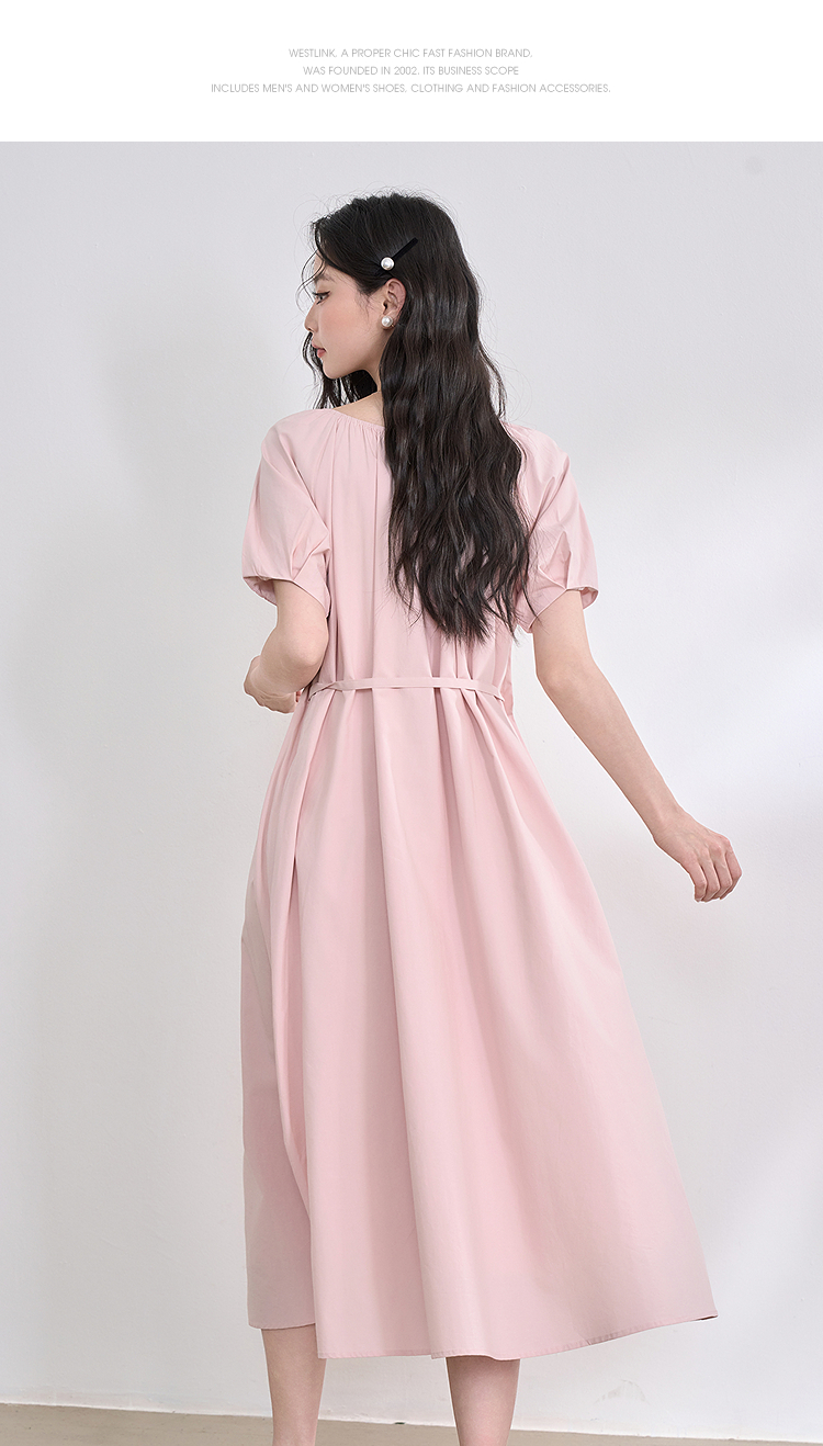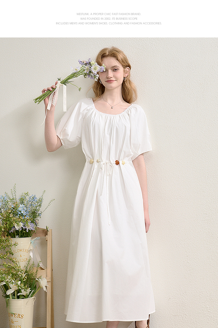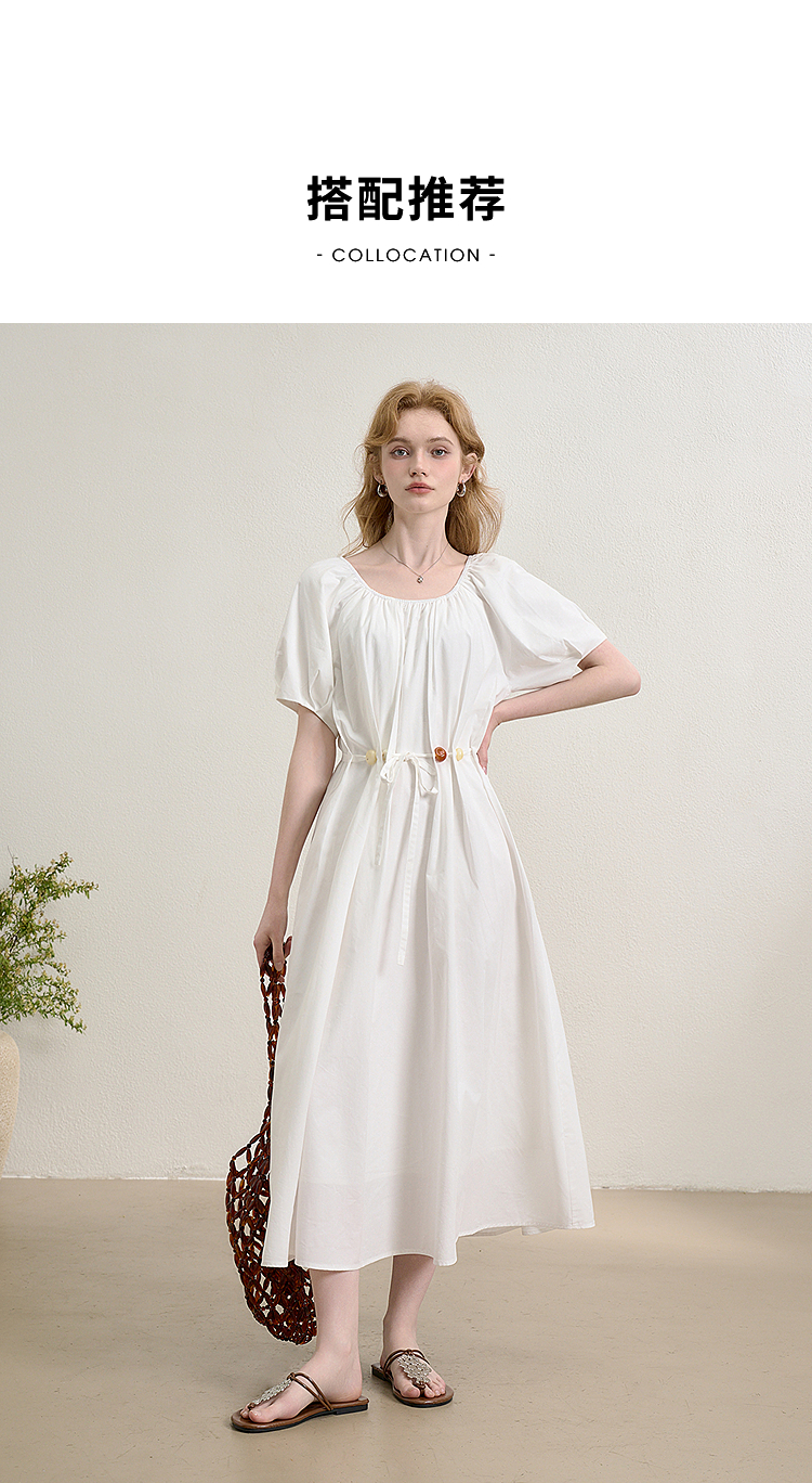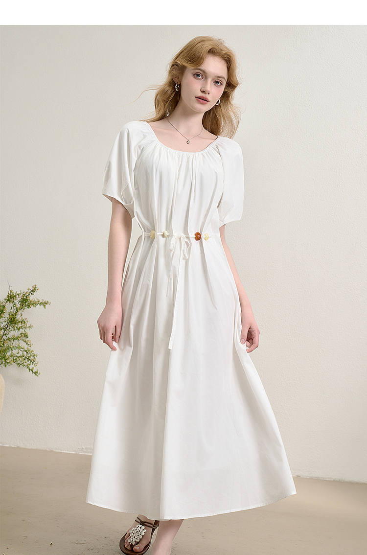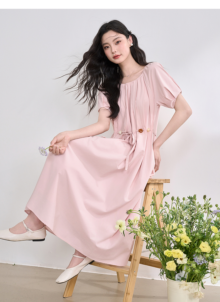 桃花拂面温柔气质泡泡袖连衣裙女春夏彩色串珠收腰长裙V0850570
