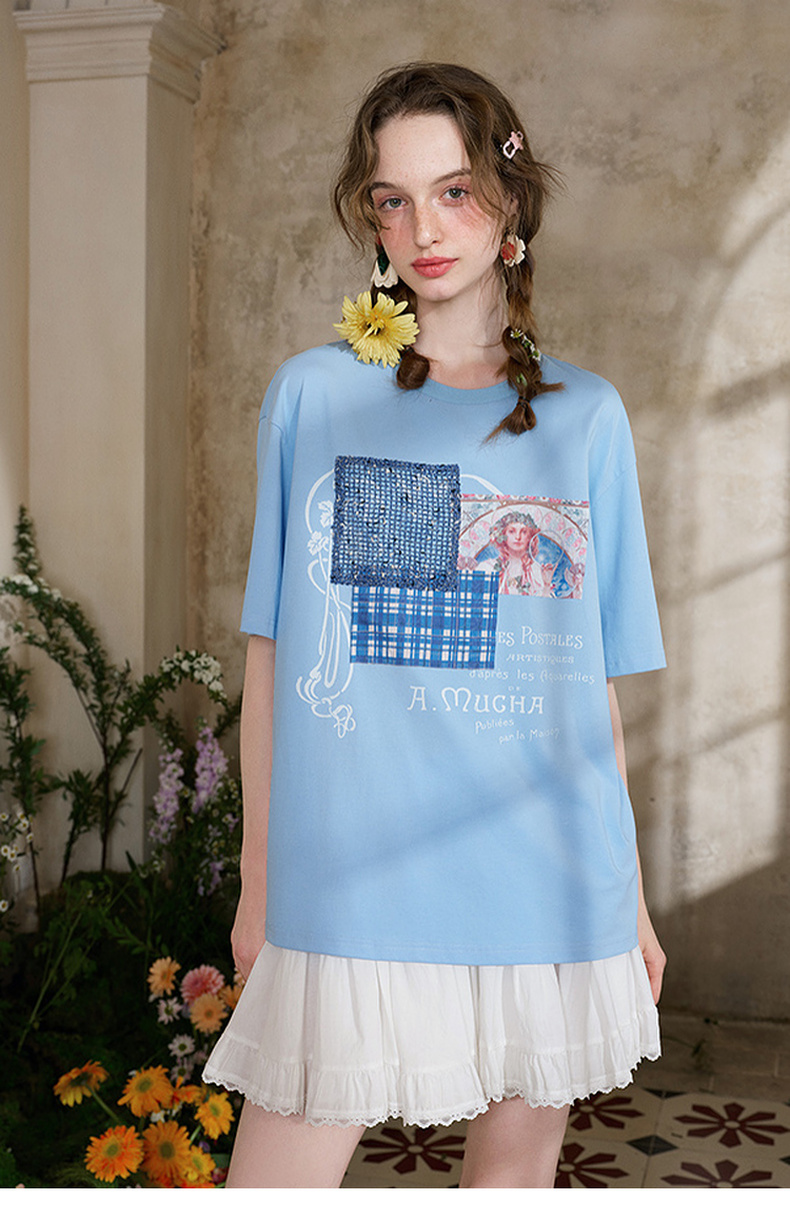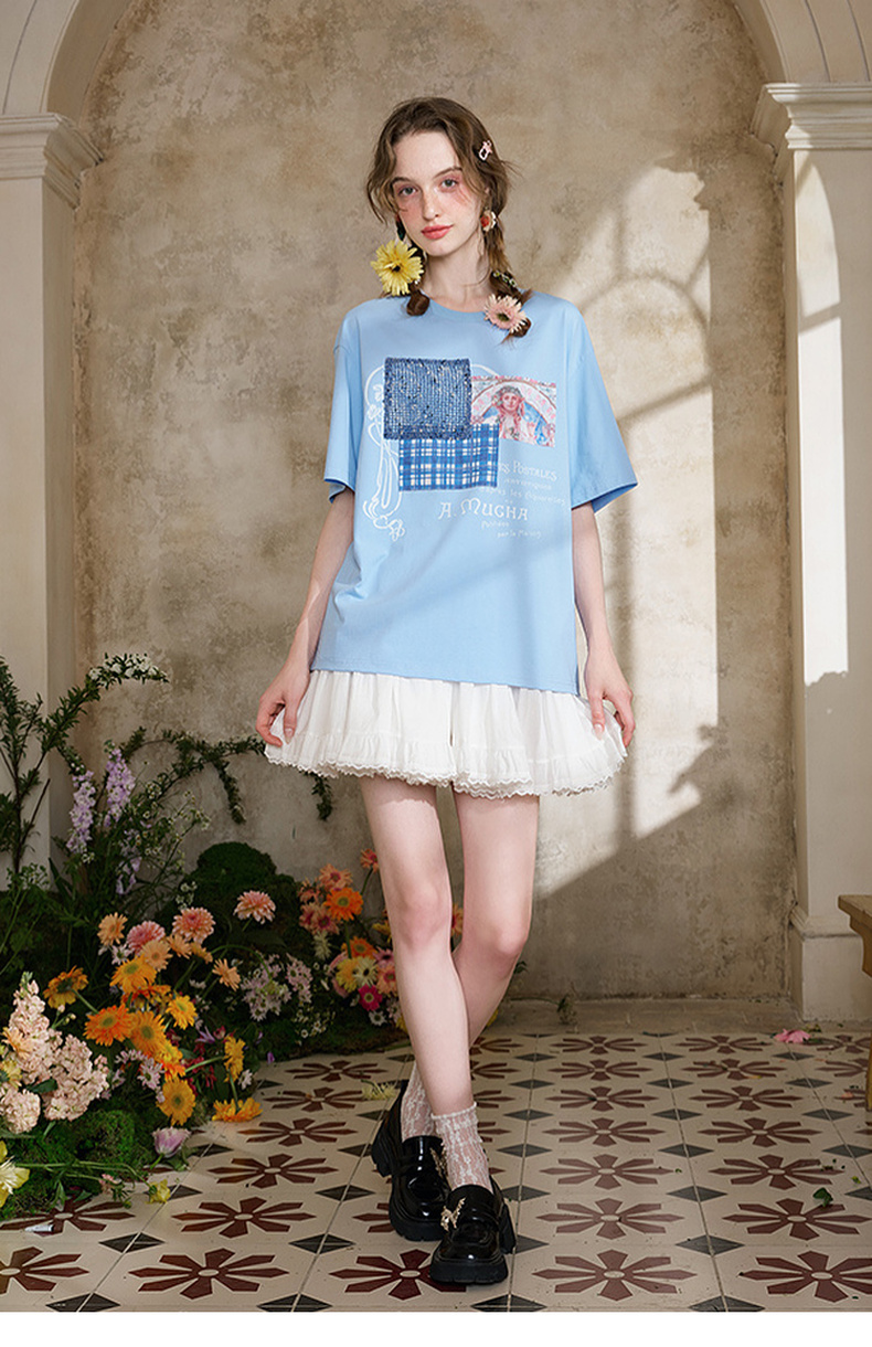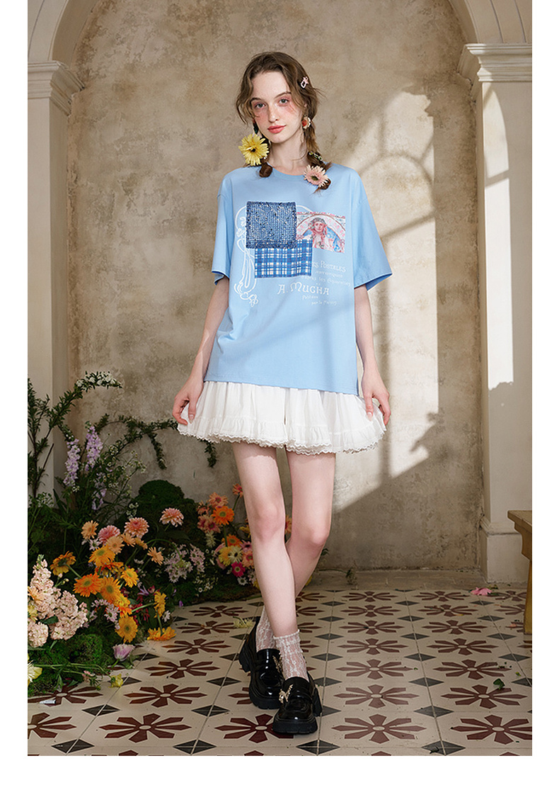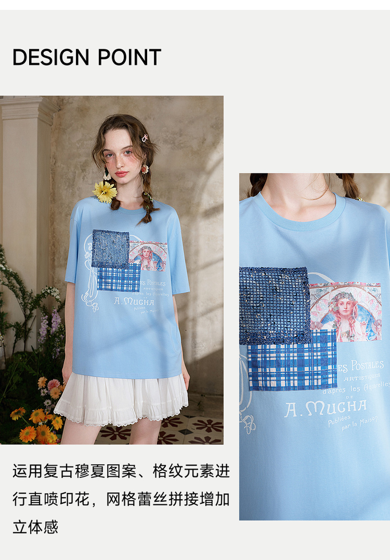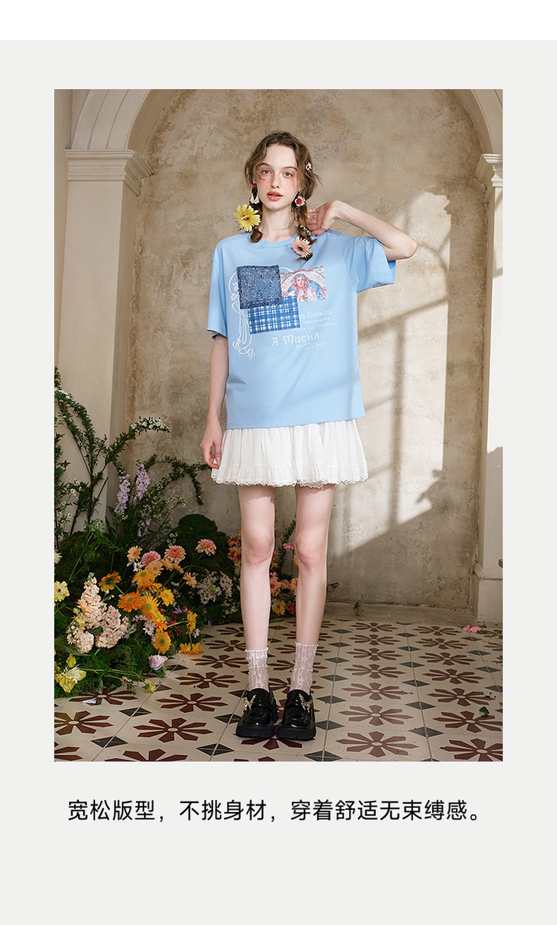 两三事 叠影画境 2025夏季新款小清新蕾丝拼接印花短袖t恤女宽松