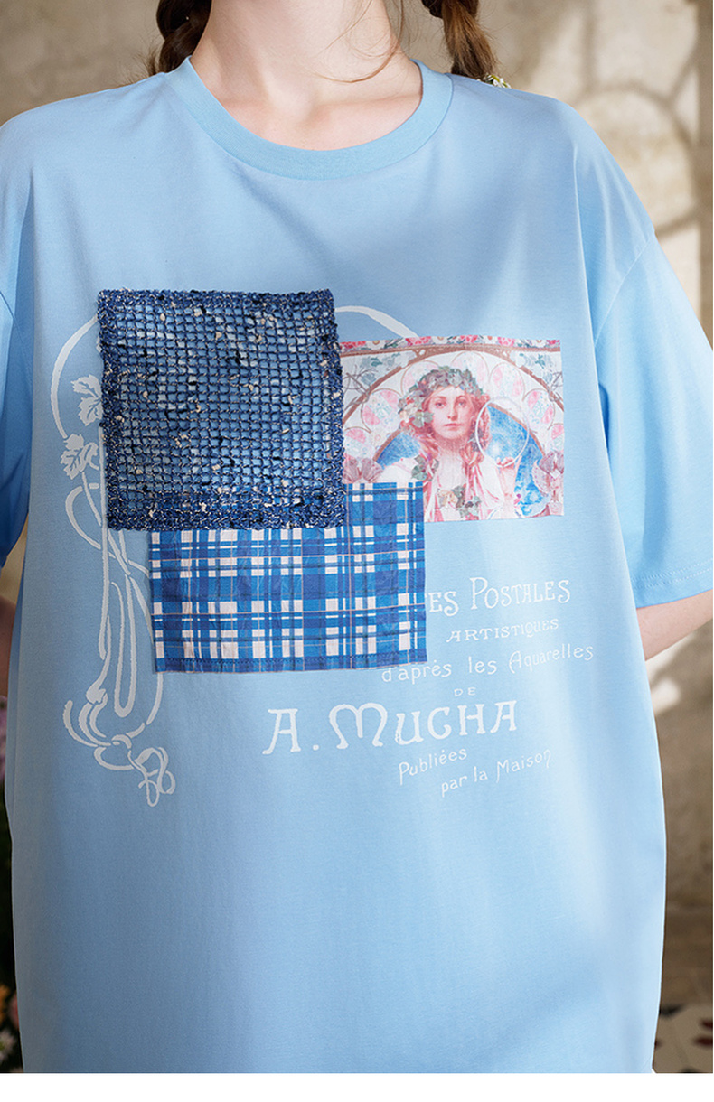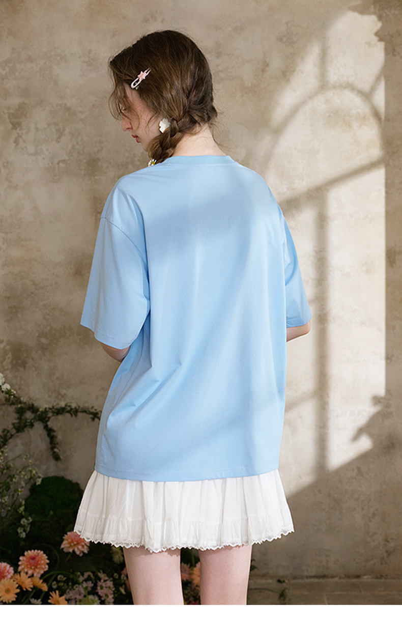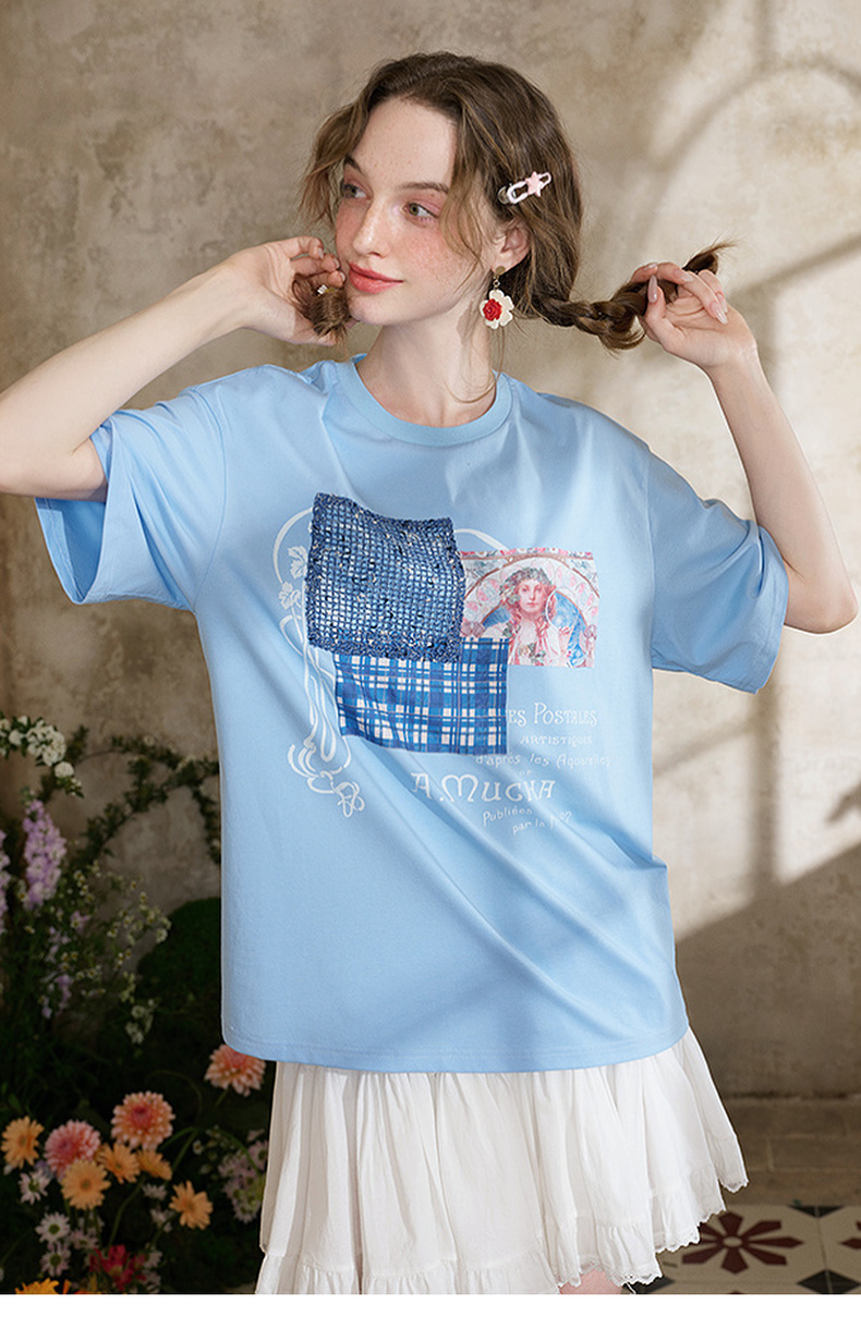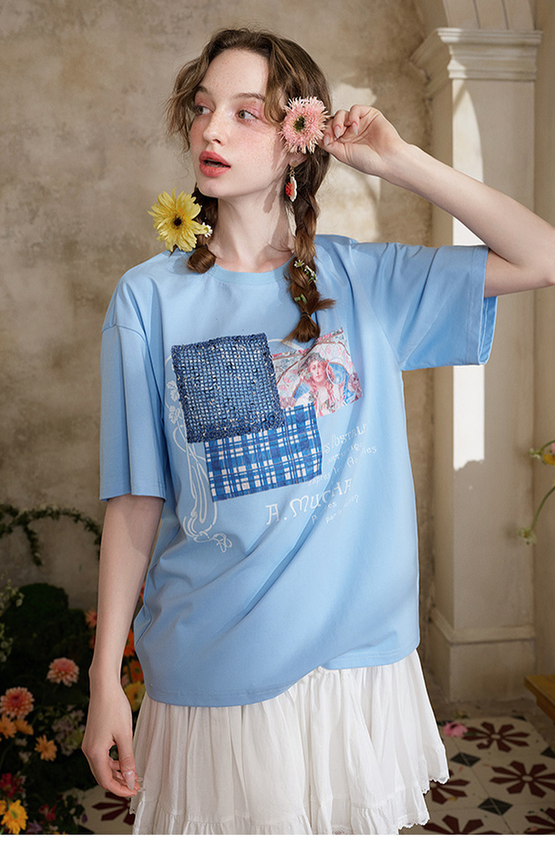 两三事 叠影画境 2025夏季新款小清新蕾丝拼接印花短袖t恤女宽松