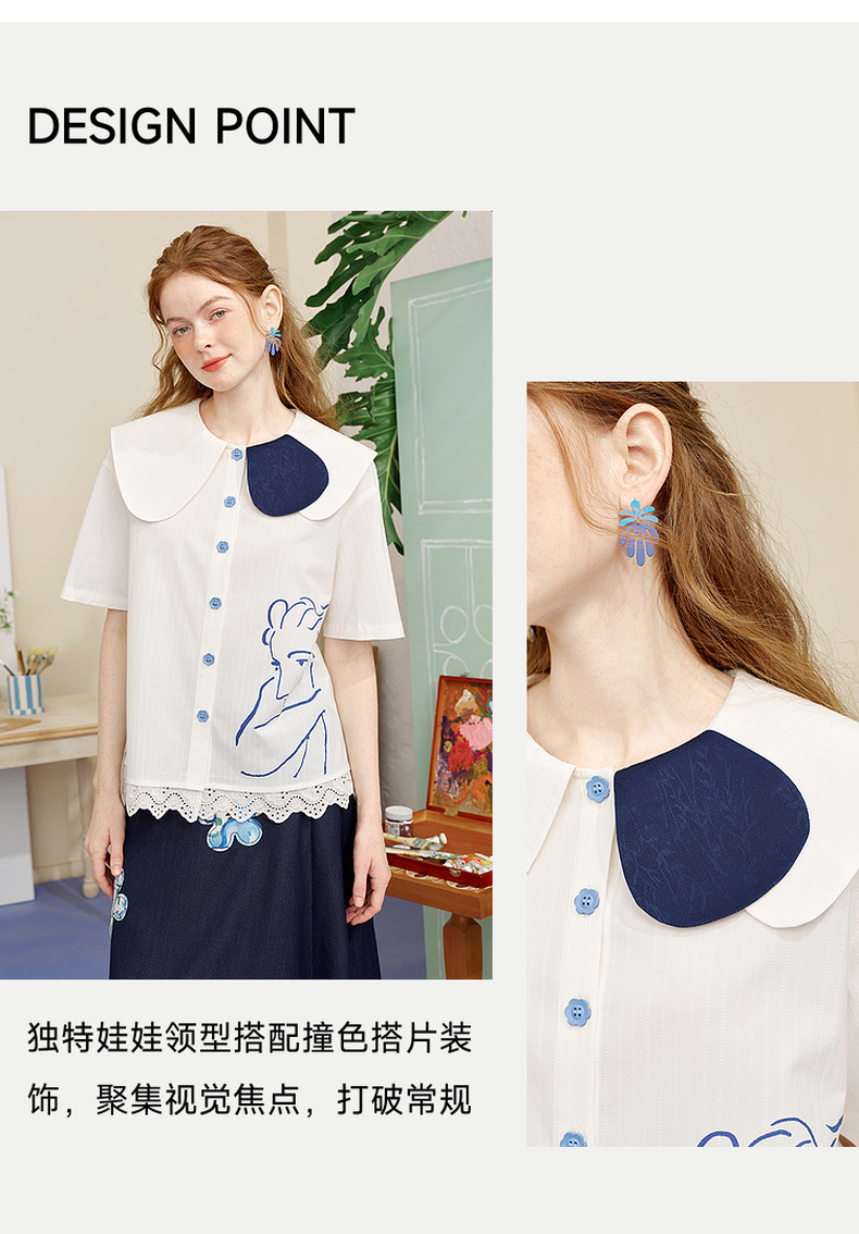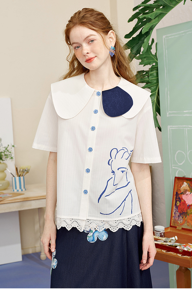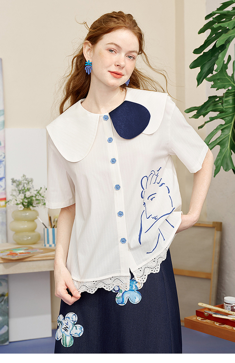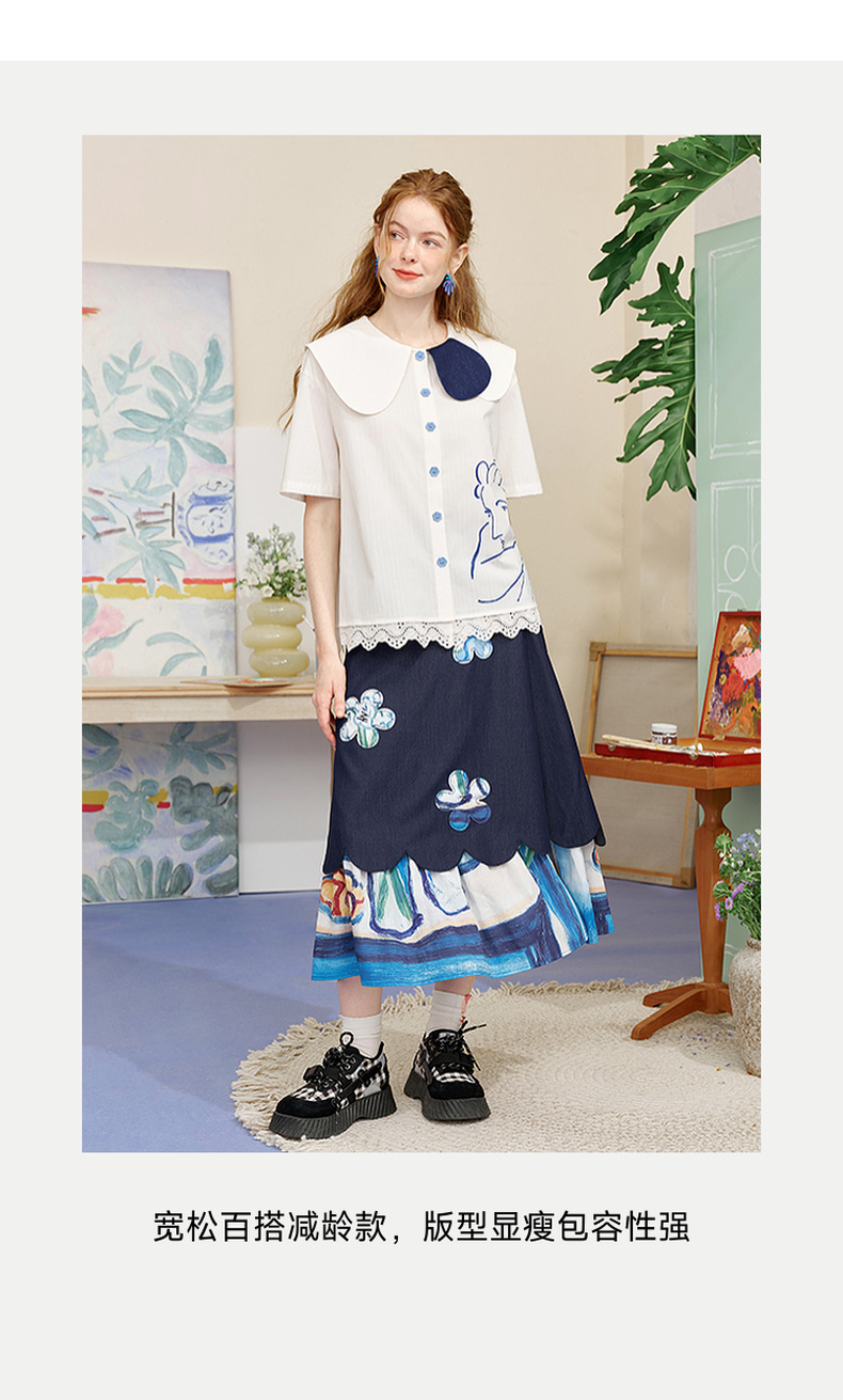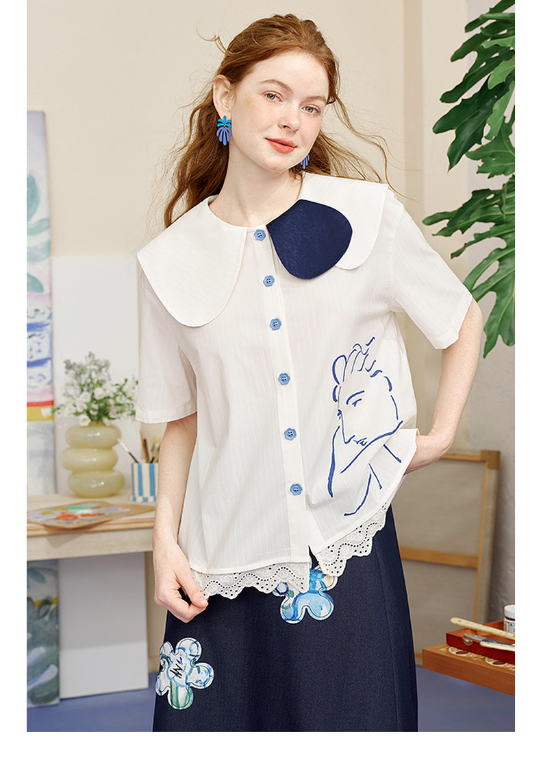 两三事内心独白2025夏季新款文艺风拼色娃娃领印花短袖衬衫女宽松