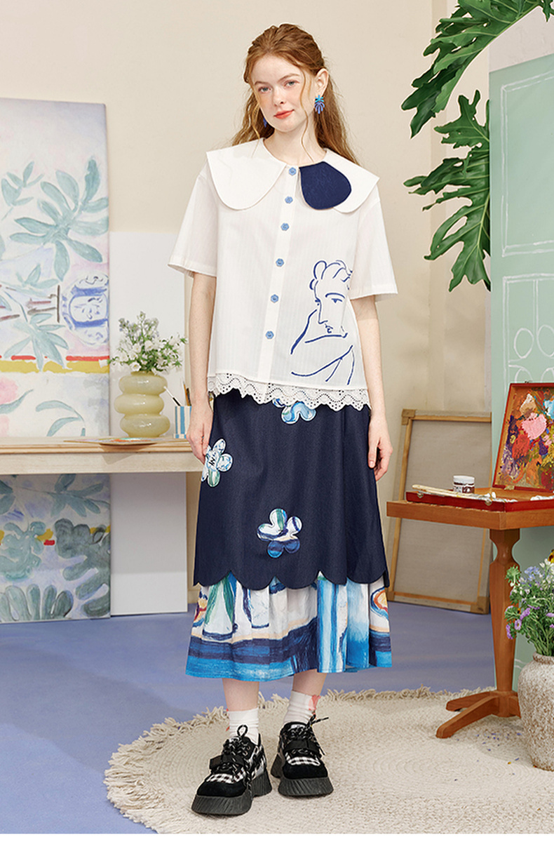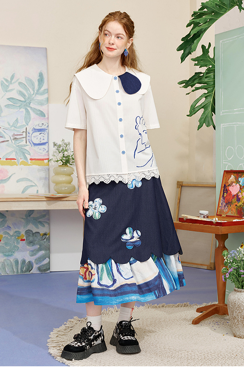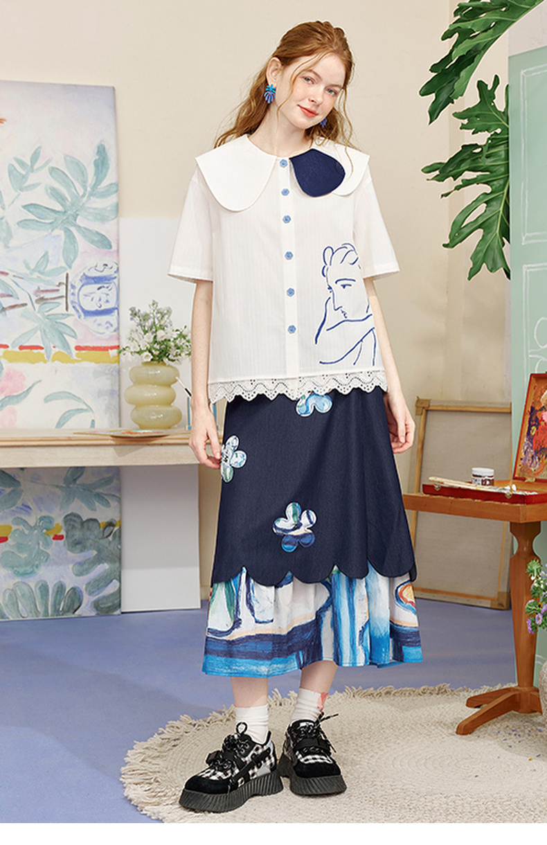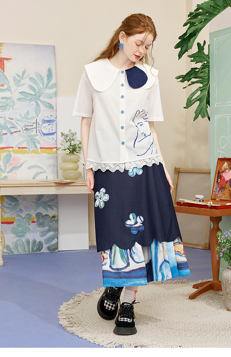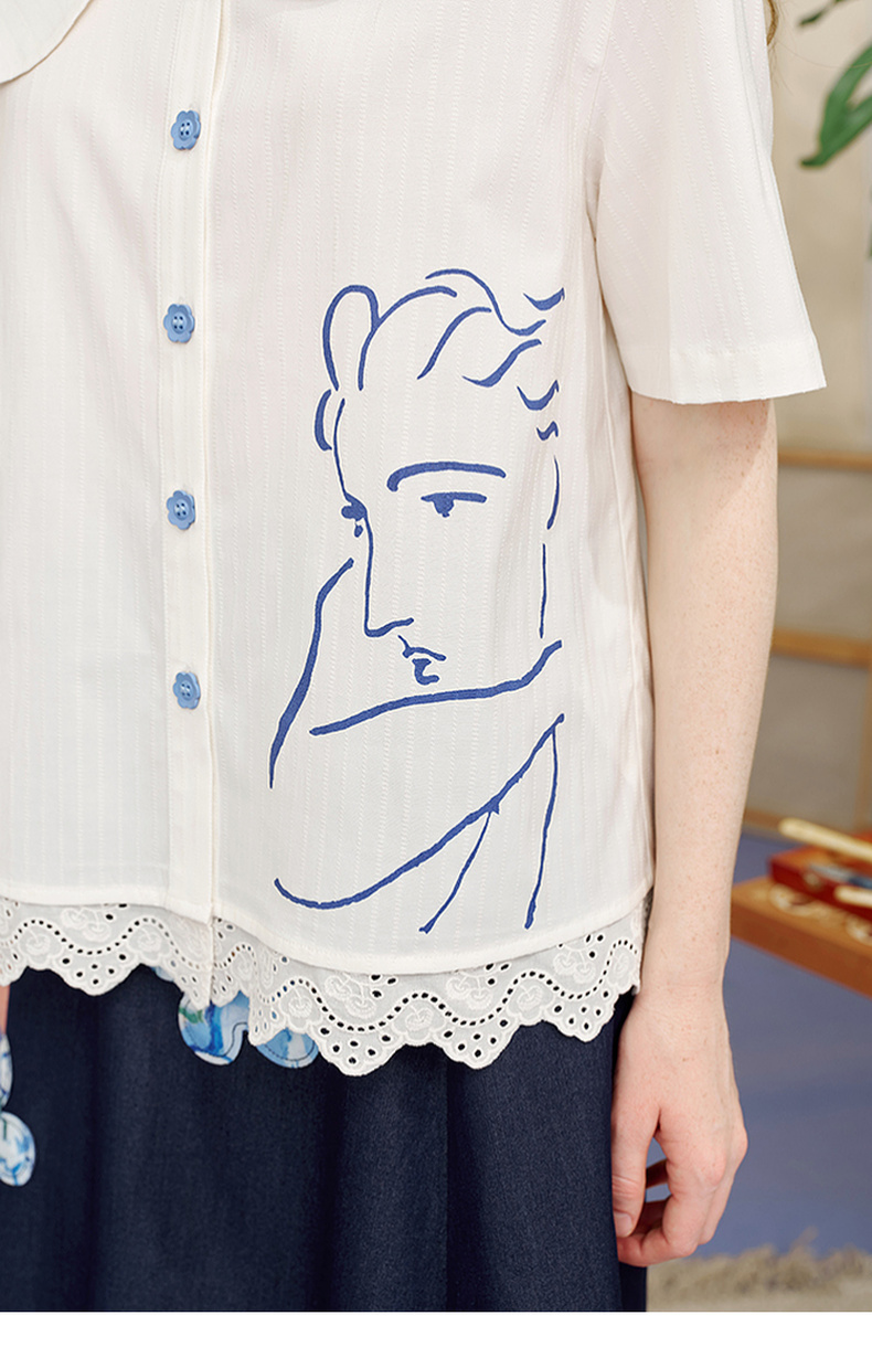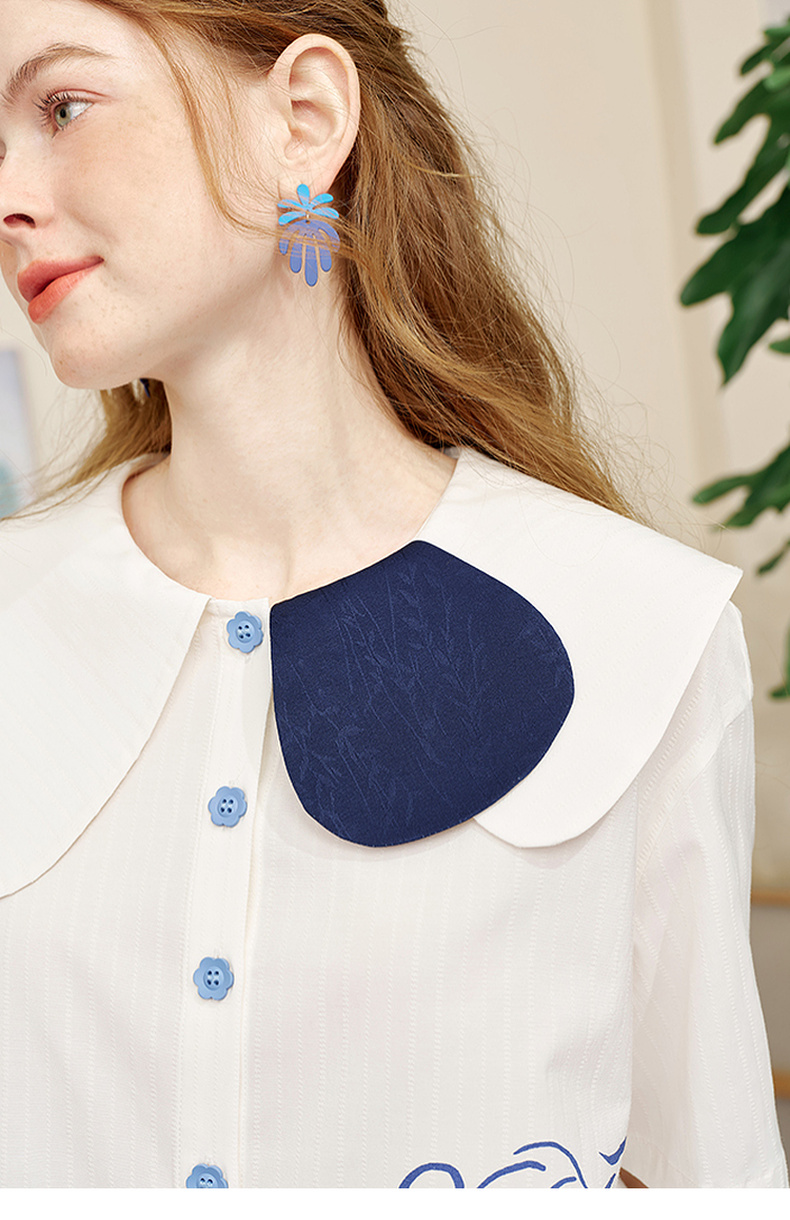 两三事内心独白2025夏季新款文艺风拼色娃娃领印花短袖衬衫女宽松