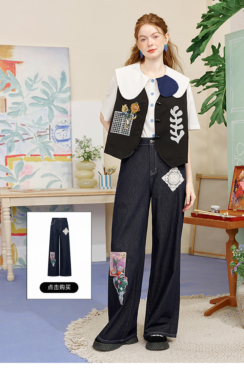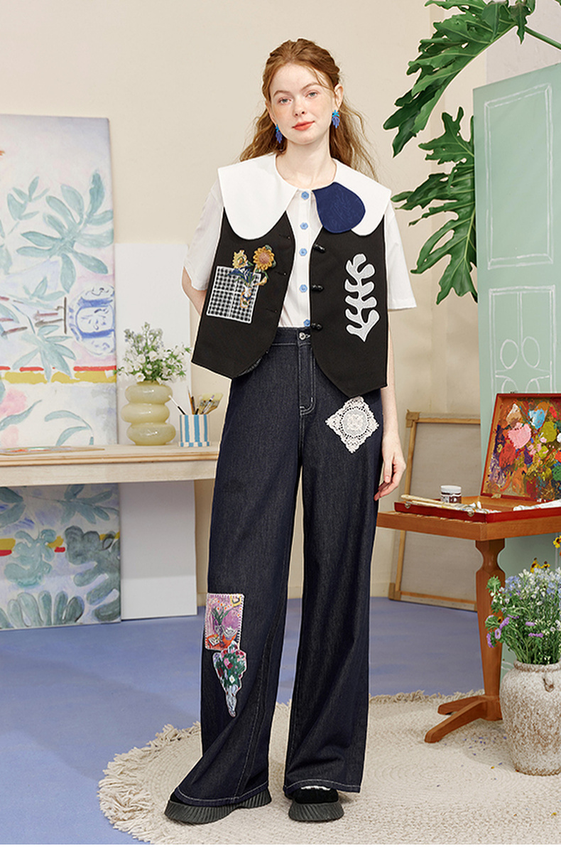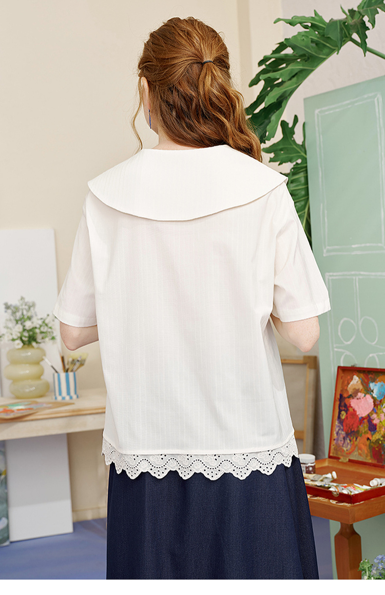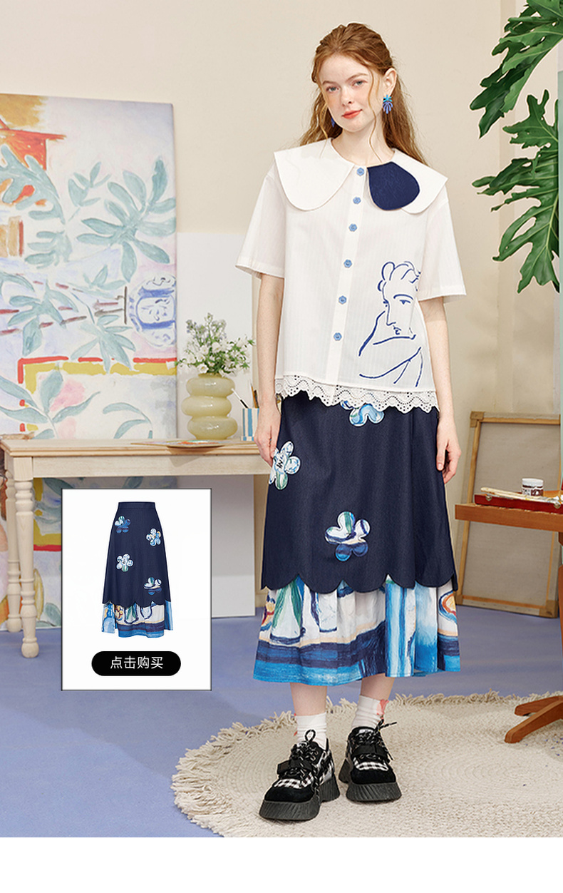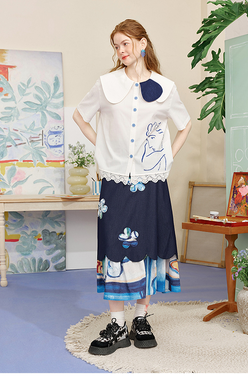 两三事内心独白2025夏季新款文艺风拼色娃娃领印花短袖衬衫女宽松