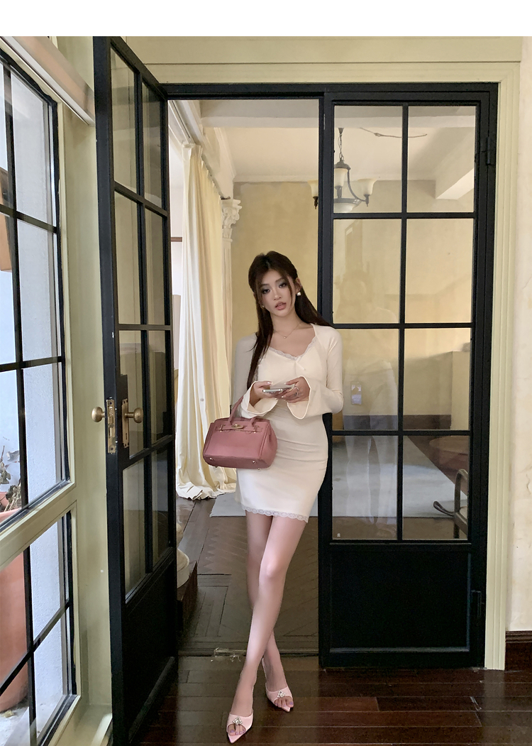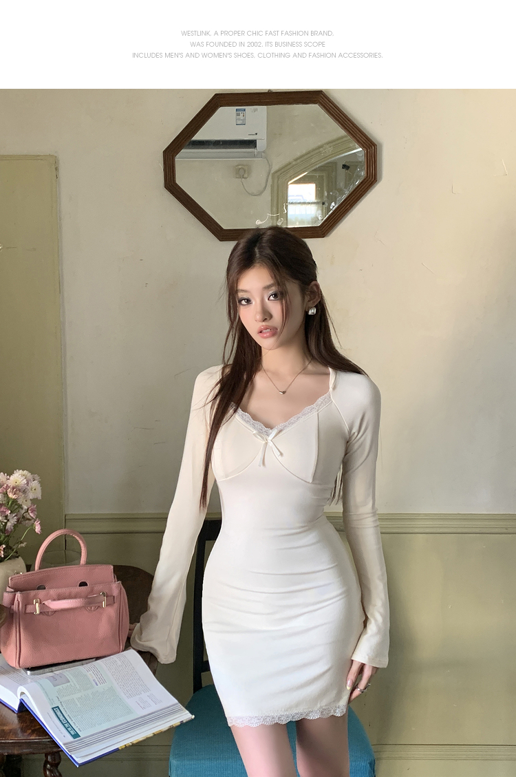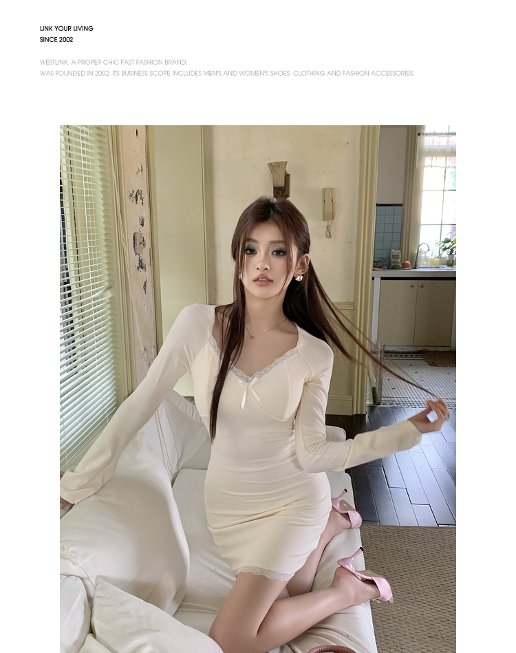 西遇短款V领连衣裙女冬季新款蕾丝边蝴蝶结领口设计裙子SS141277
