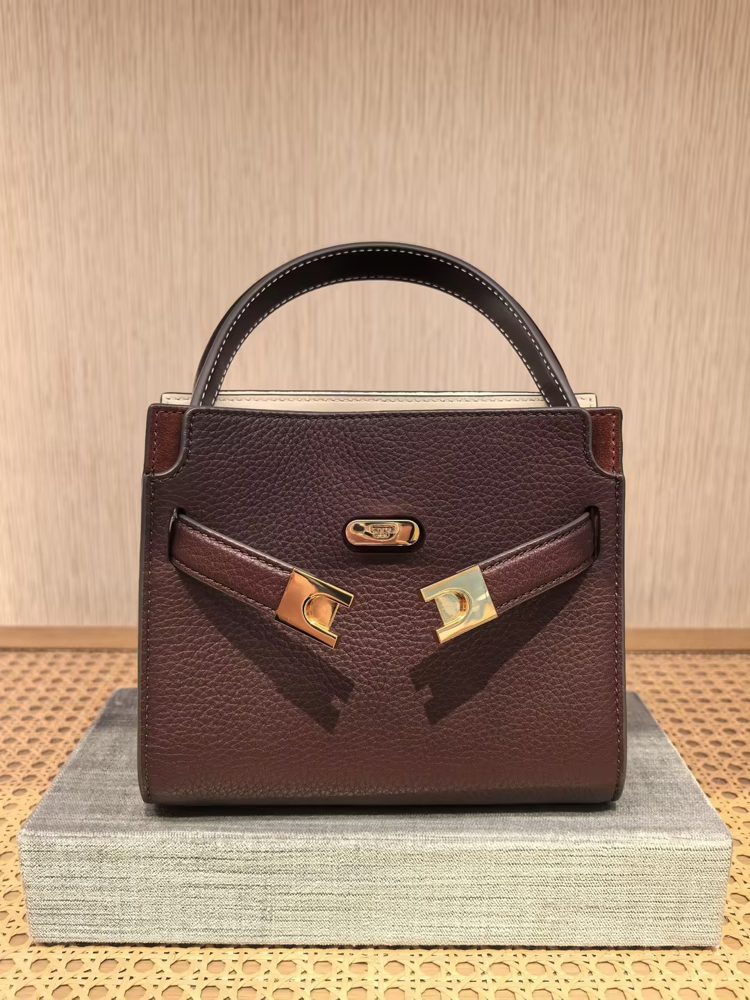 Lee Radziwill Petite系列凯莉包,采用深棕红荔枝纹牛皮打造,搭配金色金属扣饰与标志性的双T锁扣设计,包身小巧挺括,配有短提手,整体风格复古优雅,兼具质感与精致度。