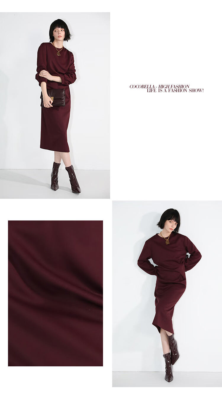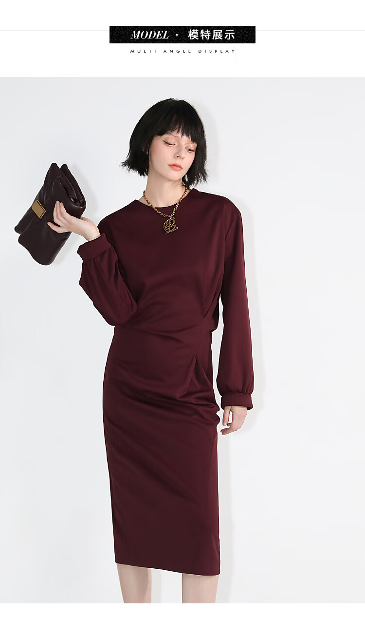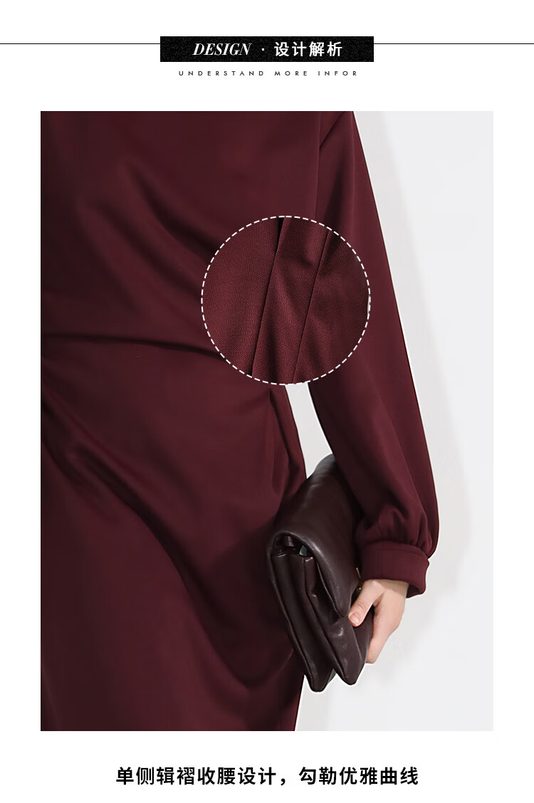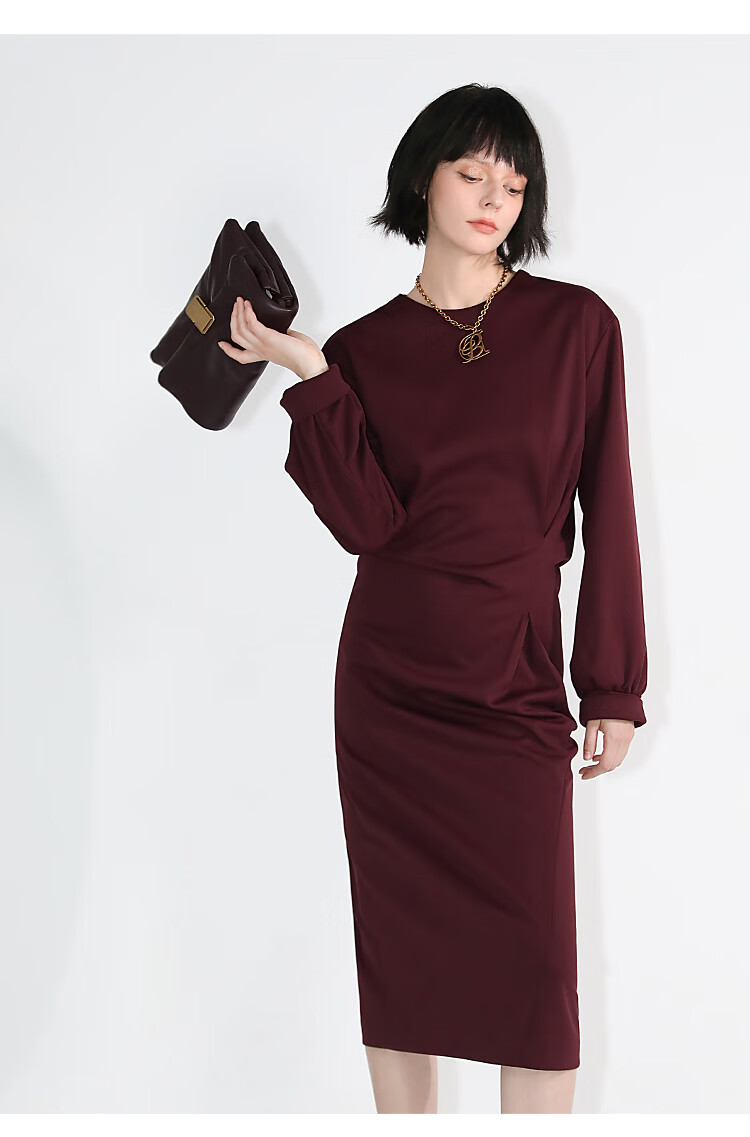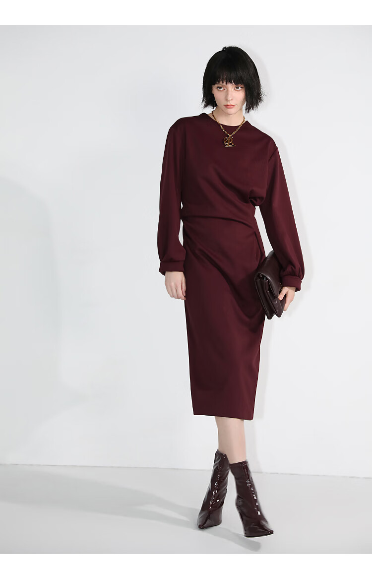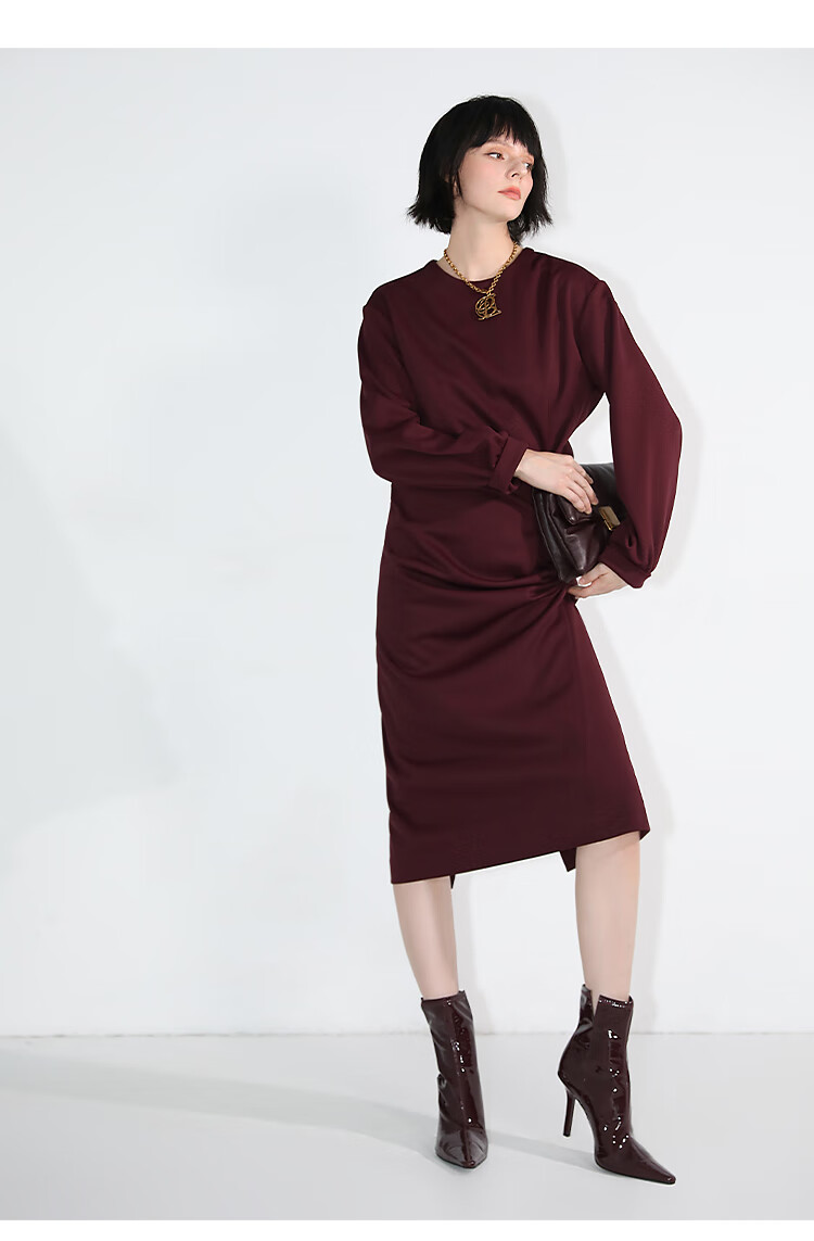 COCOBELLA[安哥拉红]设计感立体捏褶连衣裙女秋冬气质长裙FR935