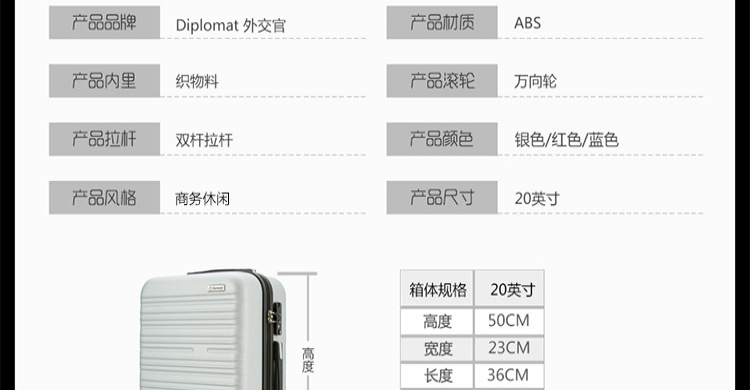 厂家直发(3-5天发货,着急勿拍)外交官(Diplomat)YH-6162拉杆箱 商务行李箱万向轮可登机 20寸白色