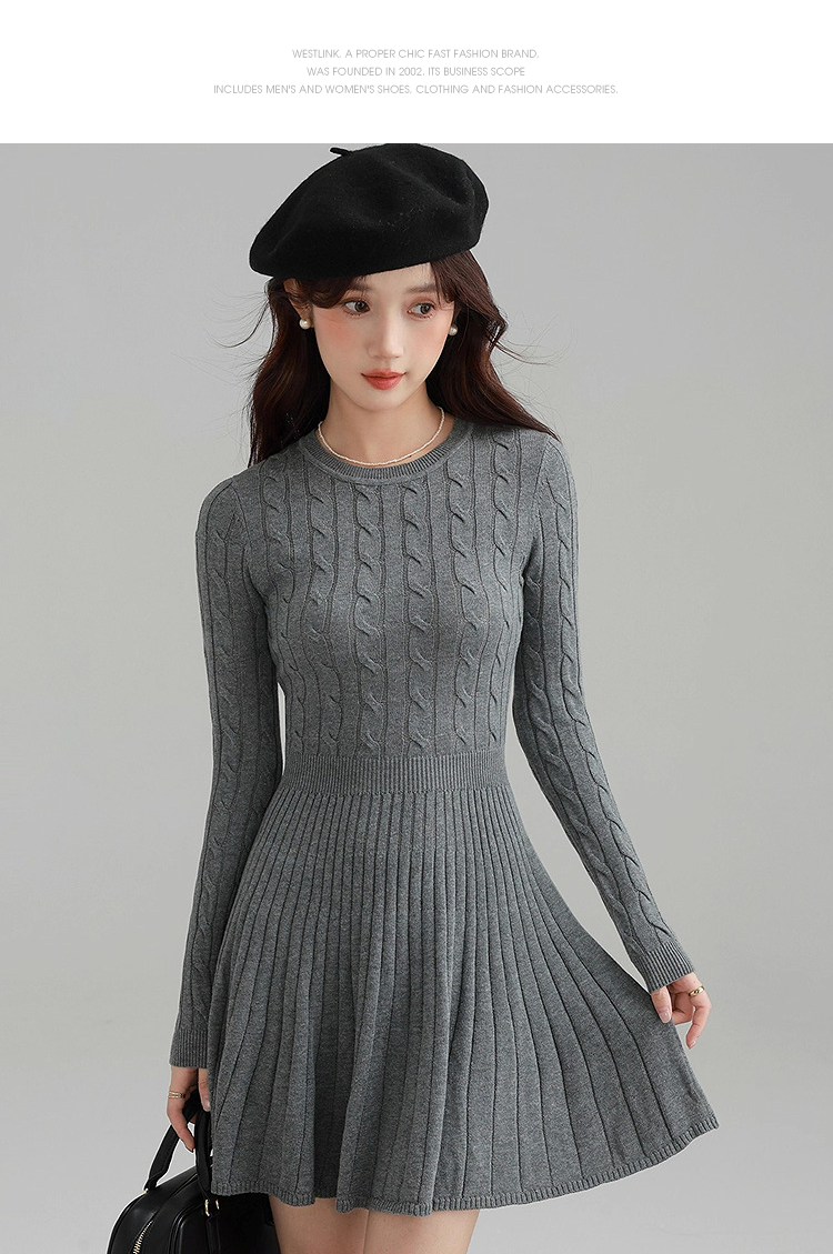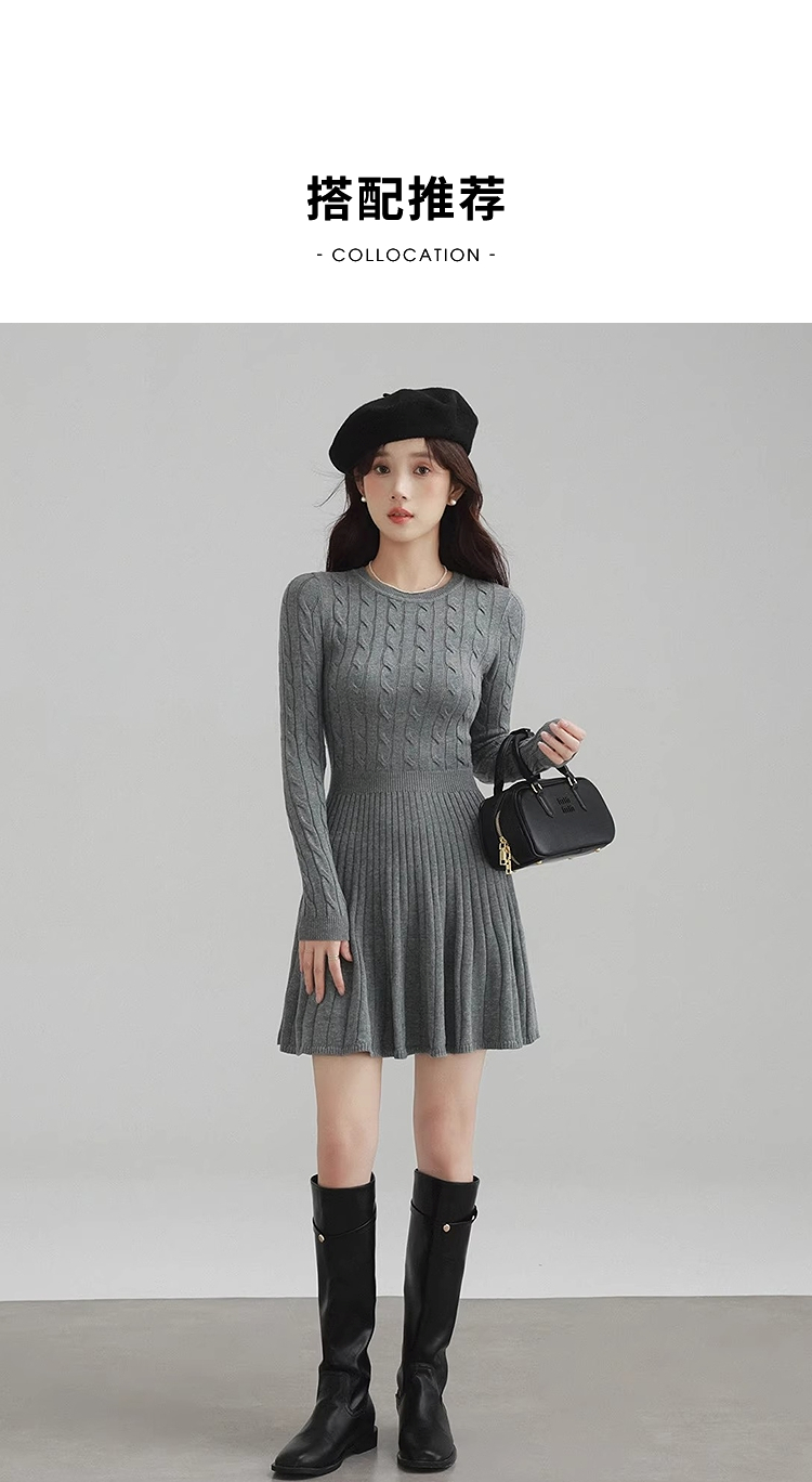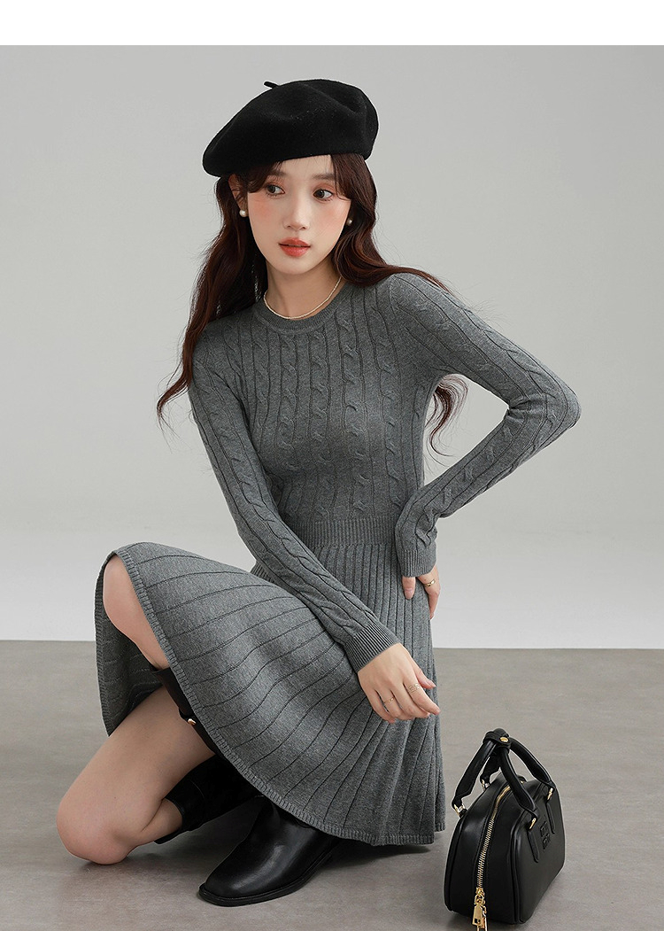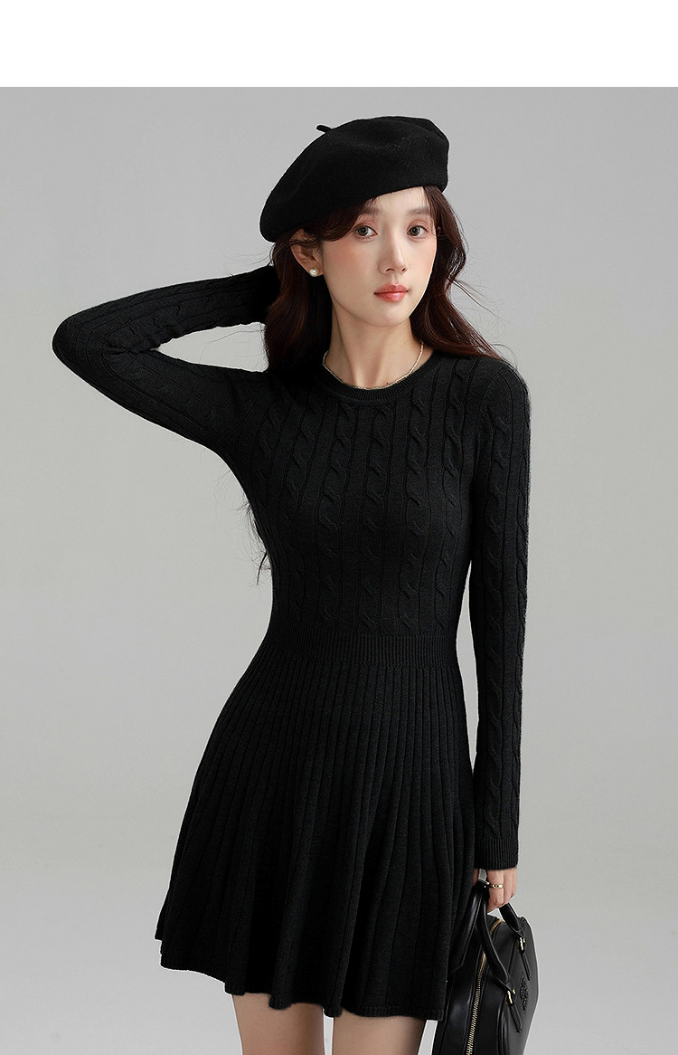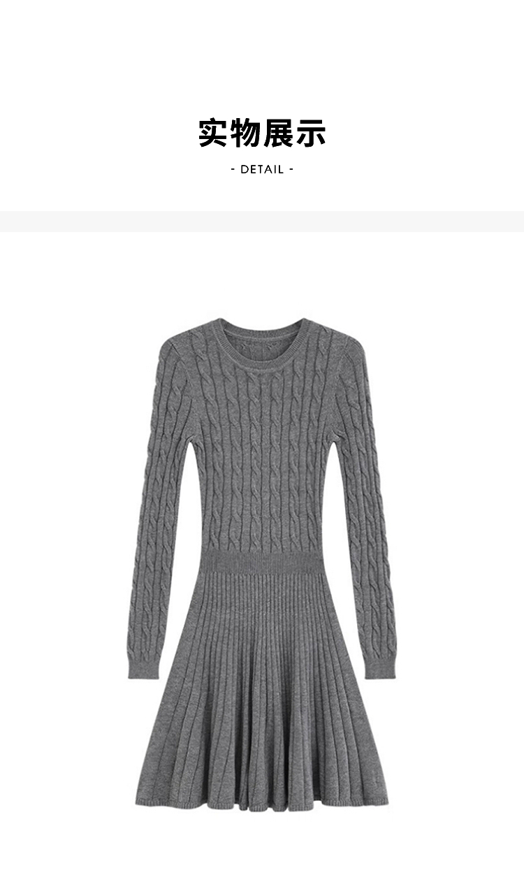 西遇长袖针织连衣裙女秋季新款复古圆领麻花收腰显瘦长裙SS051576
