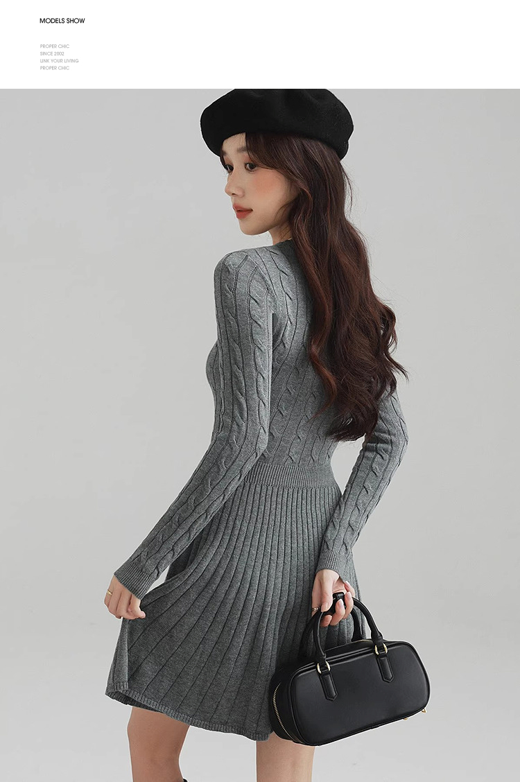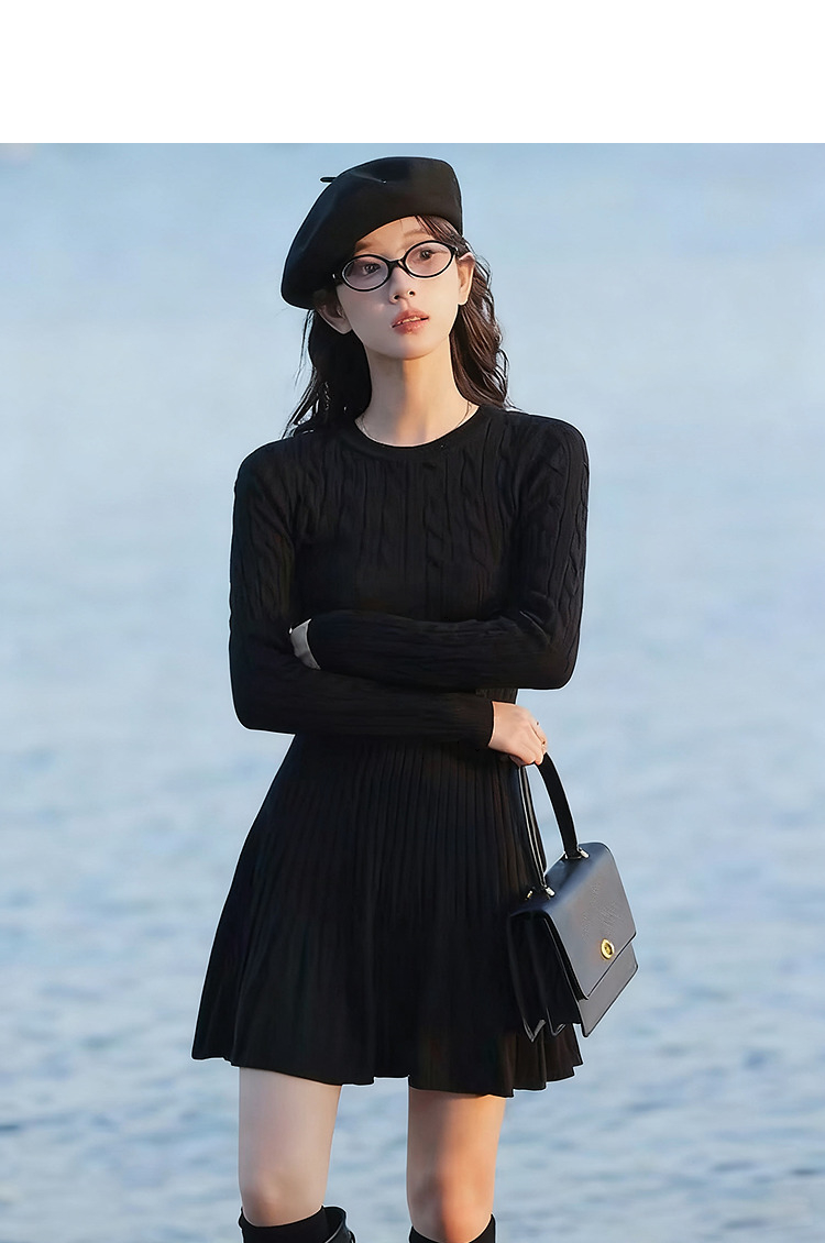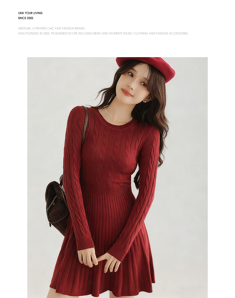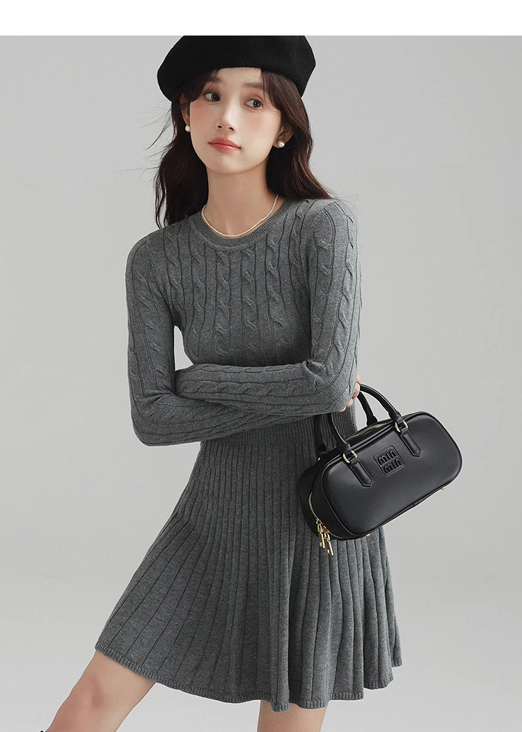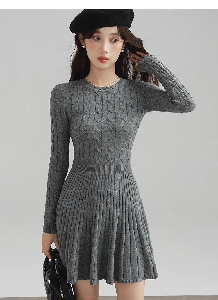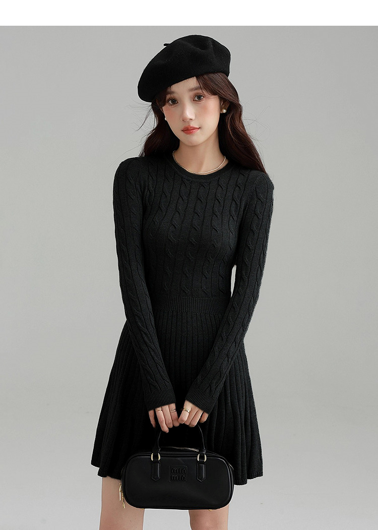 西遇长袖针织连衣裙女秋季新款复古圆领麻花收腰显瘦长裙SS051576