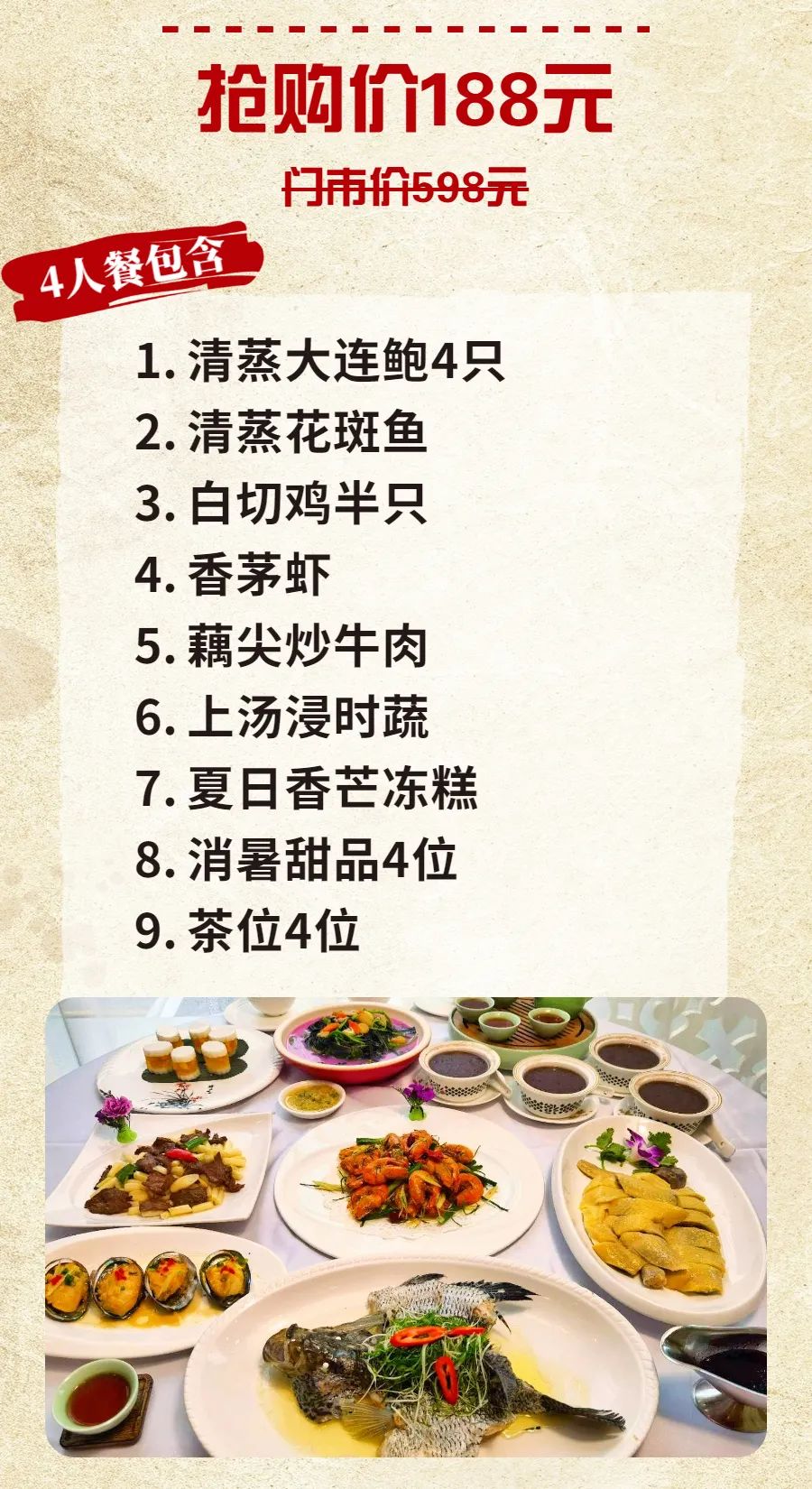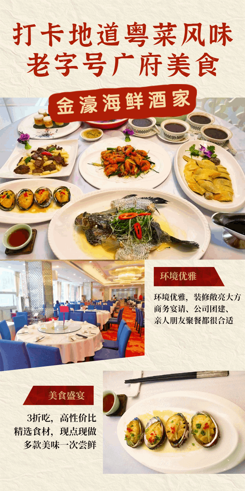 抢购截止日期8月5号【金濠海鲜酒家|长城宾馆店】仅3折,尝鲜老字号粤菜!188元抢价值598元4人餐=清蒸大连鲍+花斑鱼+白切鸡+香茅虾等多款