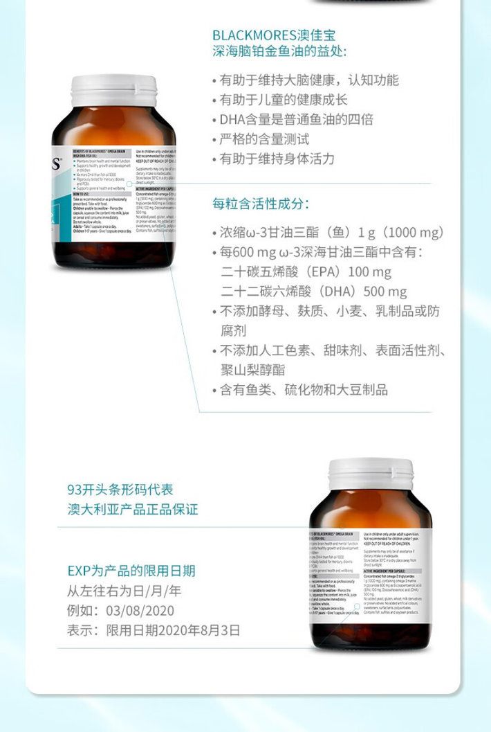 【秒杀】澳佳宝blackmores四倍DHA健脑配方鱼油60粒