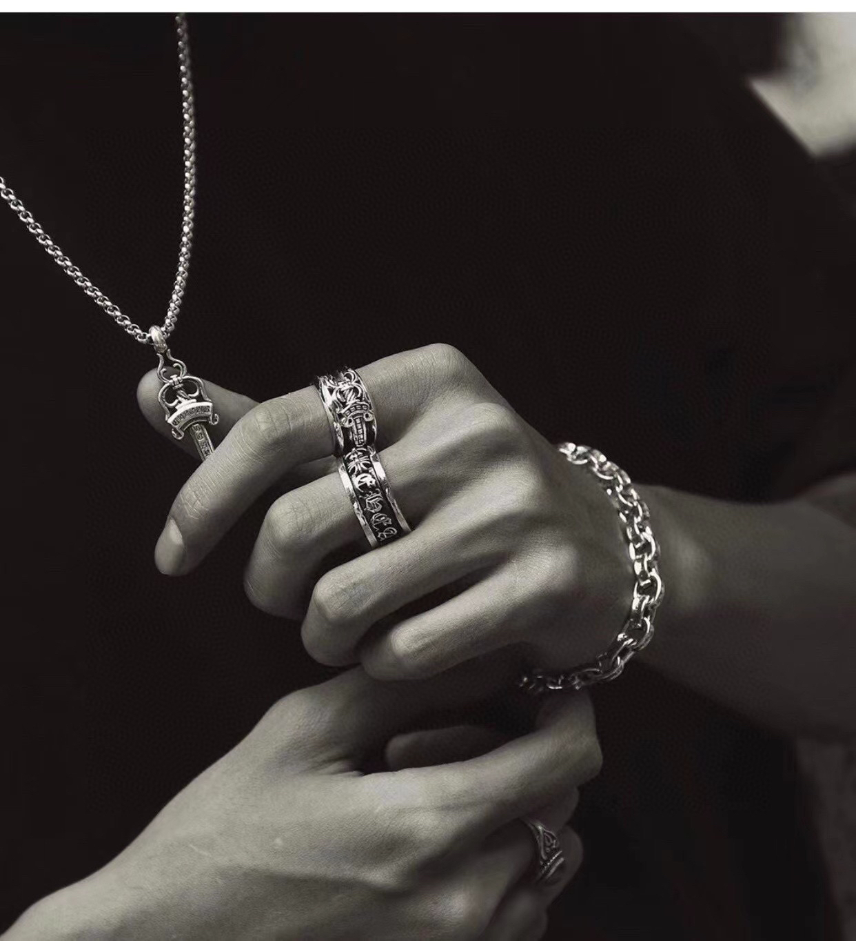 纯银材质 复古做旧 手工刻字 360度旋转 个性文字 十字花拼接 经典元素 低调奢侈