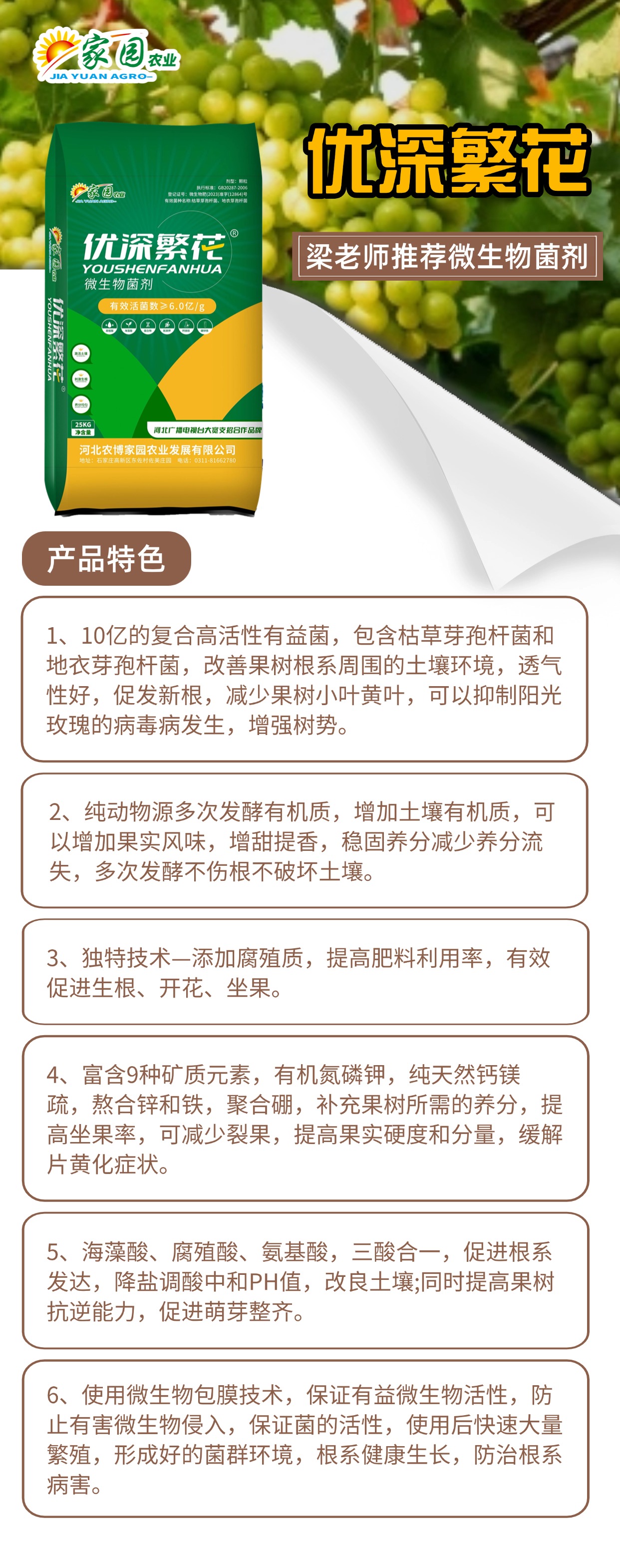 1. 10亿的复合高活性有益菌,包含枯草芽孢杆菌和地衣芽孢杆菌,改善果树根系周围的土壤环境,透气性好,促发新根,减少果树小叶黄叶,增强树势