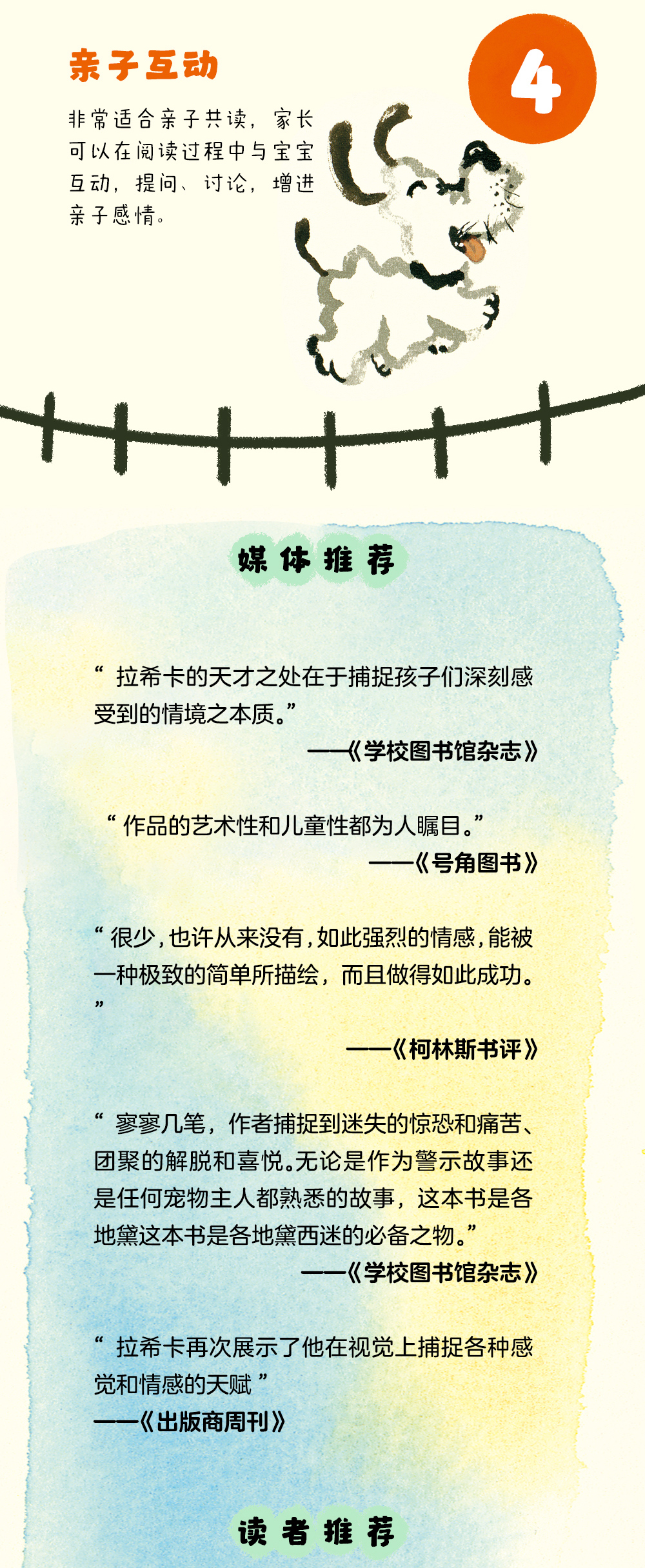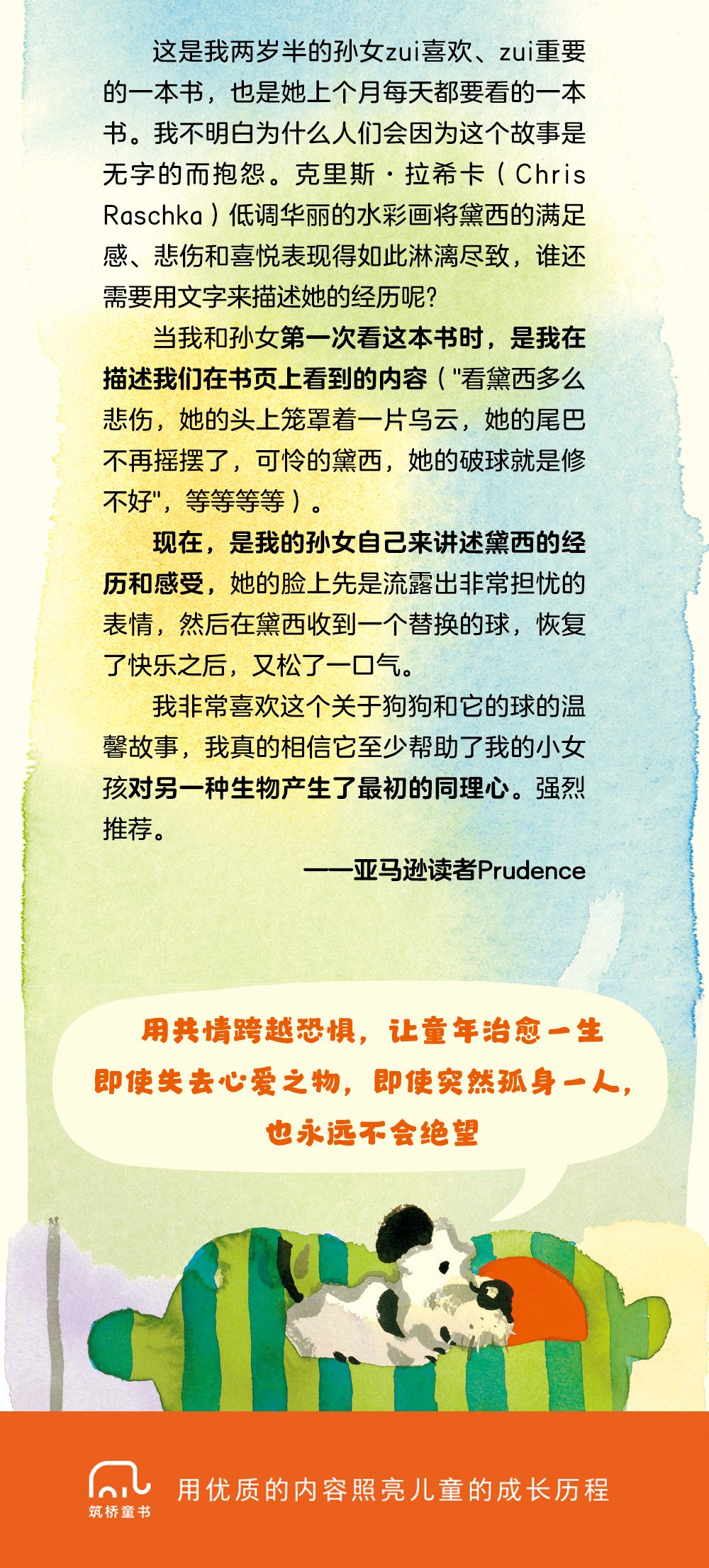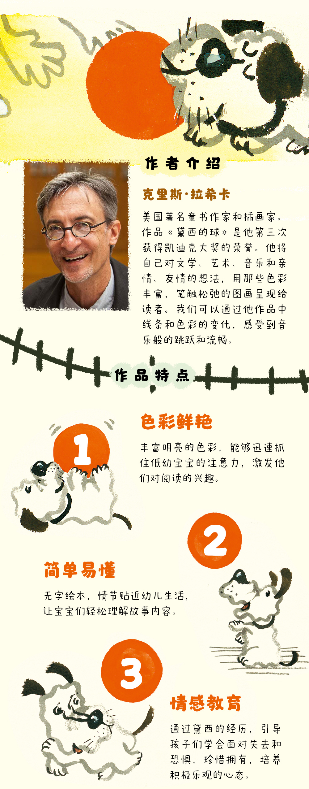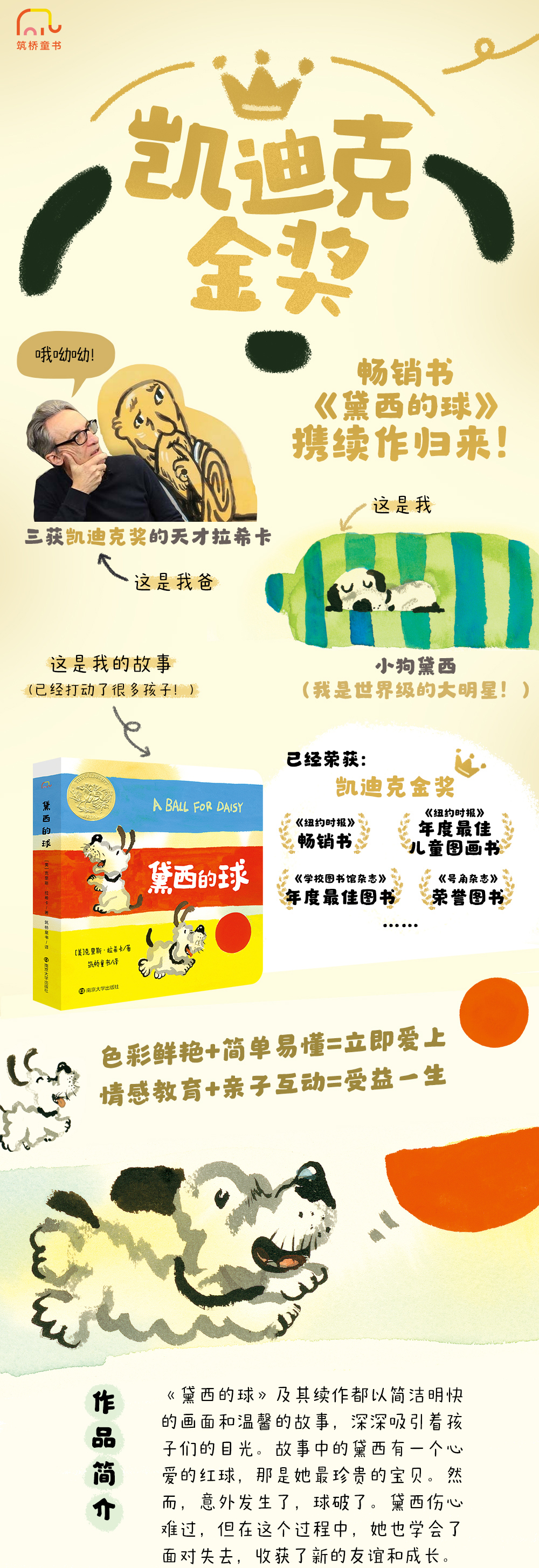 三获凯迪克奖的天才拉希卡创作,低幼书中的经典作品。黛西系列荣获凯迪克金奖、《纽约时报》畅销书、《纽约时报》年度最佳儿童图画书等多项国际荣誉,中文新版升级为圆角纸板书,更适合宝宝小手翻阅。 在《黛西的球》中,小狗黛西有一个心爱的红球,那是它最心爱的宝贝。当红球被另一只小狗意外弄坏后,黛西生气又伤心。但在这个过程中,它也学会了面对失去,收获了新的友谊和成长。 续作《黛西迷路了》讲述的同样是一件孩子很容易共鸣的糟糕事儿——迷路。小狗发现自己走丢时的惊恐和找到主人后的喜悦,这些在画面中自然流露的强烈情感将给小读者留下深刻的印象。