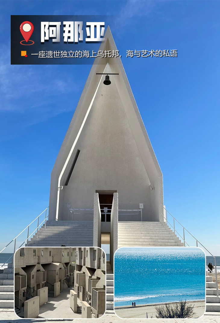 阿那亚有与海相伴的孤独图书馆,独特造型和静谧氛围成热门打卡点;洁白的阿那亚礼堂极具设计感,是艺术展、音乐会举办地;隐匿沙丘之下的 UCCA 沙丘美术馆,室内展厅借 “洞口” 将海景引入,与艺术展品相映成趣。除了这些标志性建筑,阿那亚还有优质海滩,沙质细腻,海水清浅。