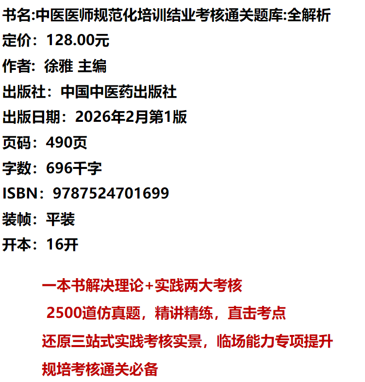 中医医师规范化培训结业考核通关题库:全解析 徐雅 主编 中国中医药出版社 2500道真题 三站式实践技能 规培考核通关必备
