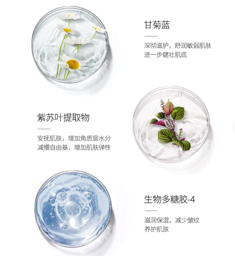 隔离霜中添加了纯度高达98.5%的甘菊蓝、紫苏叶提取物