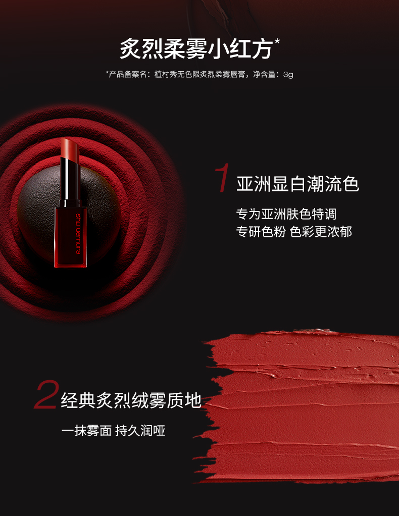 植村秀(shu uemura)小红方炙烈柔雾唇膏丝绒雾面显白哑光口红 心选到家