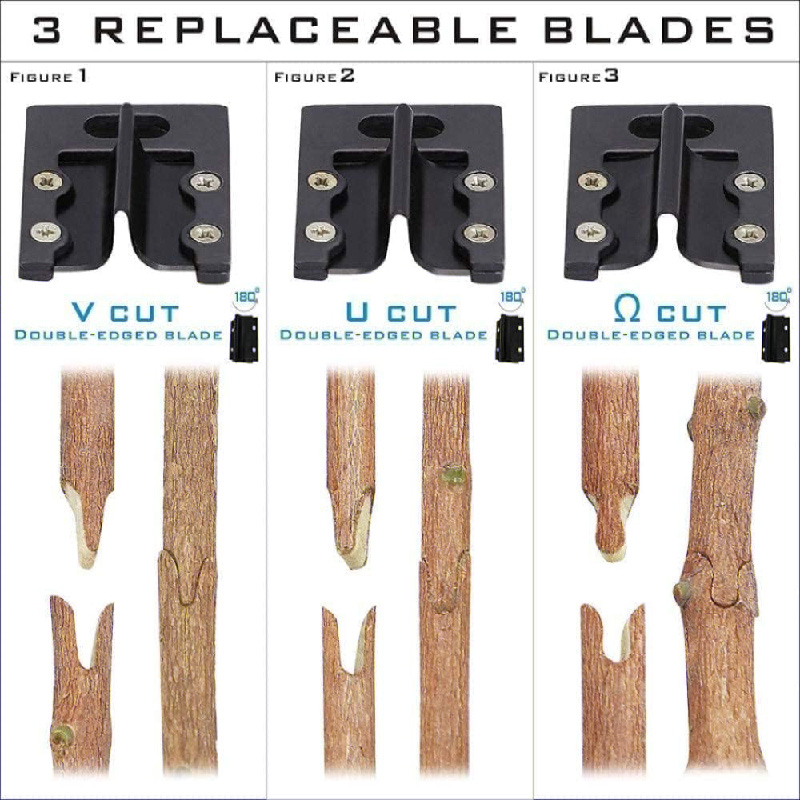 专业嫁接工具:这套园艺嫁接工具包包含一体嫁接修剪工具和3把可更换刀片。三种可更换的嫁接切割刀片(Ω切、U切和V切),用于切割直径从0.197英寸到0.472英寸的果树枝条。精准且完美的切割能提高存活率。