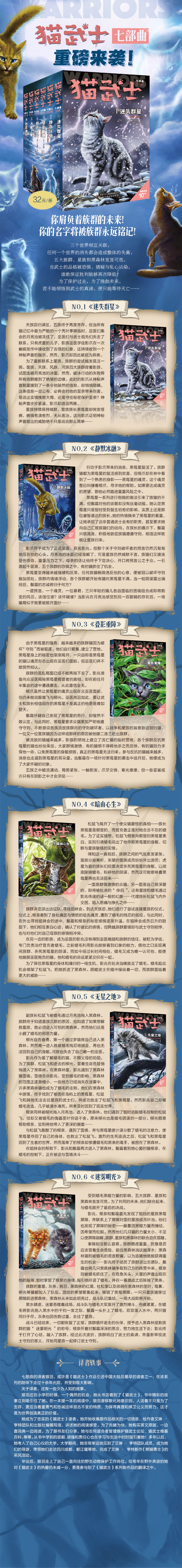 这是一部旷世奇作,把猫的众生相雕刻得栩栩如生。七部曲讲述的是雷族的族长黑莓星在失去九命之一后,身体被另一个魂灵所占据。年轻的猫武士和巫医,为了夺回黑莓星的身体,与黑暗力量展开了不屈不挠的斗争……
