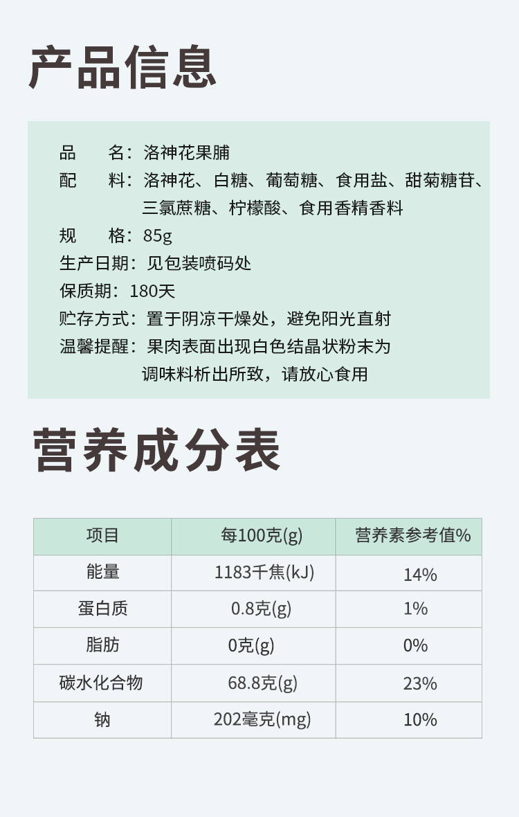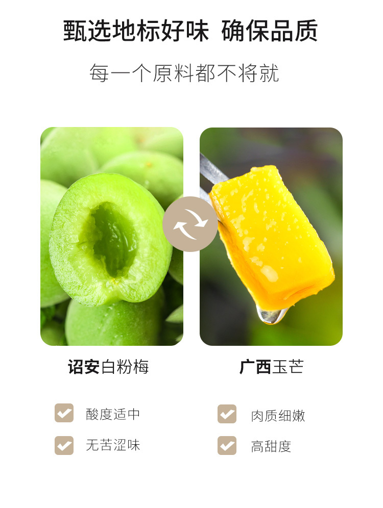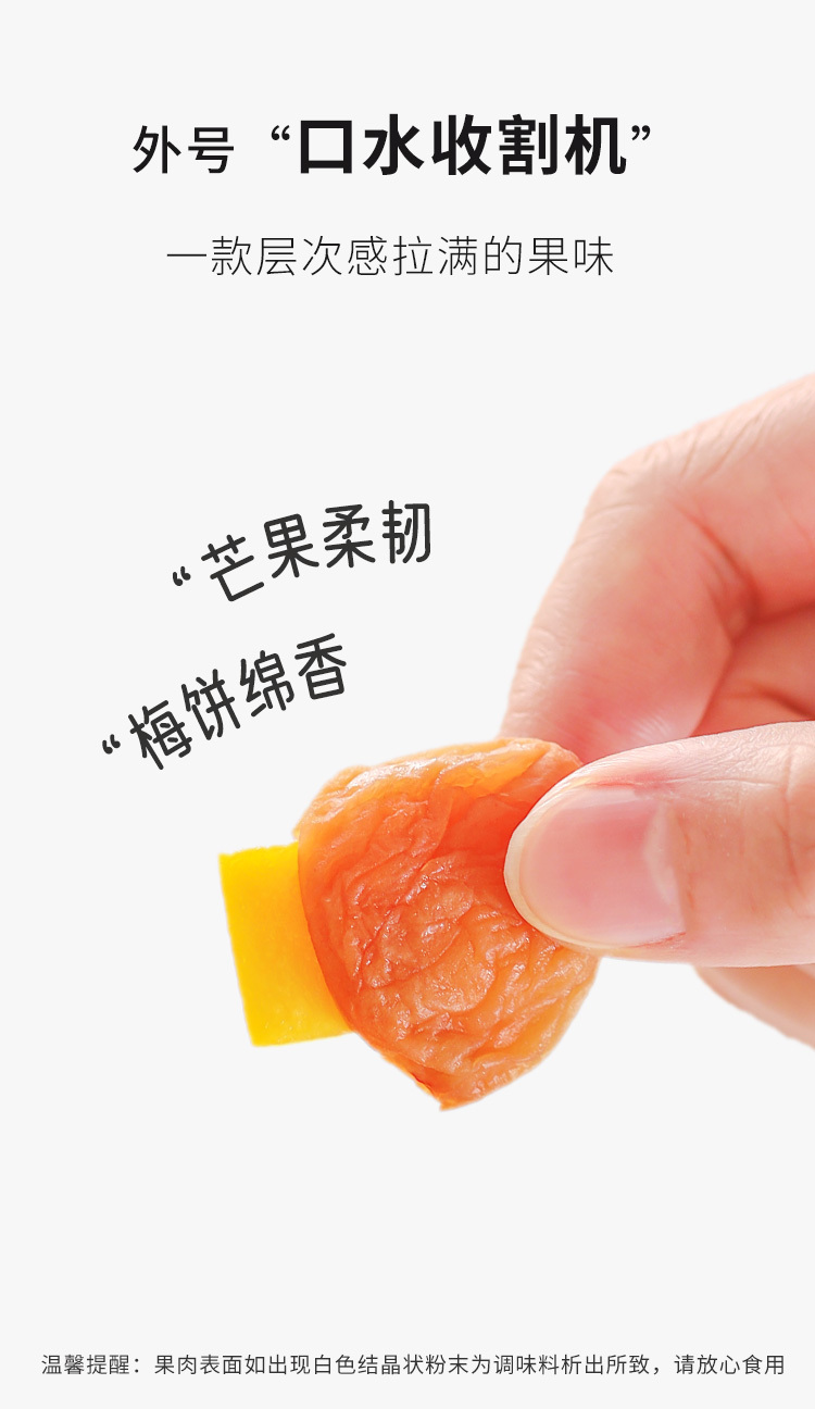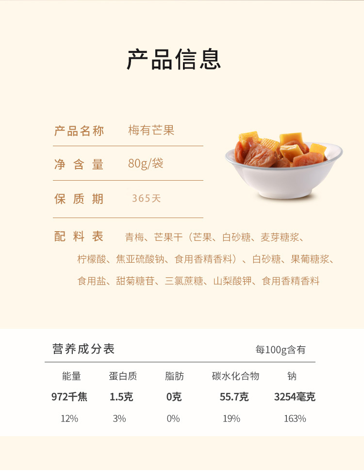 【品名】:梅有芒果 【产品规格】:80g/袋 【保质期】:365天 【配料表】:青梅、芒果干(芒果、白砂糖、麦芽糖浆、柠檬酸、焦亚硫酸钠、食用香精香料)、白砂糖、果葡糖浆、食用盐、甜菊糖苷、三氯蔗糖、山梨酸钾、食用香精香料