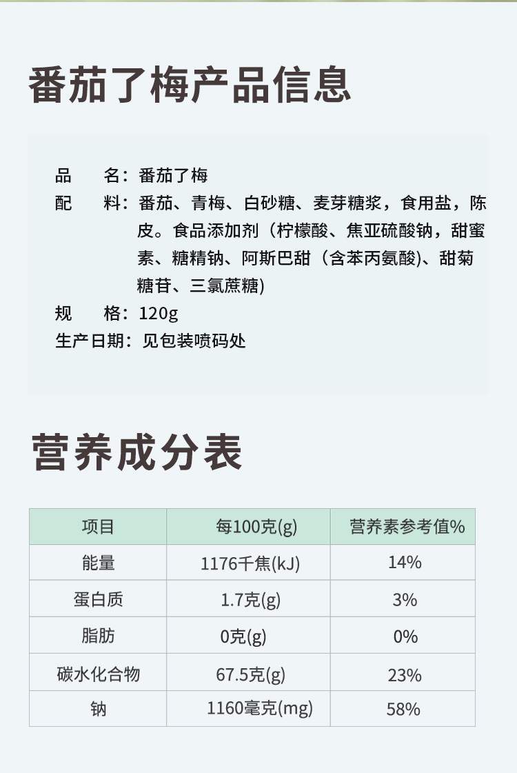 【品名】:番茄了梅 【产品规格】:120g/罐 【保质期】:6个月 【配料表】:番茄、青梅、白砂糖、麦芽糖浆、食用盐、陈皮;食品添加剂(柠檬酸、焦亚硫酸钠,甜蜜素、糖精钠、阿斯巴甜(含苯丙氨酸)、甜菊糖苷、三氯蔗糖) 【发货地】:福建漳州