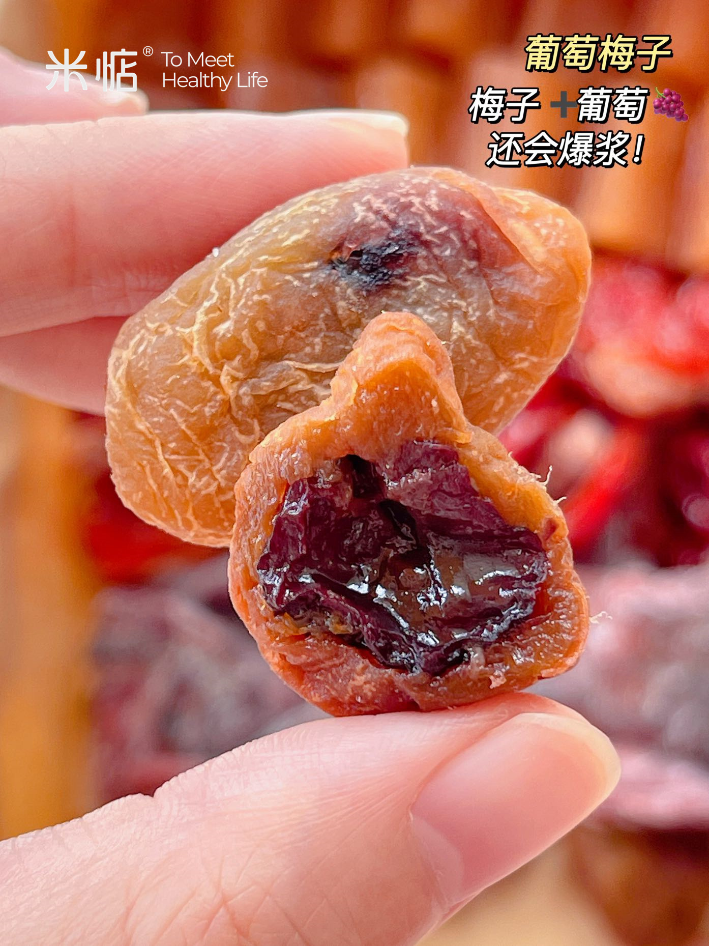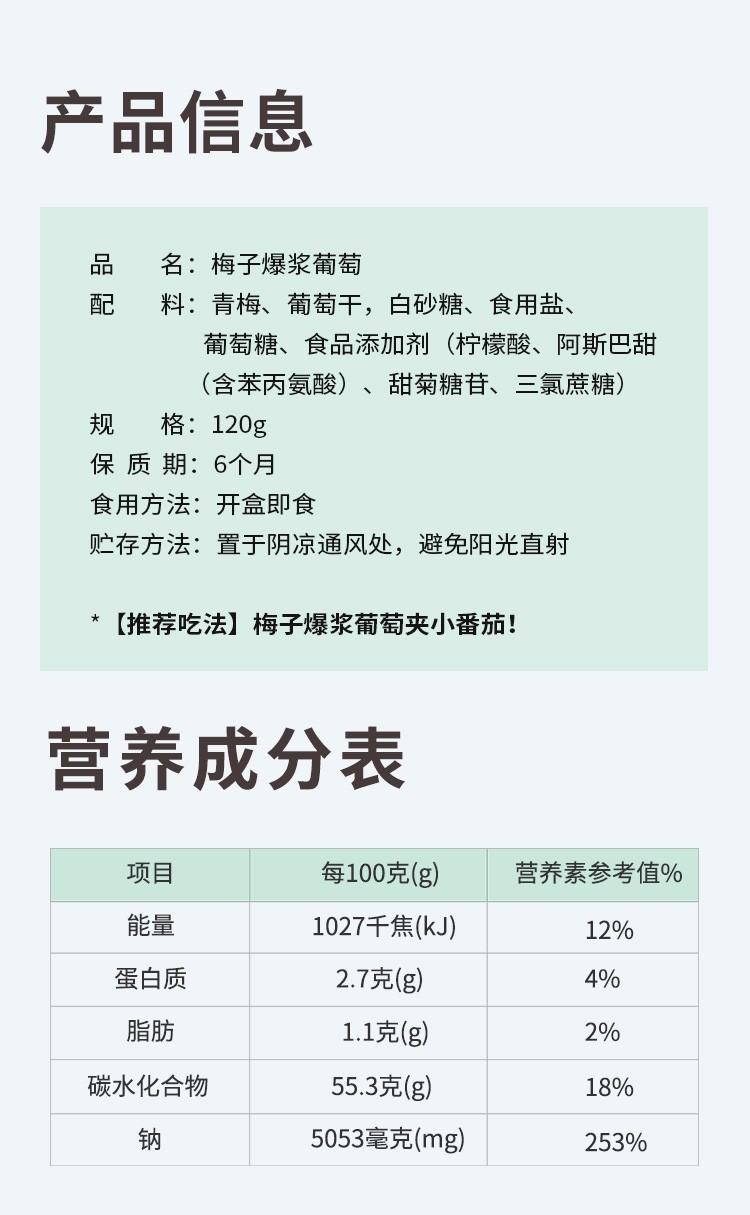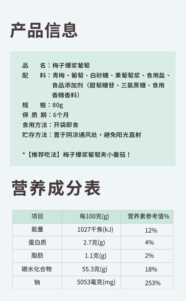 【品名】:梅子爆浆葡萄 【产品规格】:80g/包 【保质期】:180天 【配料表】:青梅、葡萄、白砂糖、果葡糖浆、食用盐、食品添加剂(甜菊糖苷、三氨蔗糖、食用香精香料)