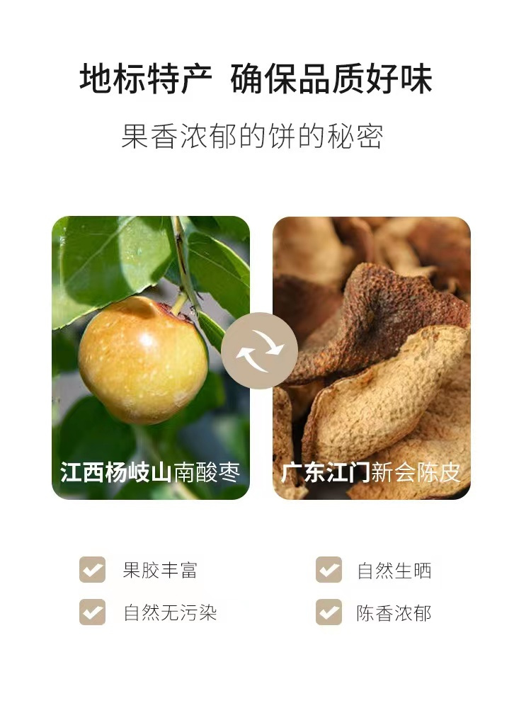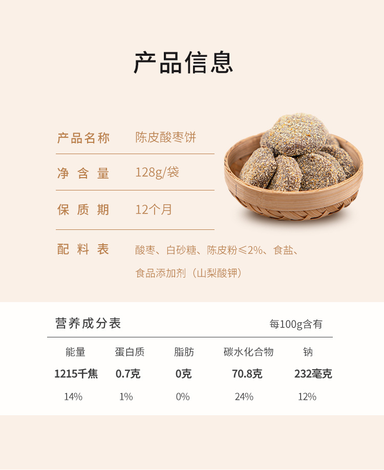 【品名】:陈皮酸枣饼 【产品规格】:128g/袋 【保质期】:12个月 【配料表】:酸枣、白砂糖、陈皮粉≤2%、食盐、食品添加剂(山梨酸钾) 【发货地】:福建漳州