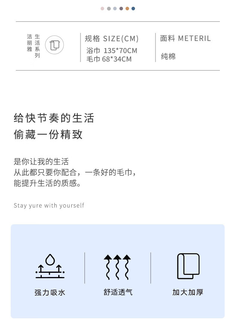 洁丽雅(Grace)纯棉男女柔软吸水1浴巾+2毛巾 三件套 7254颜色随机