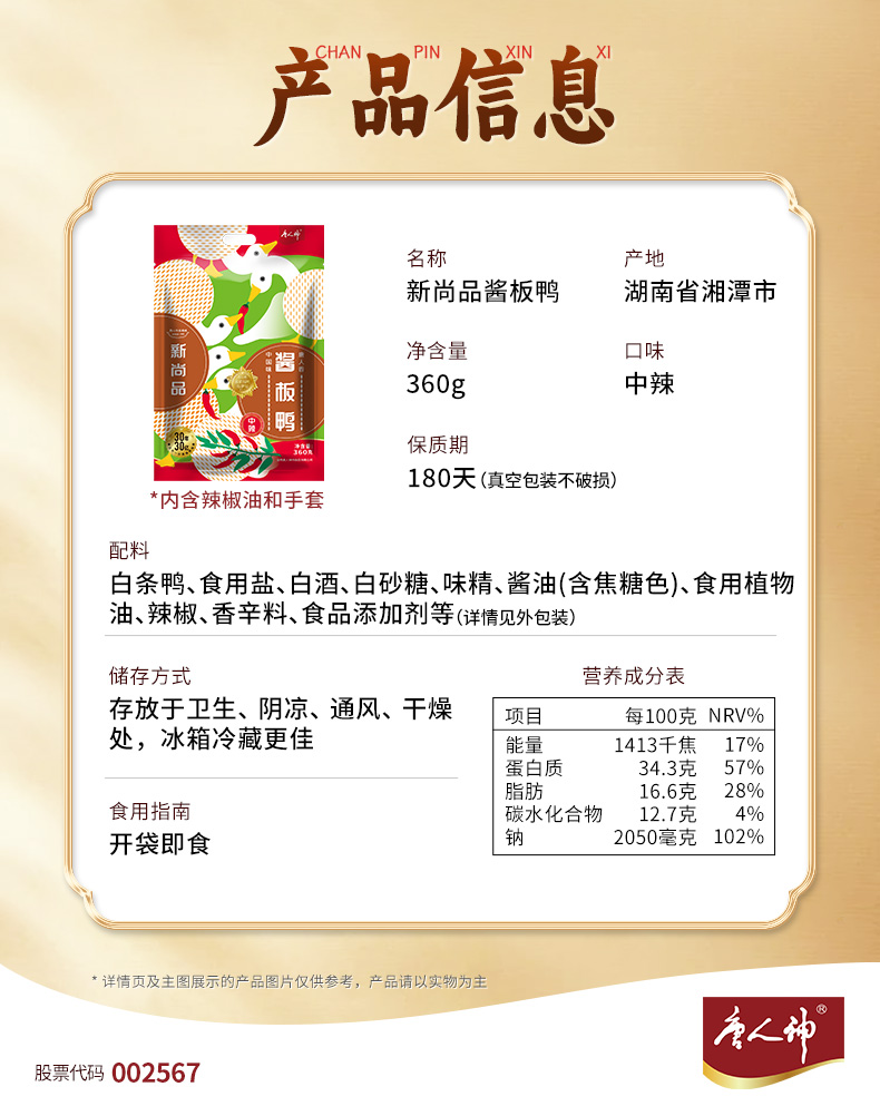 唐人神 尚品酱板鸭360g湖南特产常德休闲零食中辣卤味小吃开袋即食