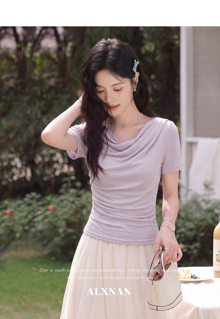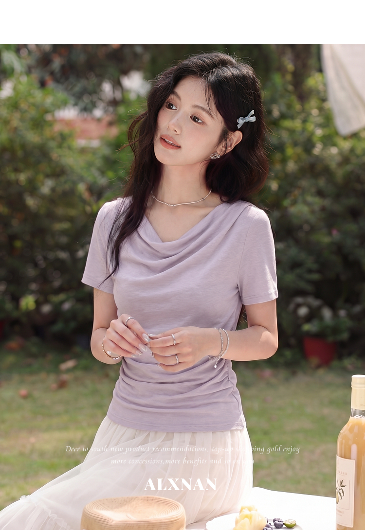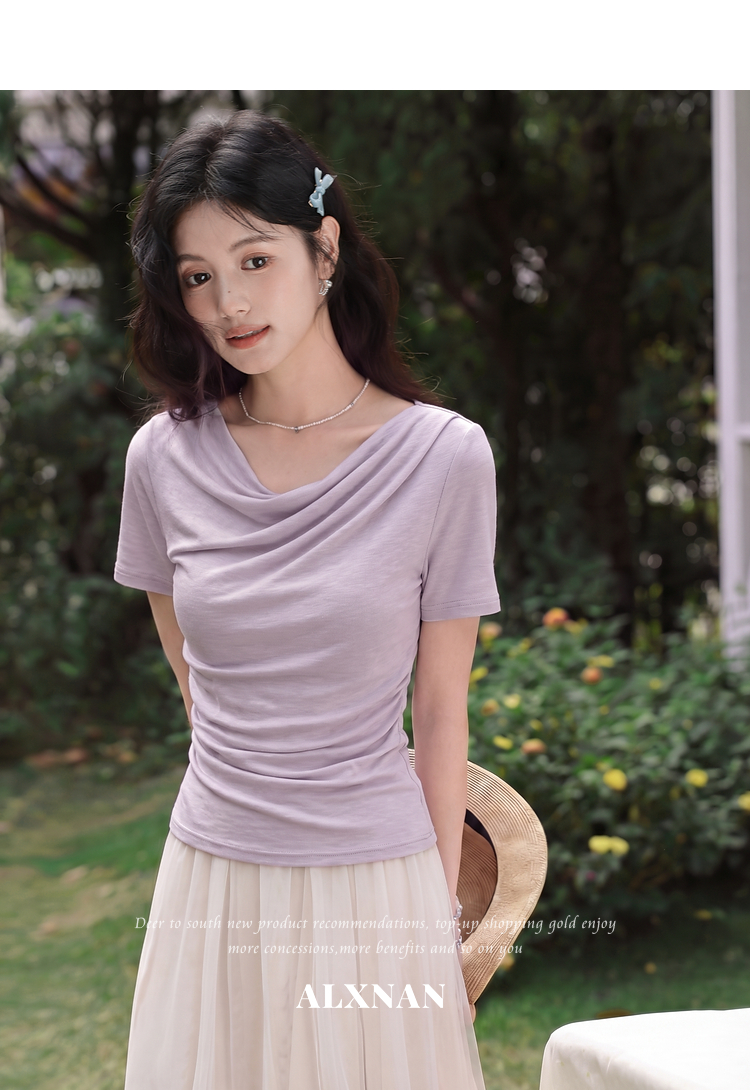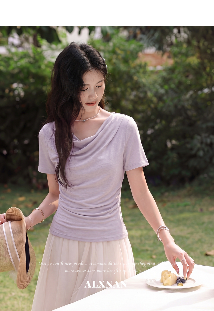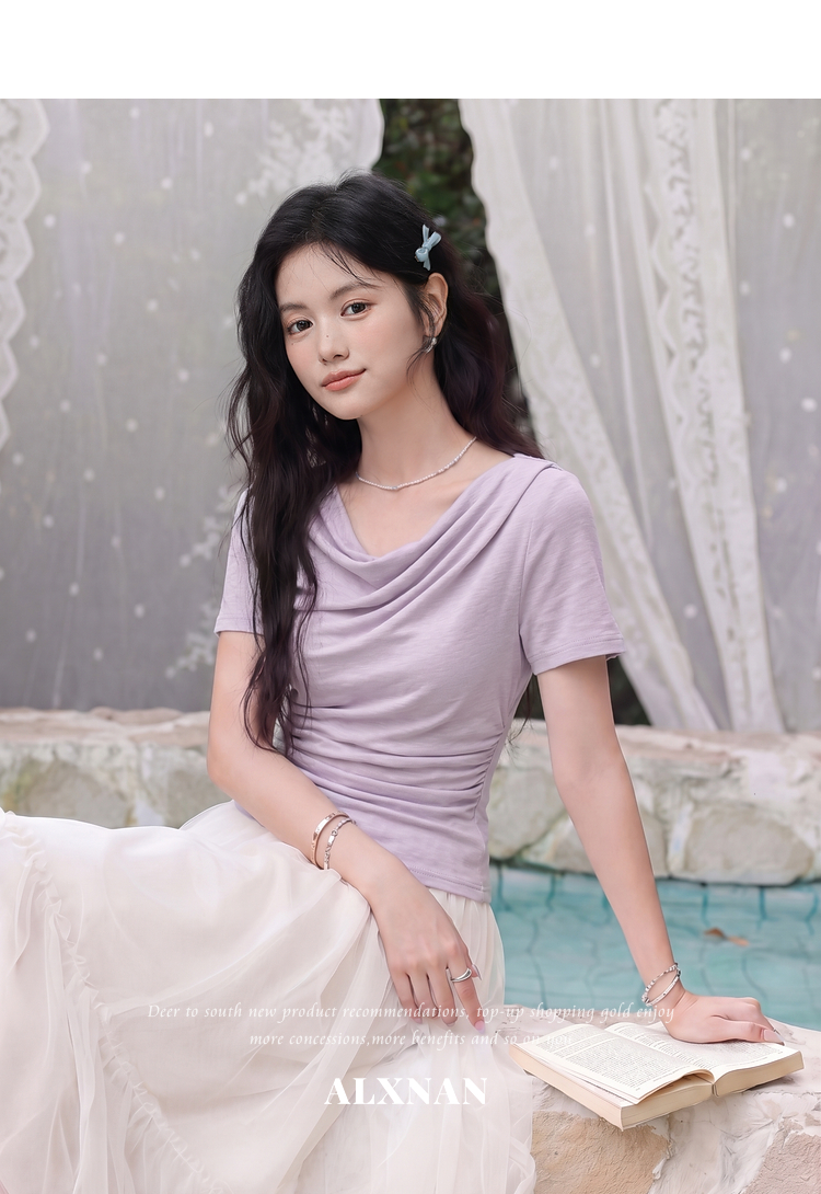 鹿向南「鸢尾叙夏」紫色短袖T恤女夏季荡领抽褶收腰显瘦正肩上衣
