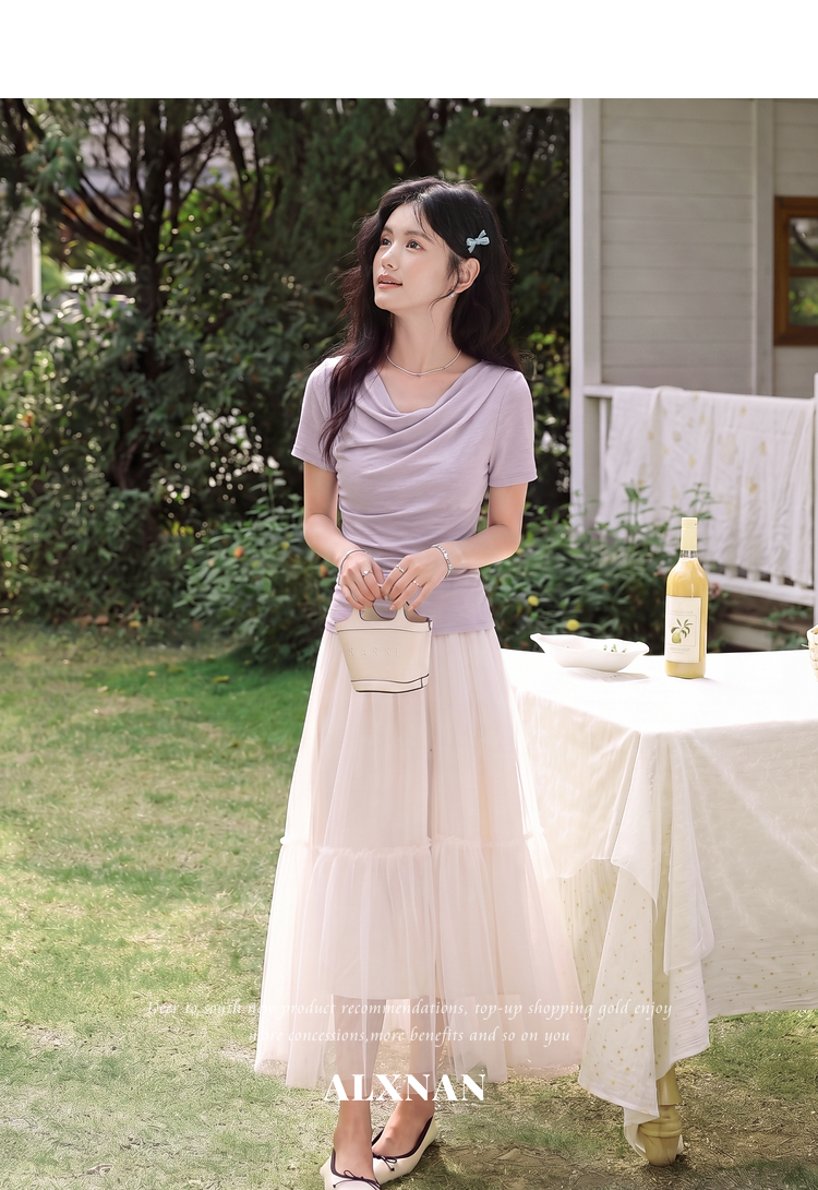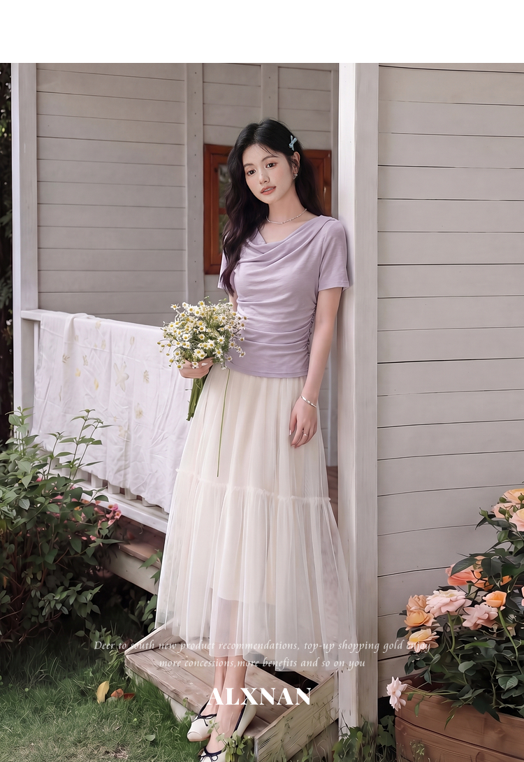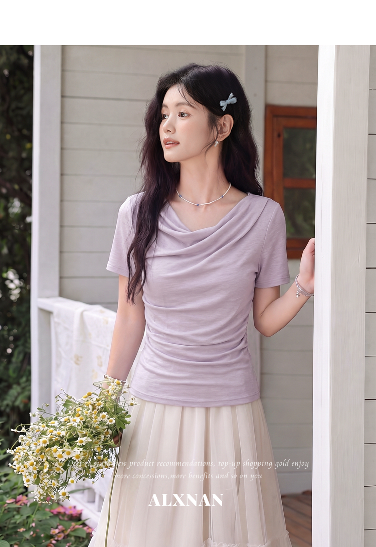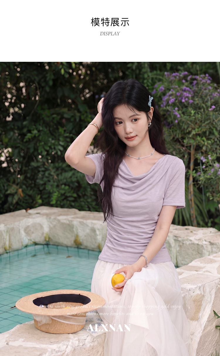 鹿向南「鸢尾叙夏」紫色短袖T恤女夏季荡领抽褶收腰显瘦正肩上衣
