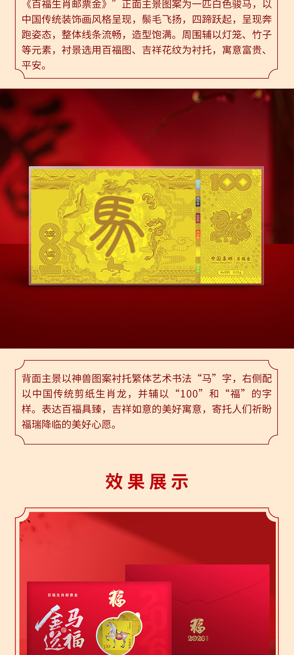 2026金马送福·马年百福生肖邮票金,中国集邮官方发行,含999足金10mg