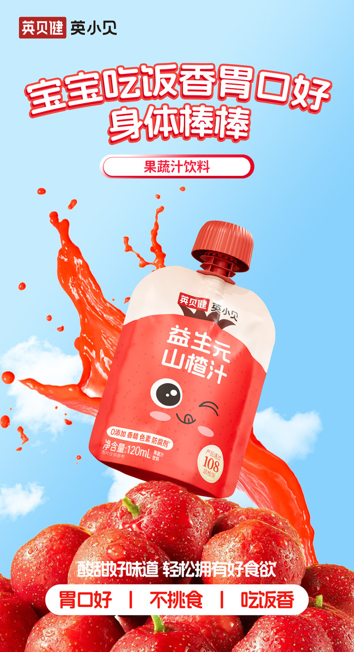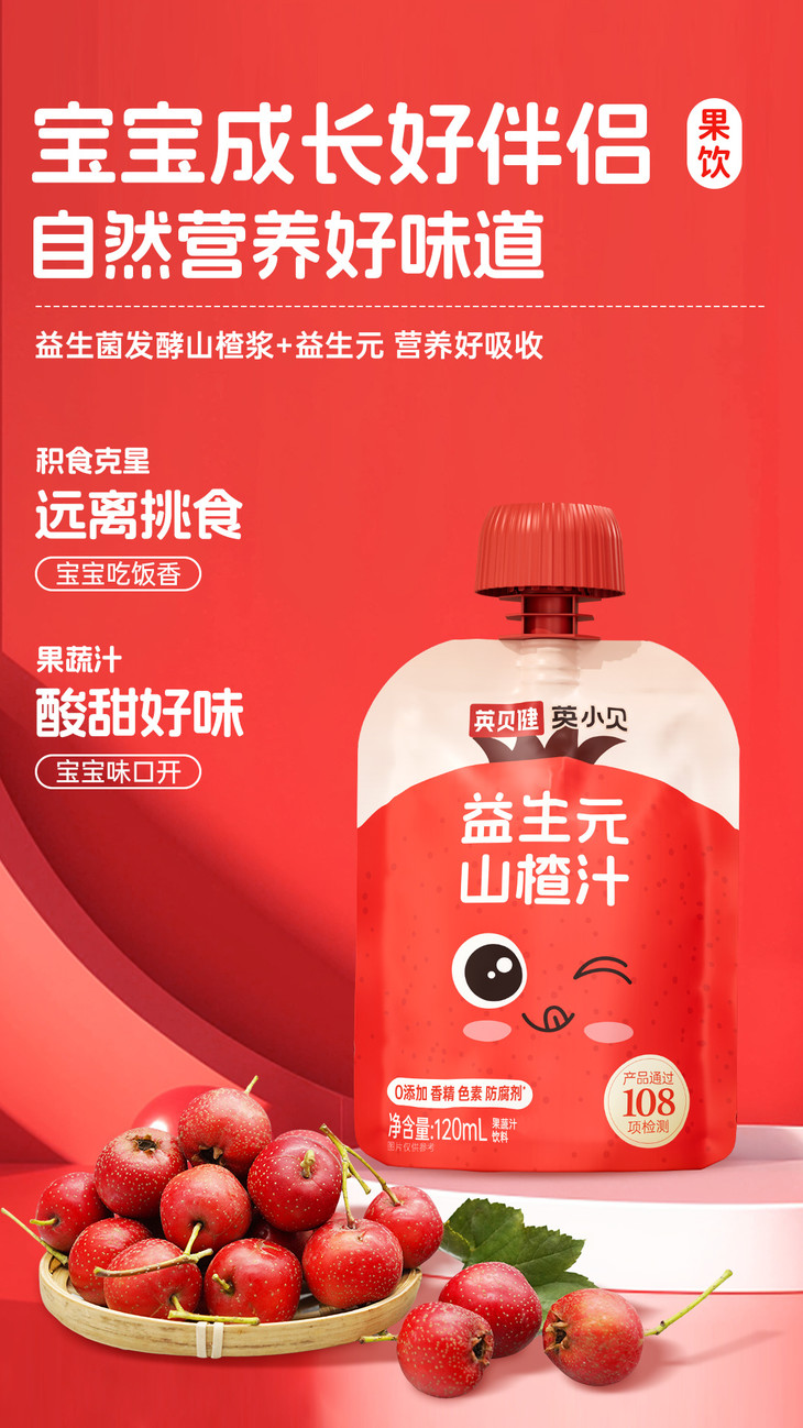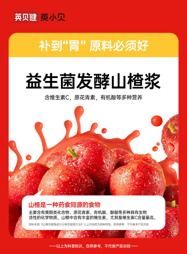 “山楂”被誉为“国民消食小能手” 尤其是肉肉吃多,不爱蔬菜的小盆友 多吃山楂可以很好的消化肉食哦🥩 英小贝还特别添加益生元守护肚肚健康
