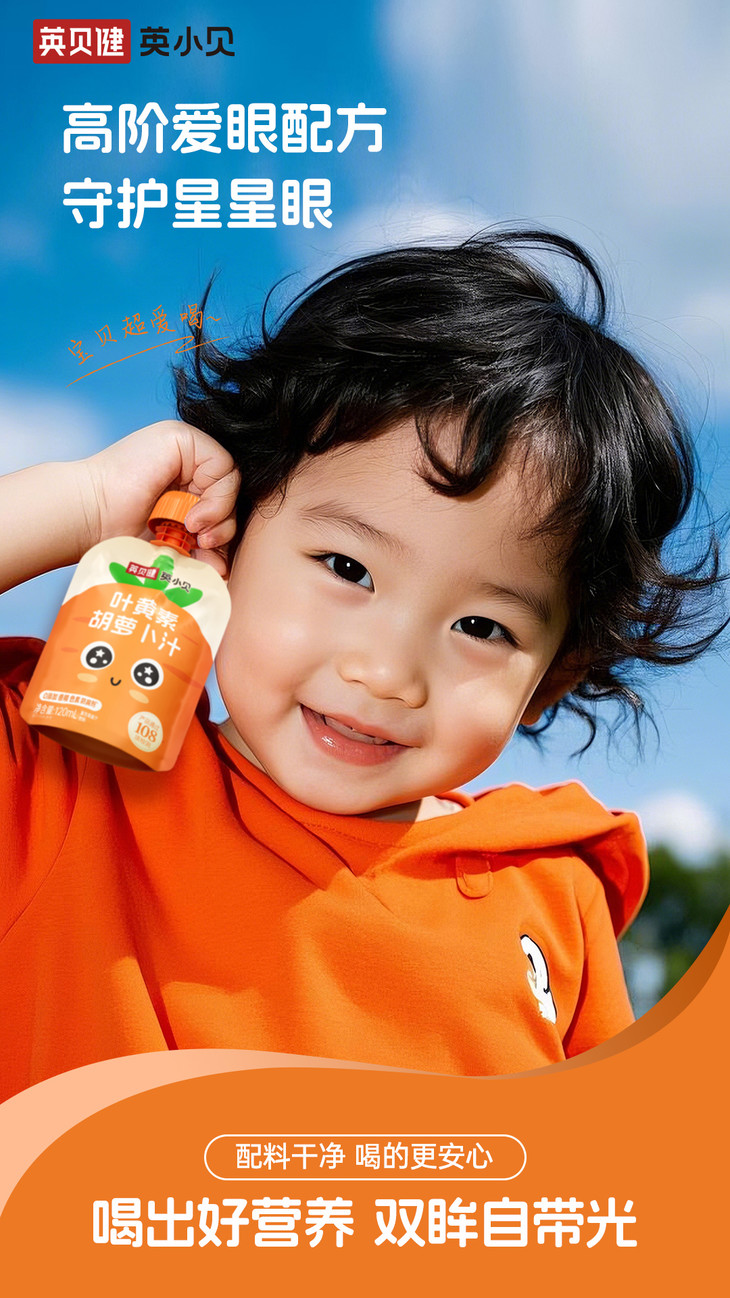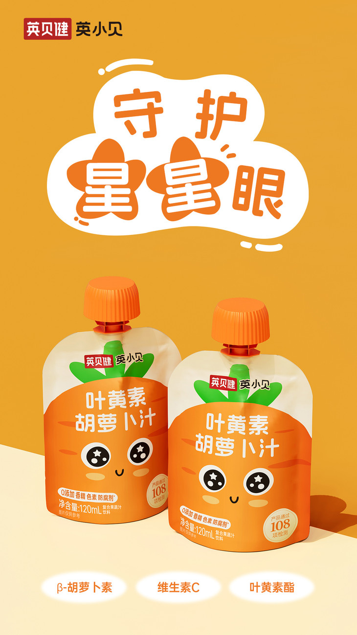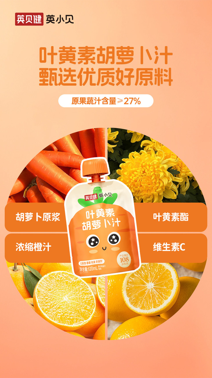 🐰英小贝叶黄素胡萝卜汁 🧃守护孩子闪亮✨星星眼 配料:胡萝卜原浆+叶黄素酯+浓缩橙汁等 ✅原果汁含量≥27% ✅含β-胡萝卜素/维C/叶黄素