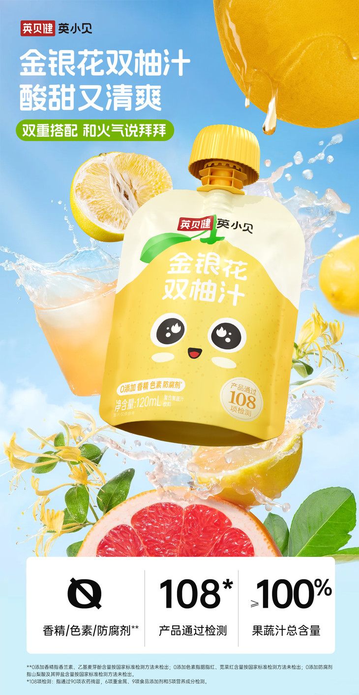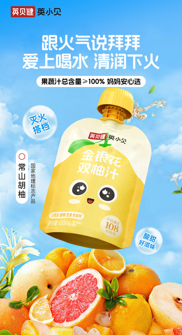💧不爱喝水,总爱喝奶茶可乐高糖饮料 嗓子不舒服、鼻子也闷闷的宝宝 👏这款金银花双柚汁甘简直就是为TA们而生的!宝贝再也不上火口臭了 ~ 妈妈们也都知道柚子的作用 英贝健采用双柚结合 🈵🈵柚香,好喝了😋