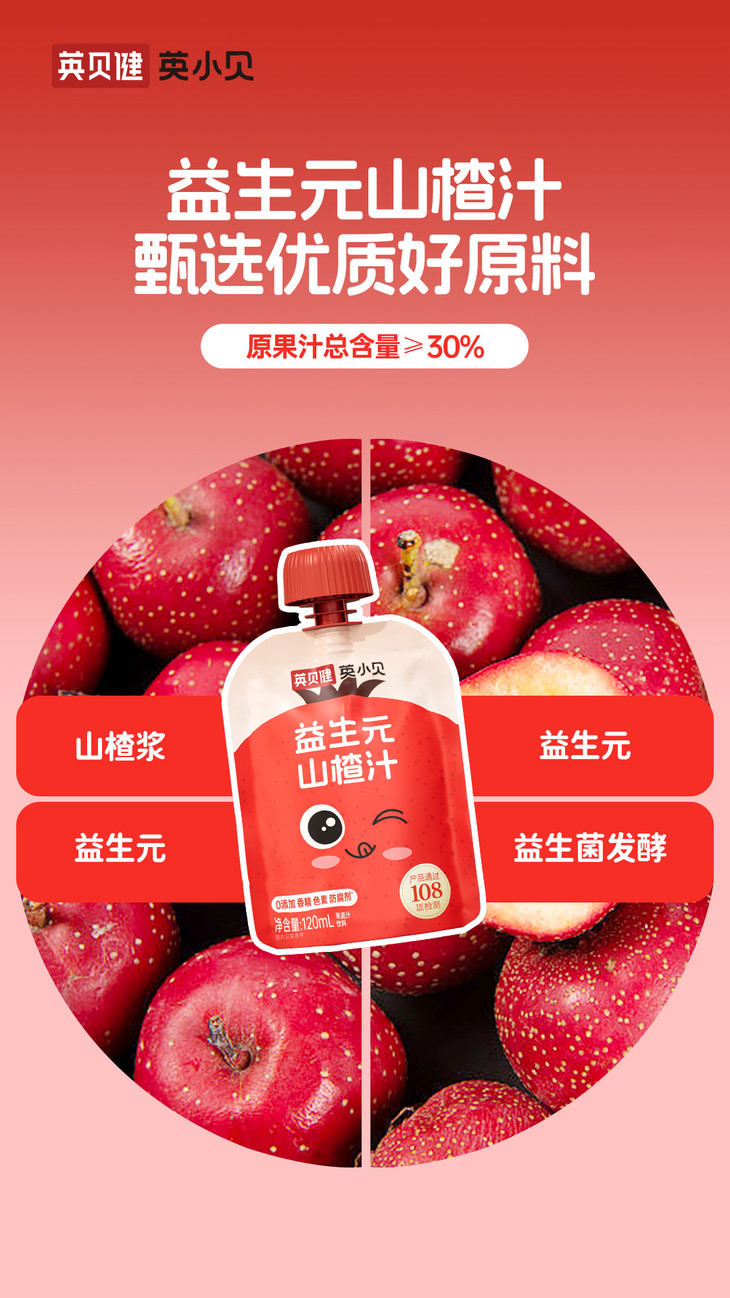 适合小朋友喝的山楂汁来啦🎉 🐰英小贝益生元山楂汁 🧃≥30%原果蔬汁开胃积食克星 配料🈶益生菌发酵山楂浆×桑葚浆