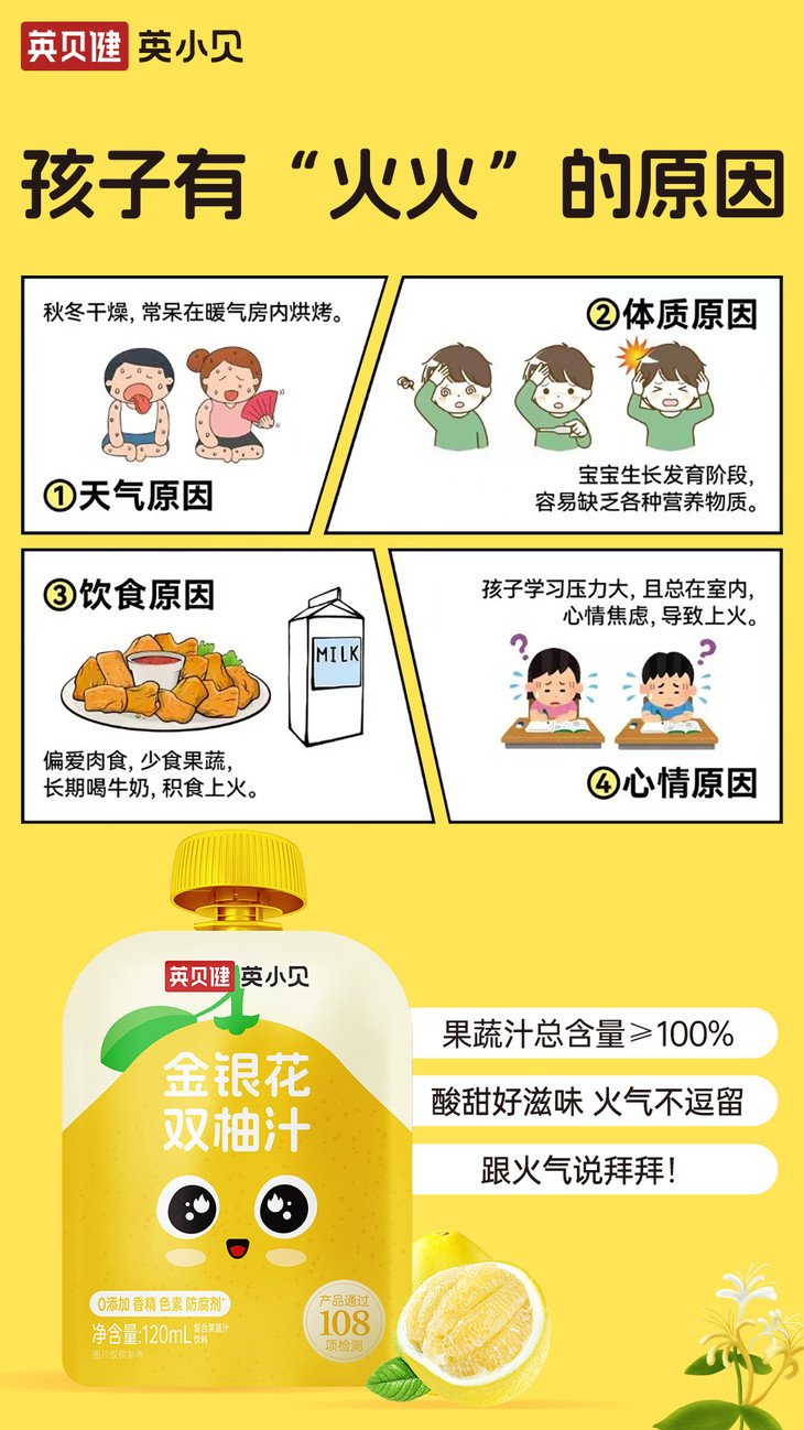 怕添加,就喝英小贝 怕上火,就喝英小贝金银花双柚汁 堪称儿童饮品界的“王老吉” 🔥气候干燥,病毒流感、担心孩子咳嗽不舒服?再加上宝宝喝水不足,真的很容易上火