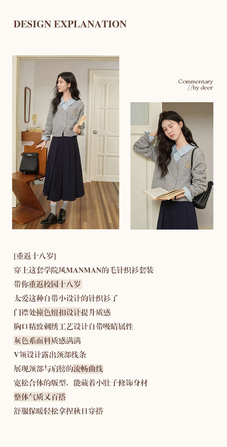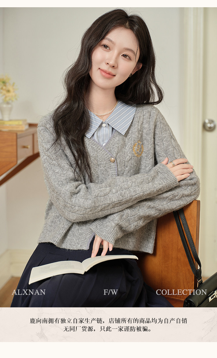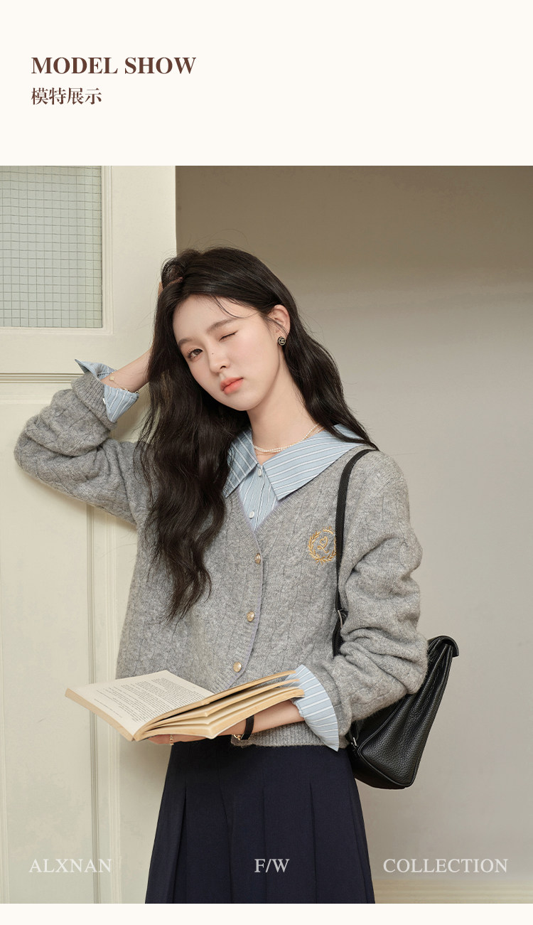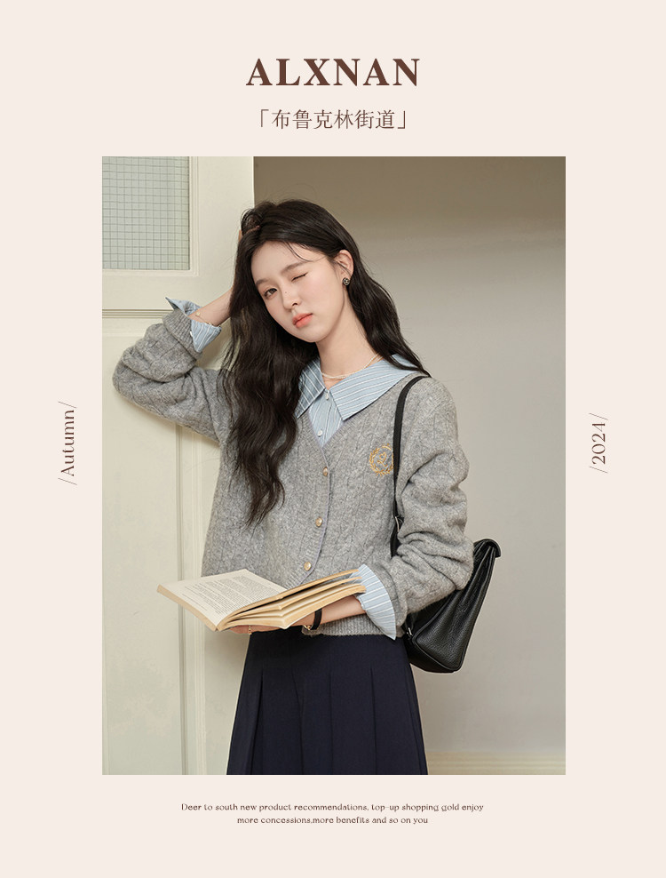 鹿向南「布鲁克林街道」学院风灰色毛针织开衫秋冬新款外搭上衣女