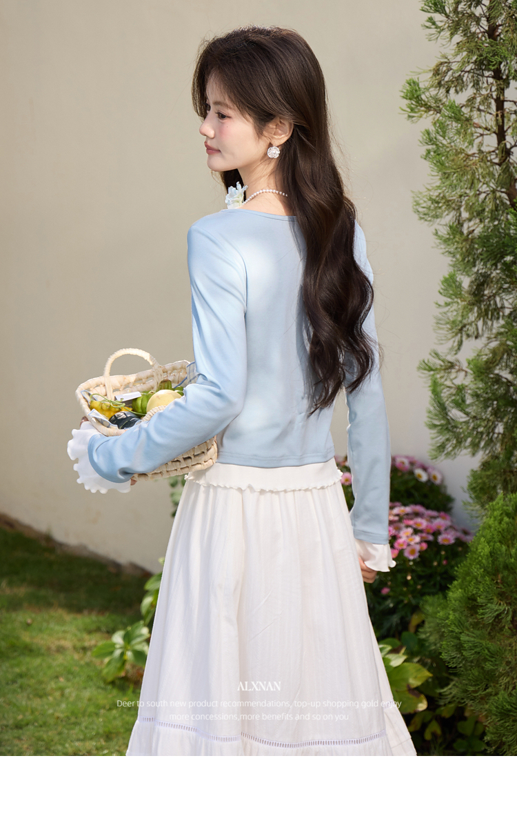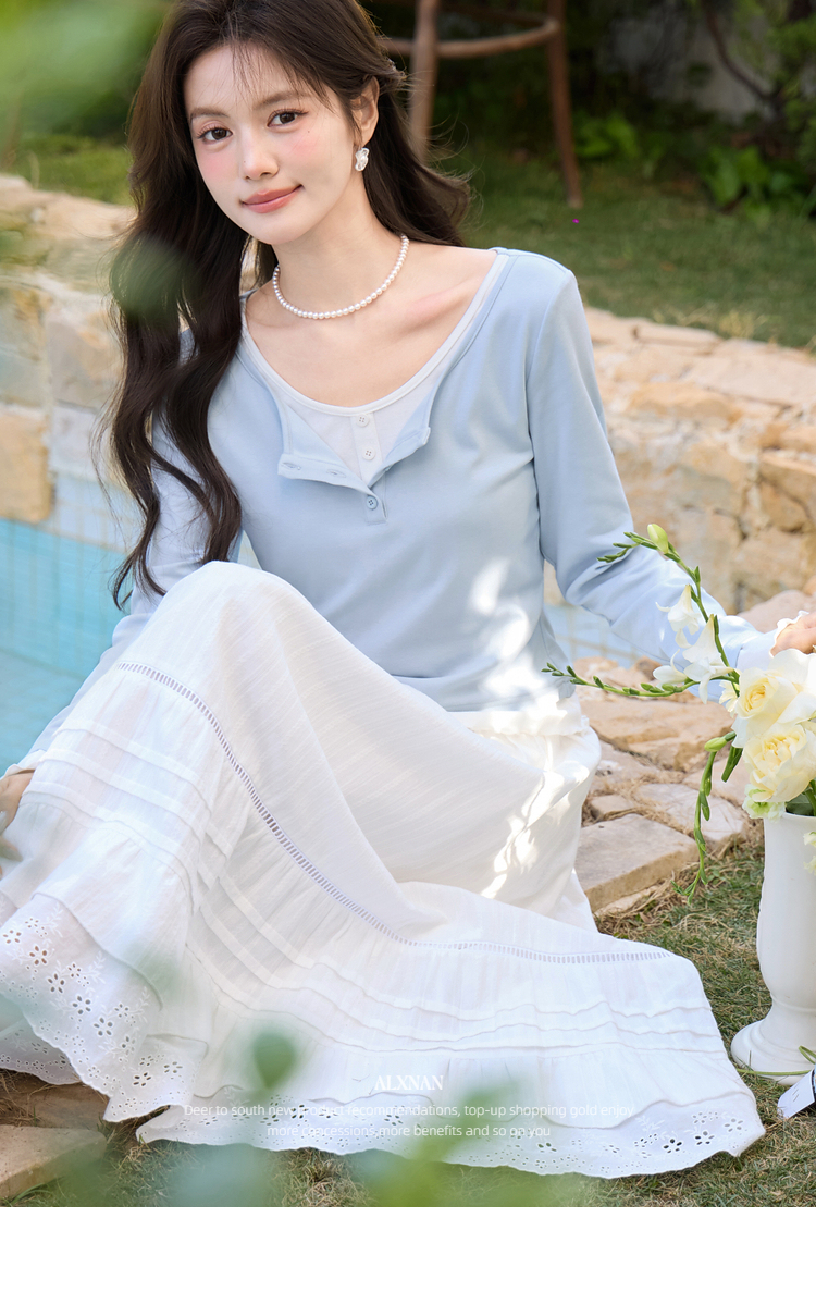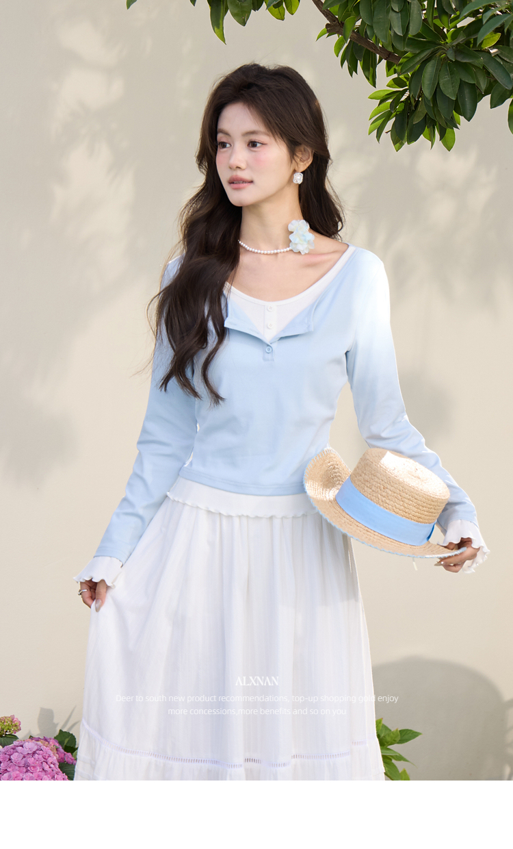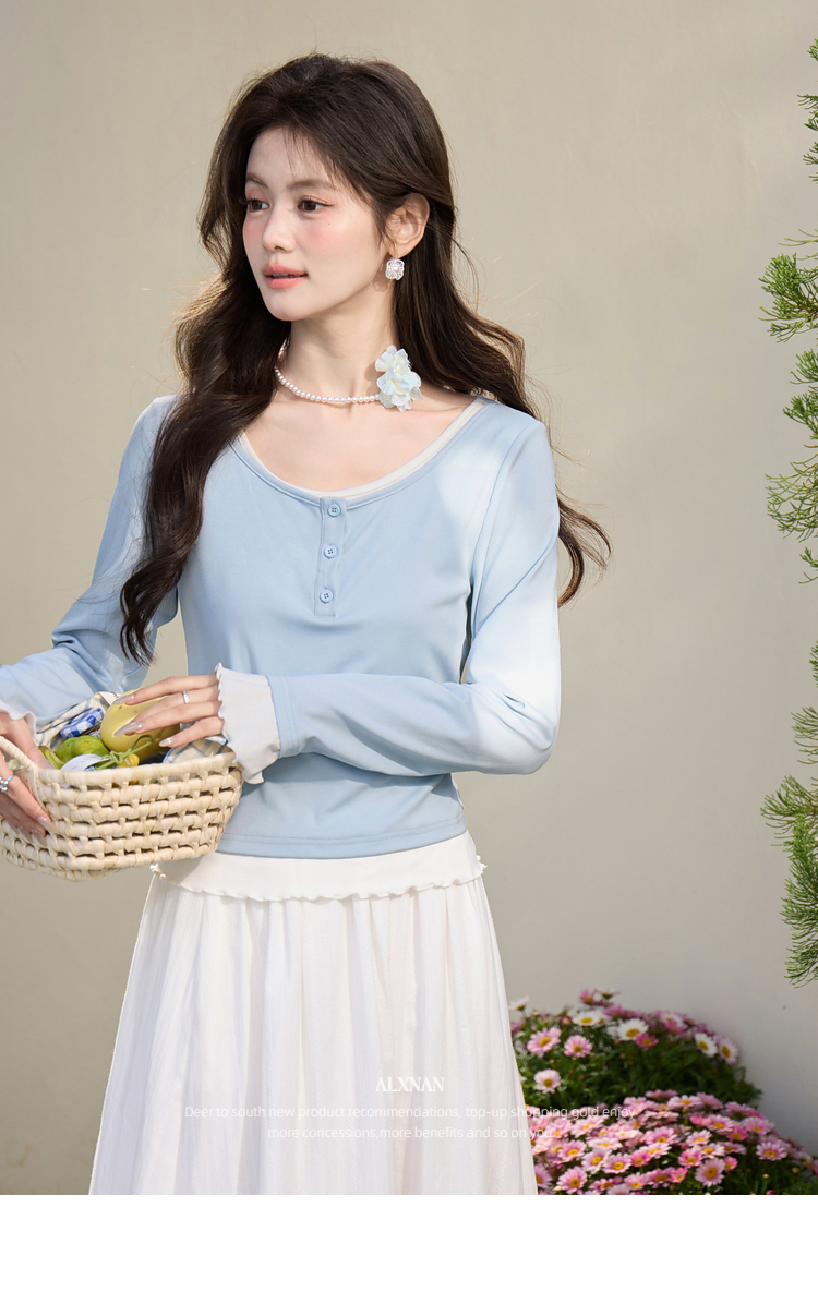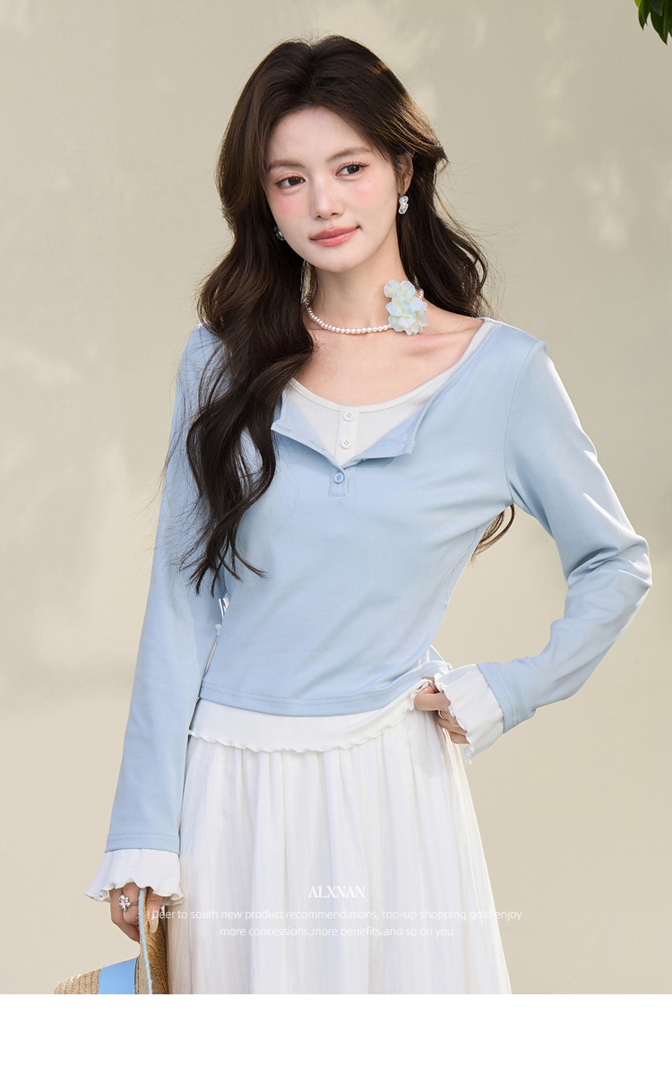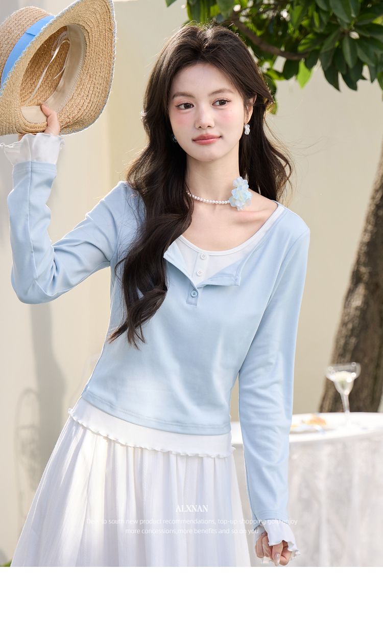 鹿向南「海盐手账」蓝白拼接设计感假两件T恤女春季减龄长袖上衣