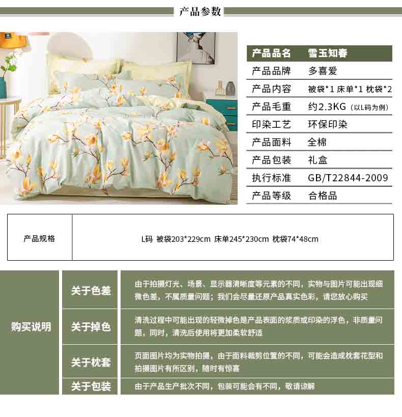 多喜爱 全棉四件套雪玉知春 203x229cm