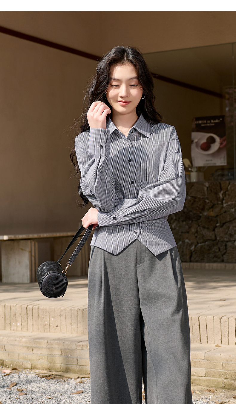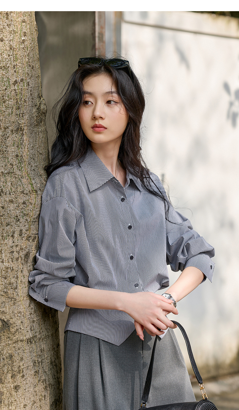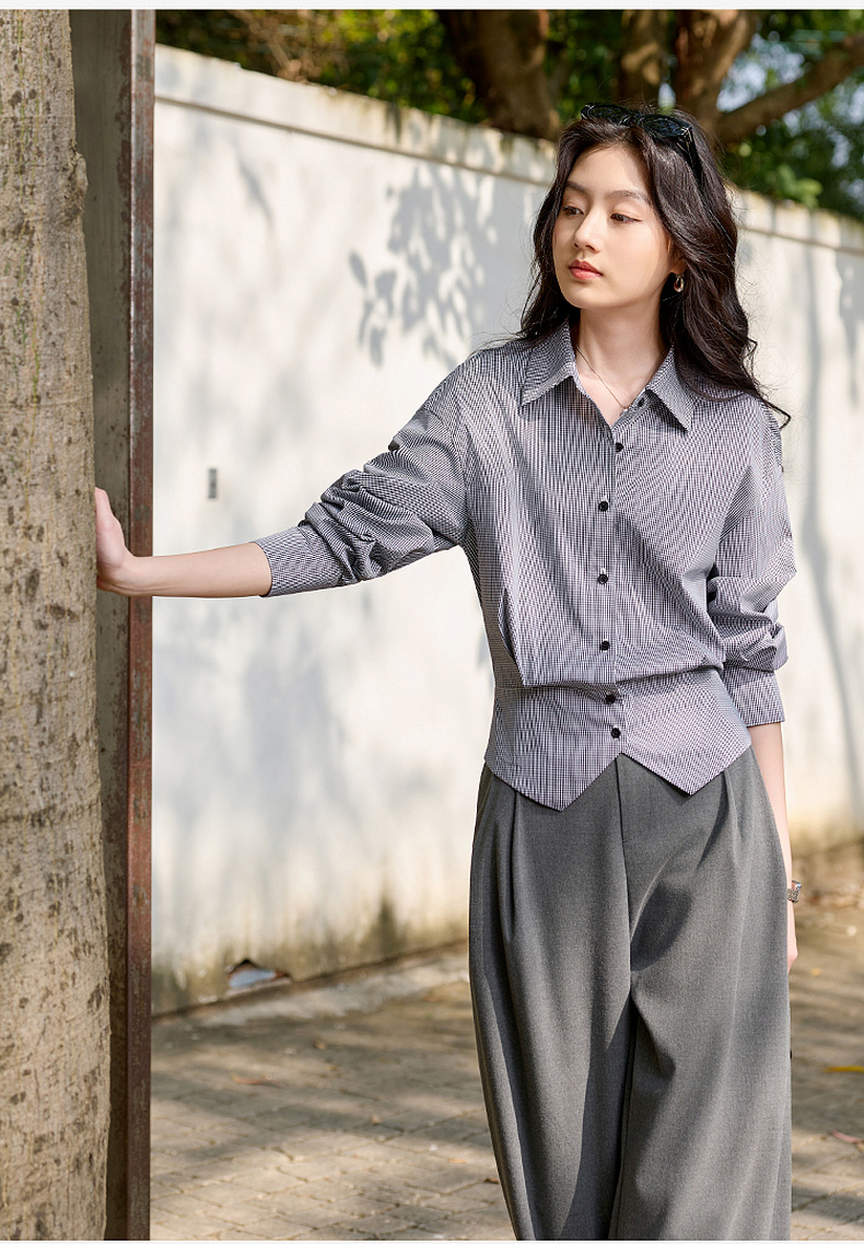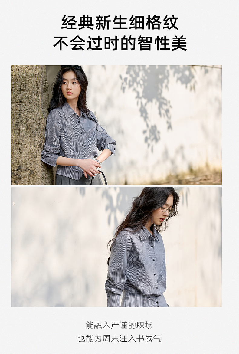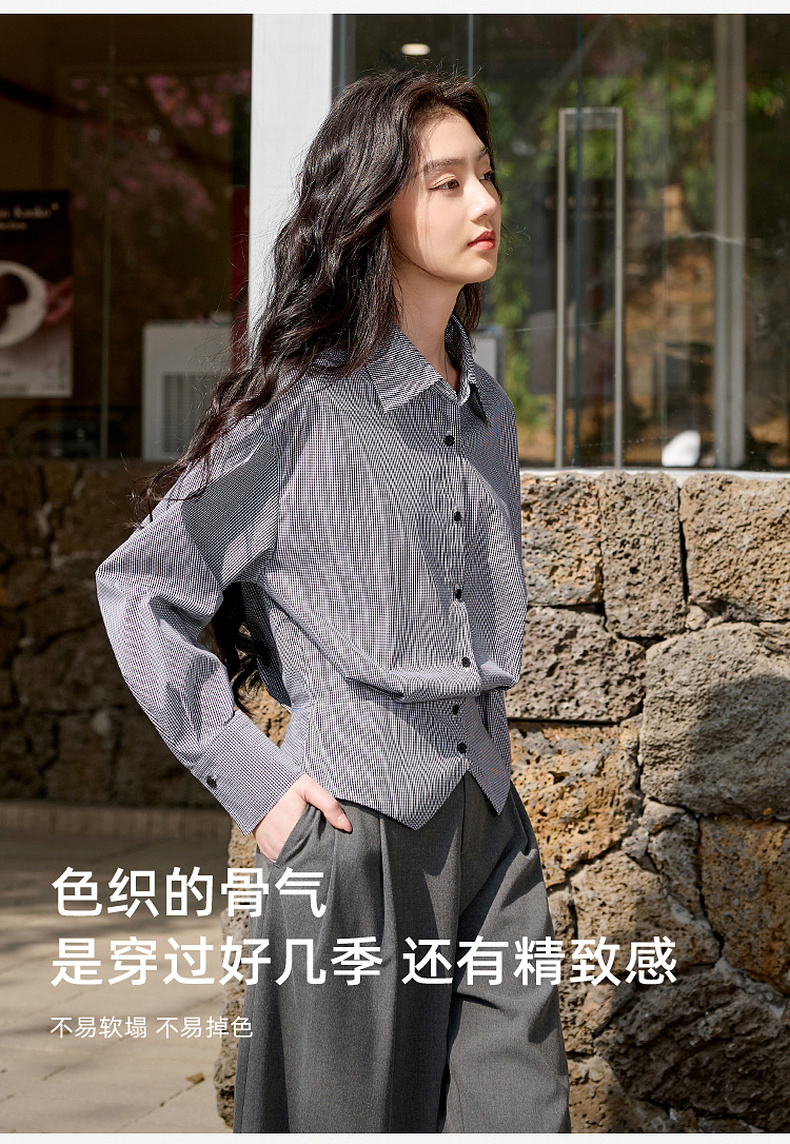 三彩2026春季新款长袖翻领格纹衬衫复古衬衣气质上衣收腰显瘦S