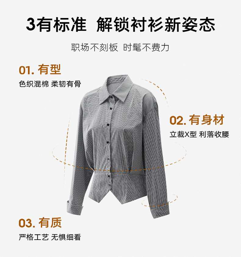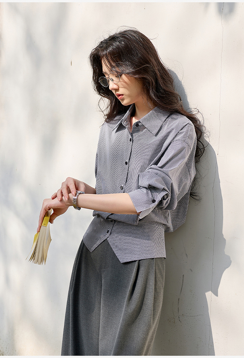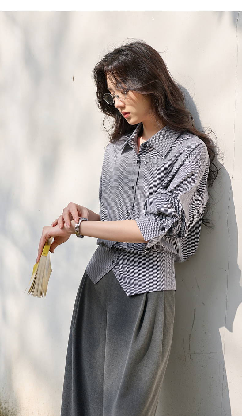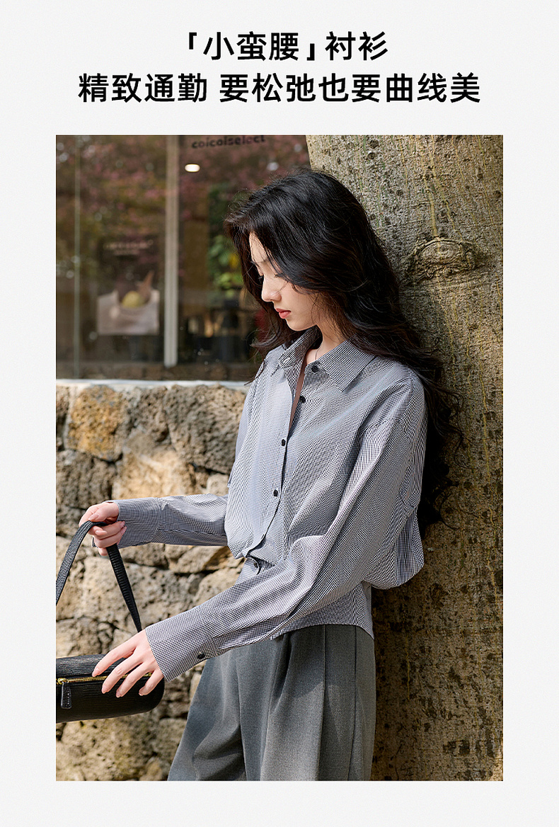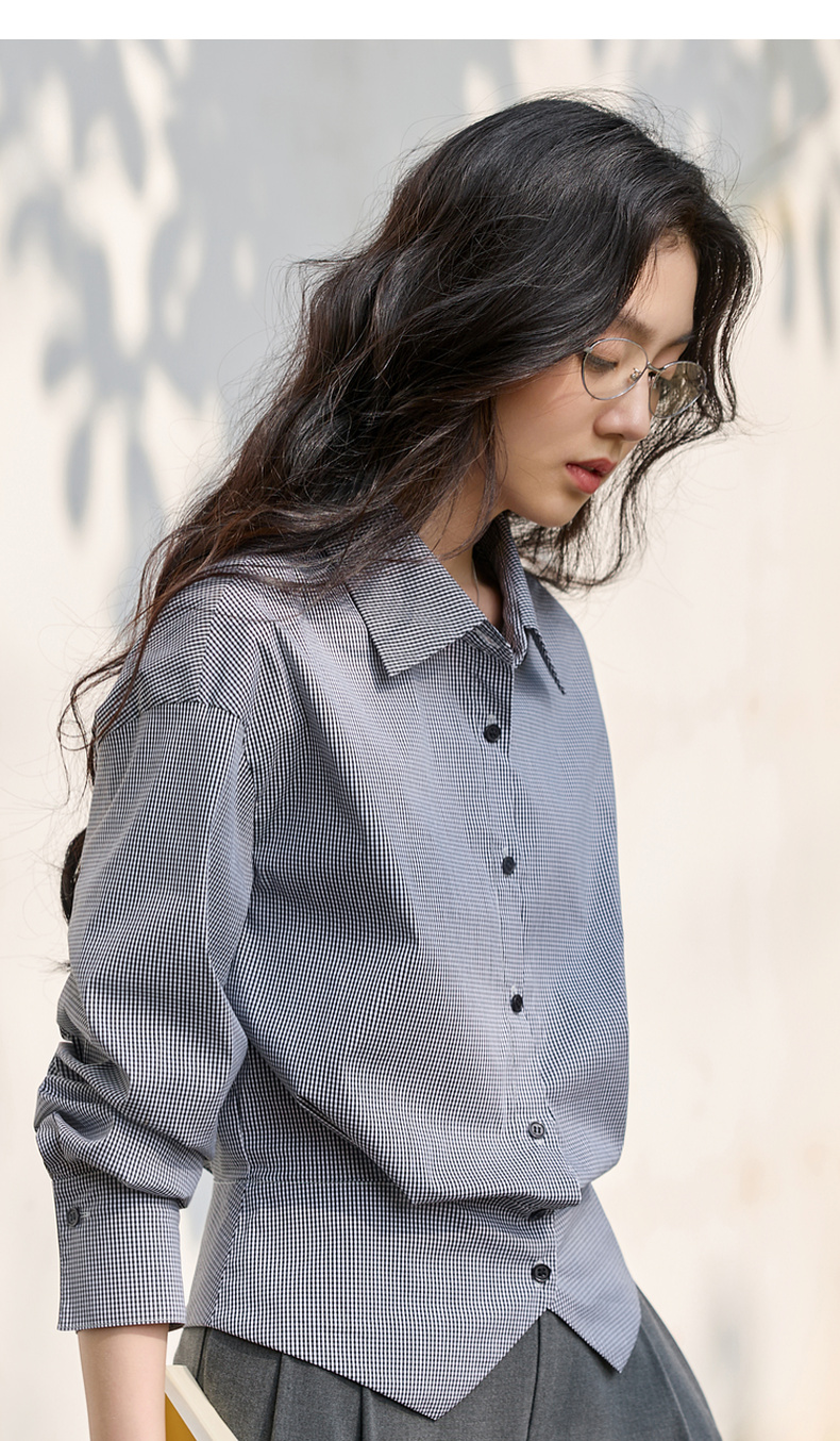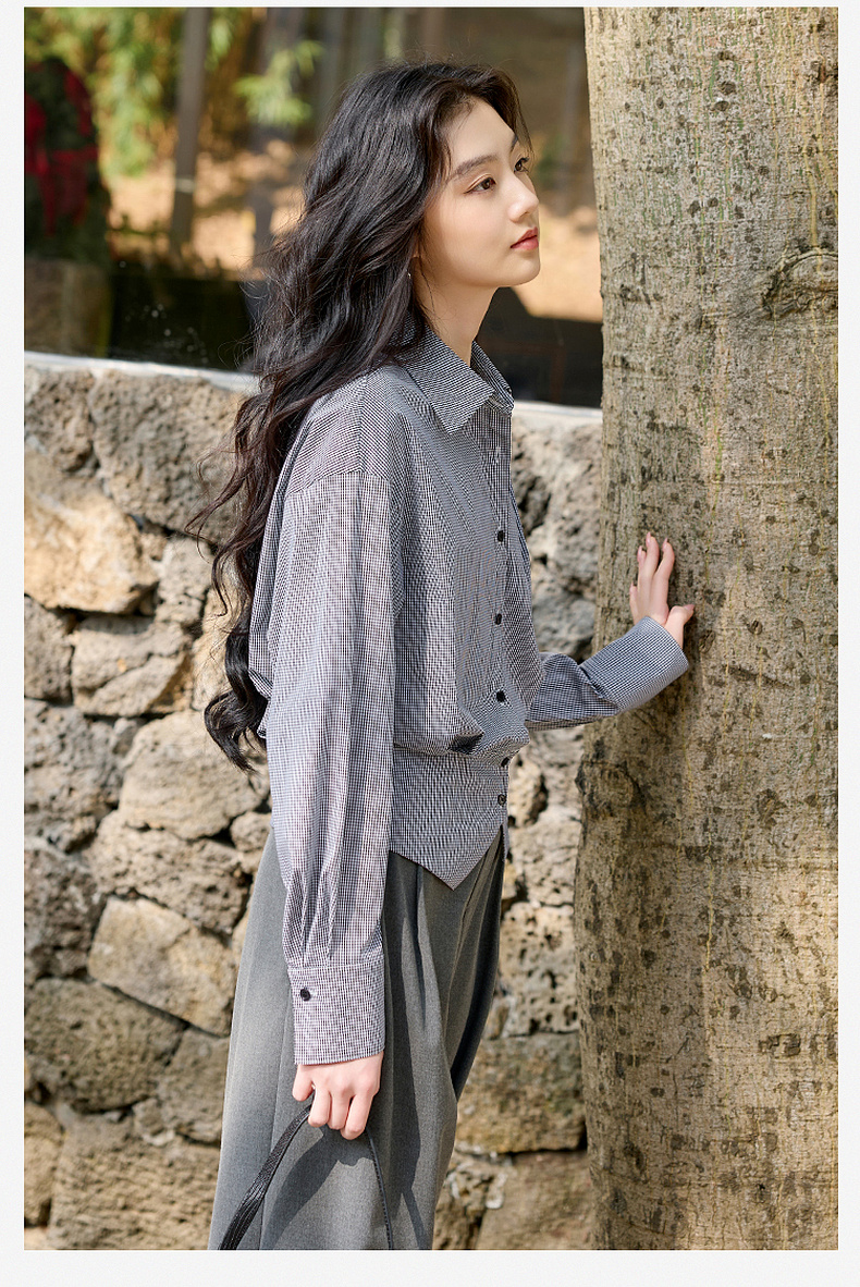 三彩2026春季新款长袖翻领格纹衬衫复古衬衣气质上衣收腰显瘦S