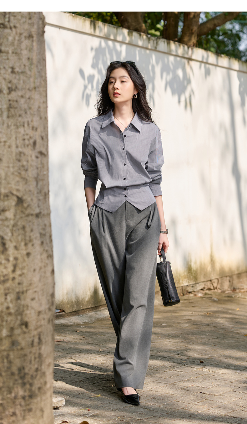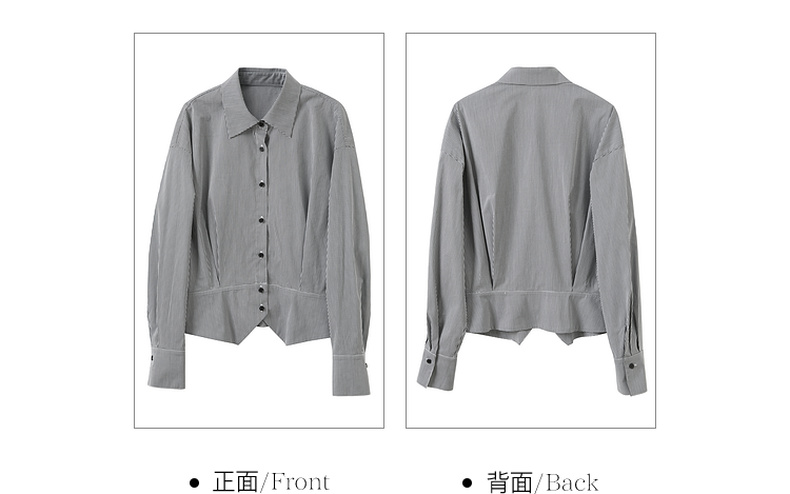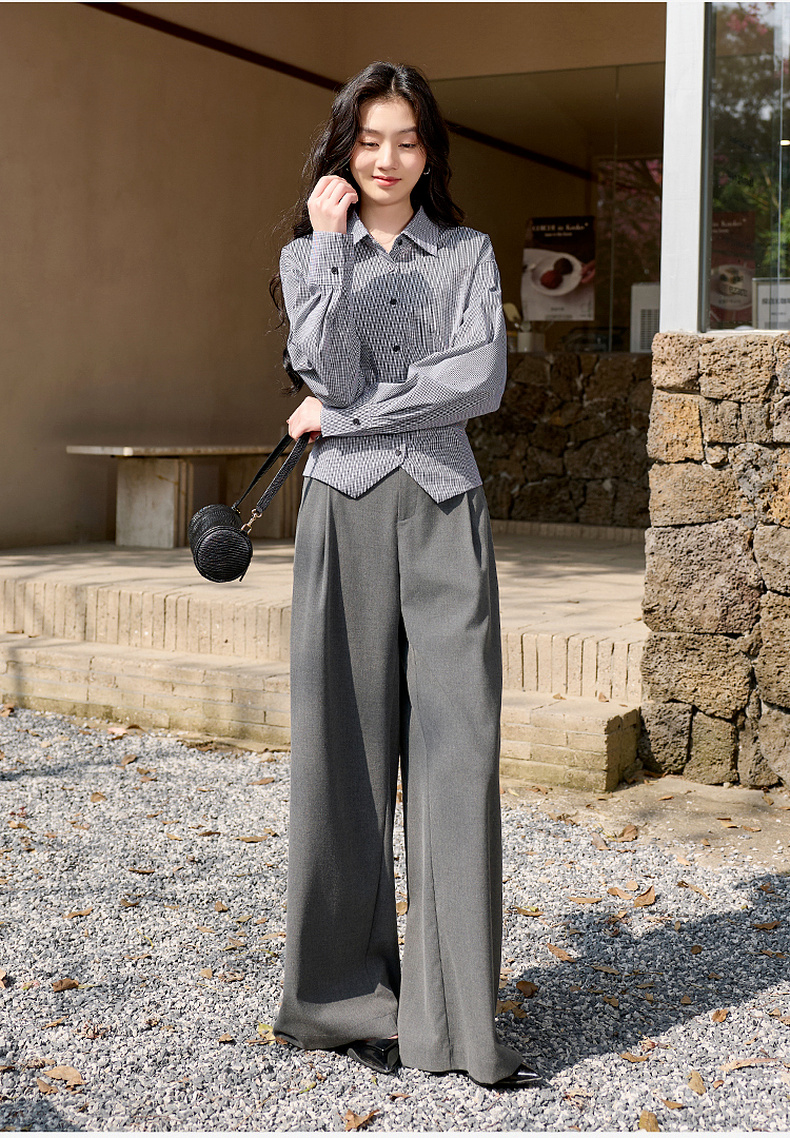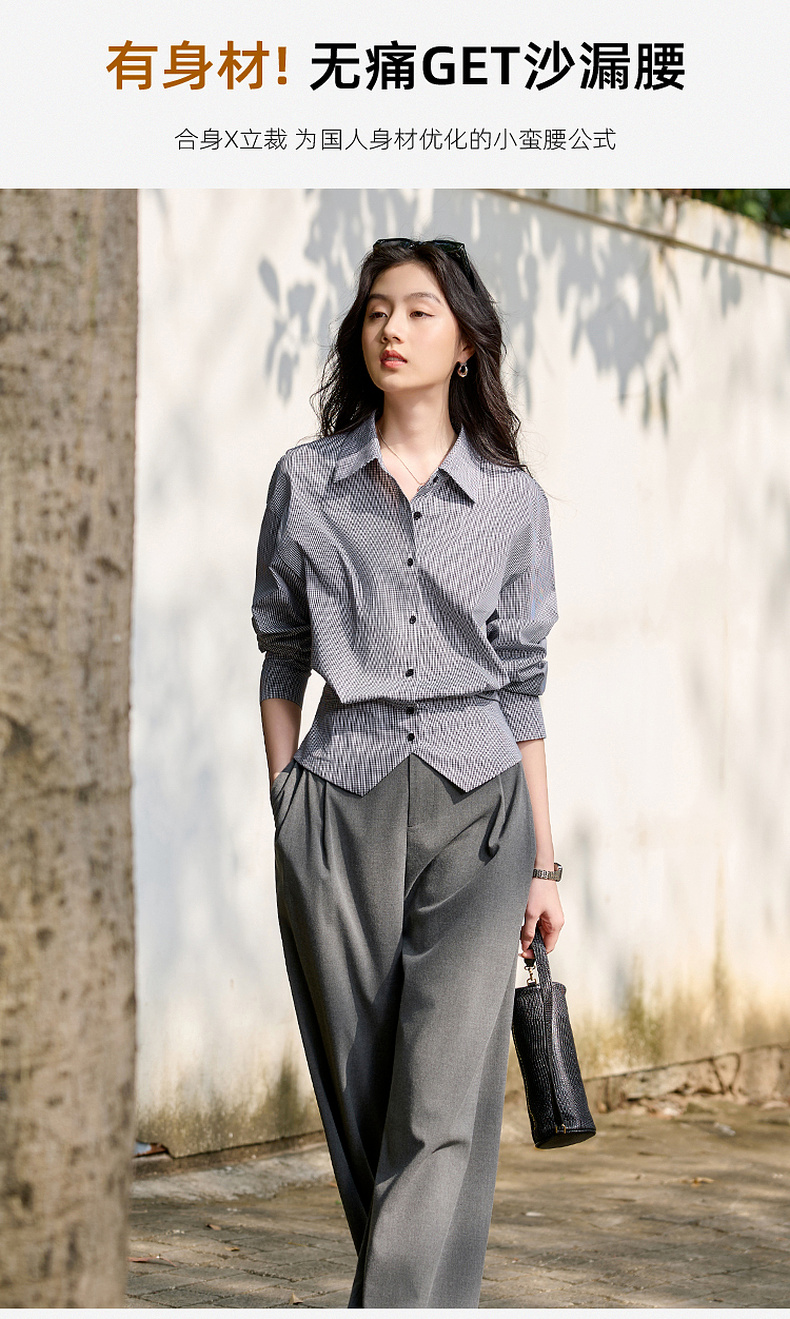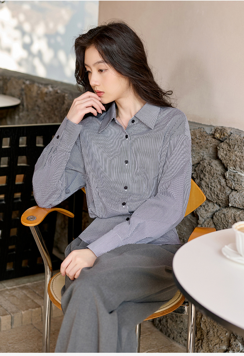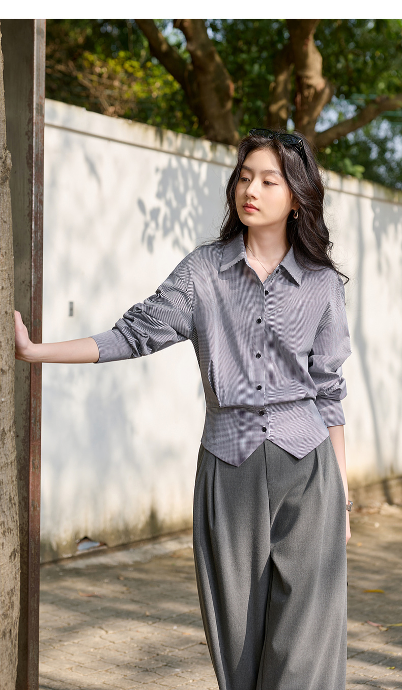三彩2026春季新款长袖翻领格纹衬衫复古衬衣气质上衣收腰显瘦S