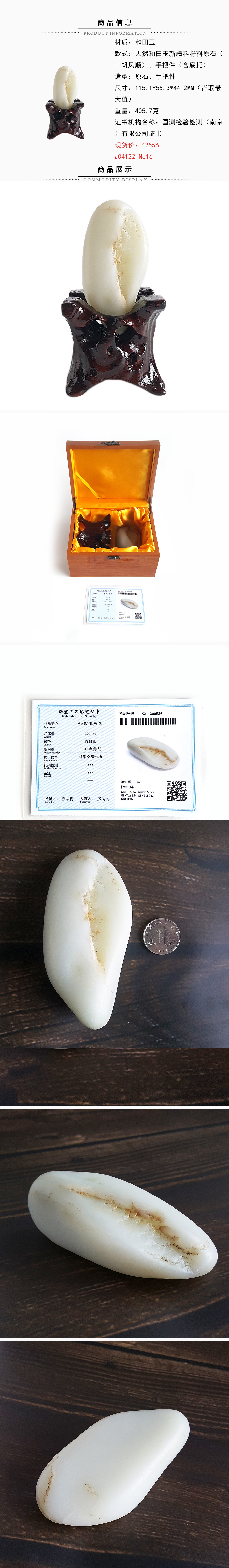 【天然正品】天然和田玉新疆料籽料原石一帆风顺手把件含底托、证书 041221NJ16 现售价:18800