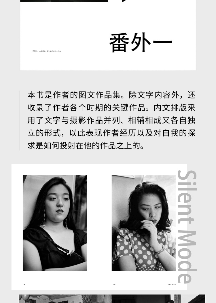 ※内文排版采用了文字与摄影作品并列、相辅相成又各自独立的形式,以此表现作者经历以及对自我的探求是如何投射在他的作品之上的。