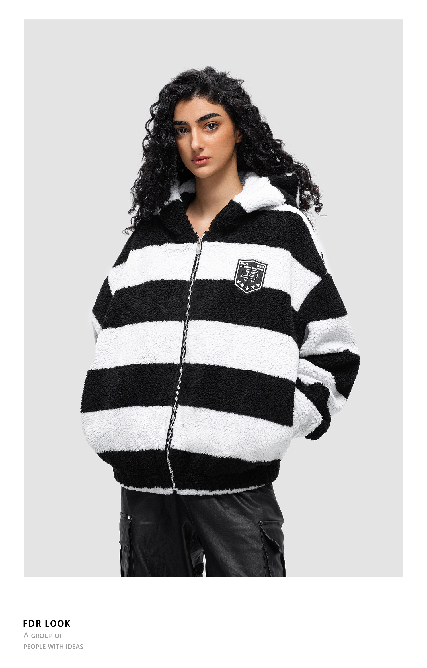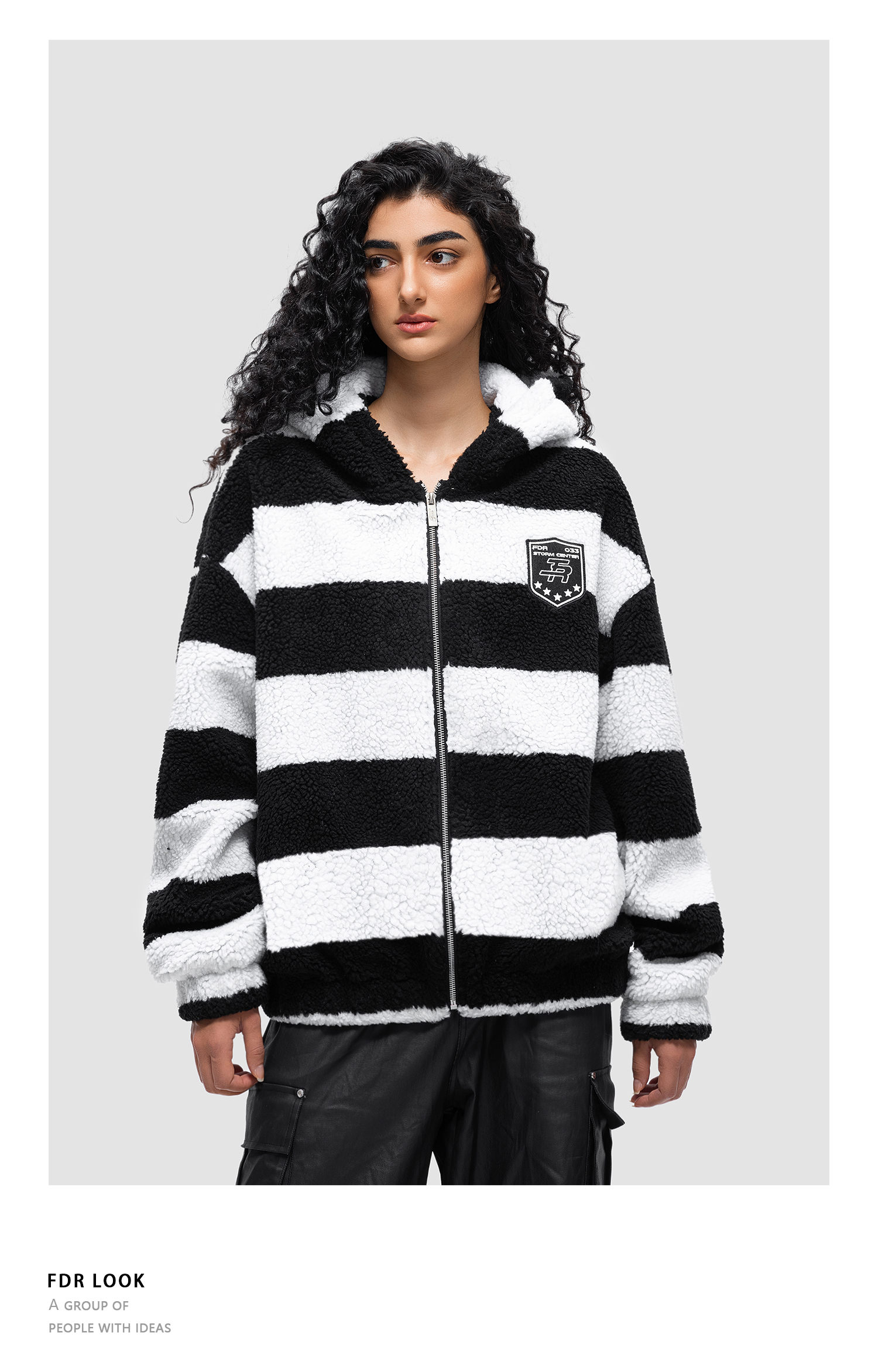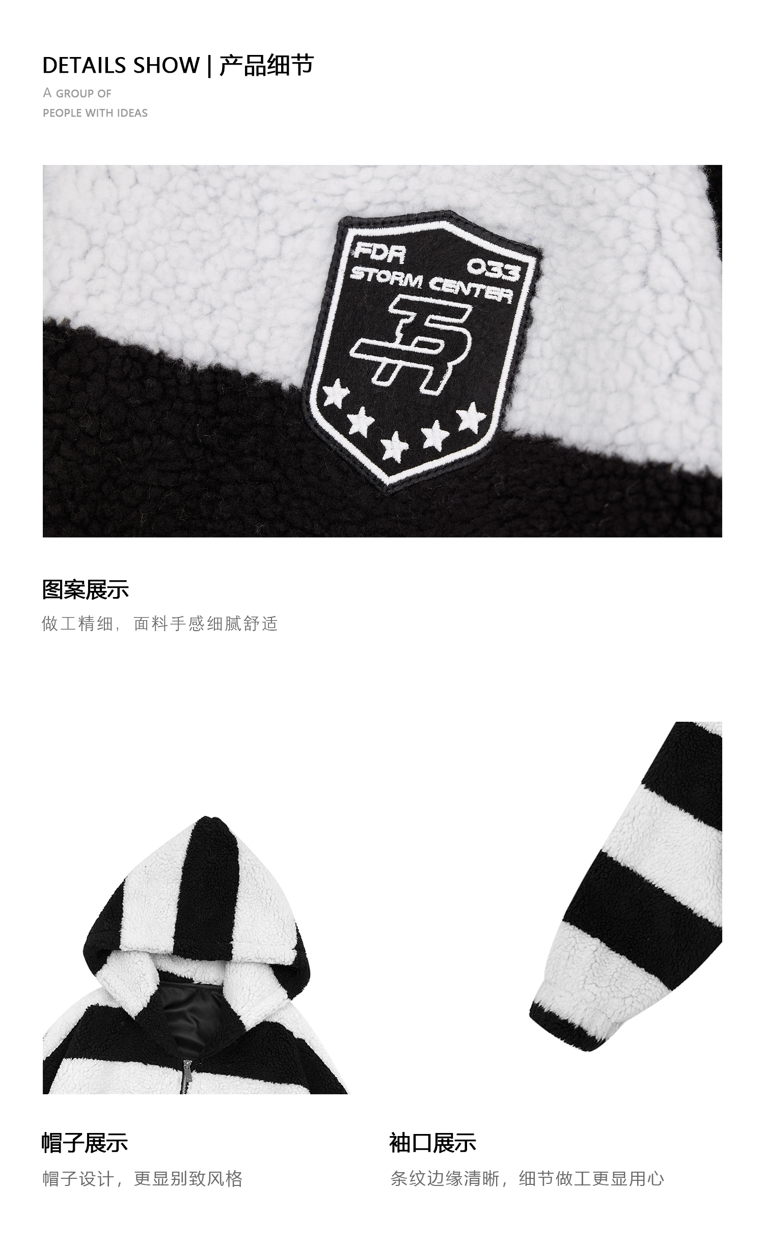 FDR 国潮美式条纹羊羔毛连帽外套男女秋冬季加厚潮牌情侣宽松